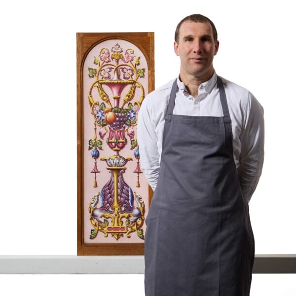 Antique Etched & Painted Floral Glass Window in Oak Frame