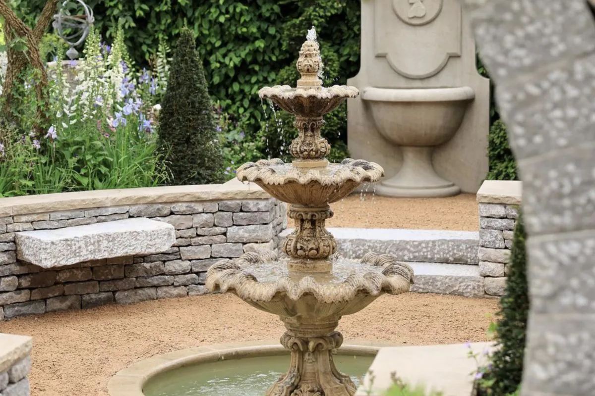 The ornate water feature that stood pride of place in the centre of the garden is a weathered three tier composition stone garden fountain sourced from us at UK Architectural Heritage Ltd.