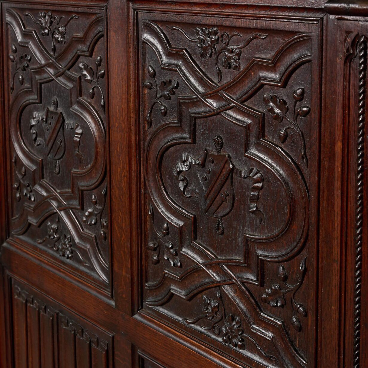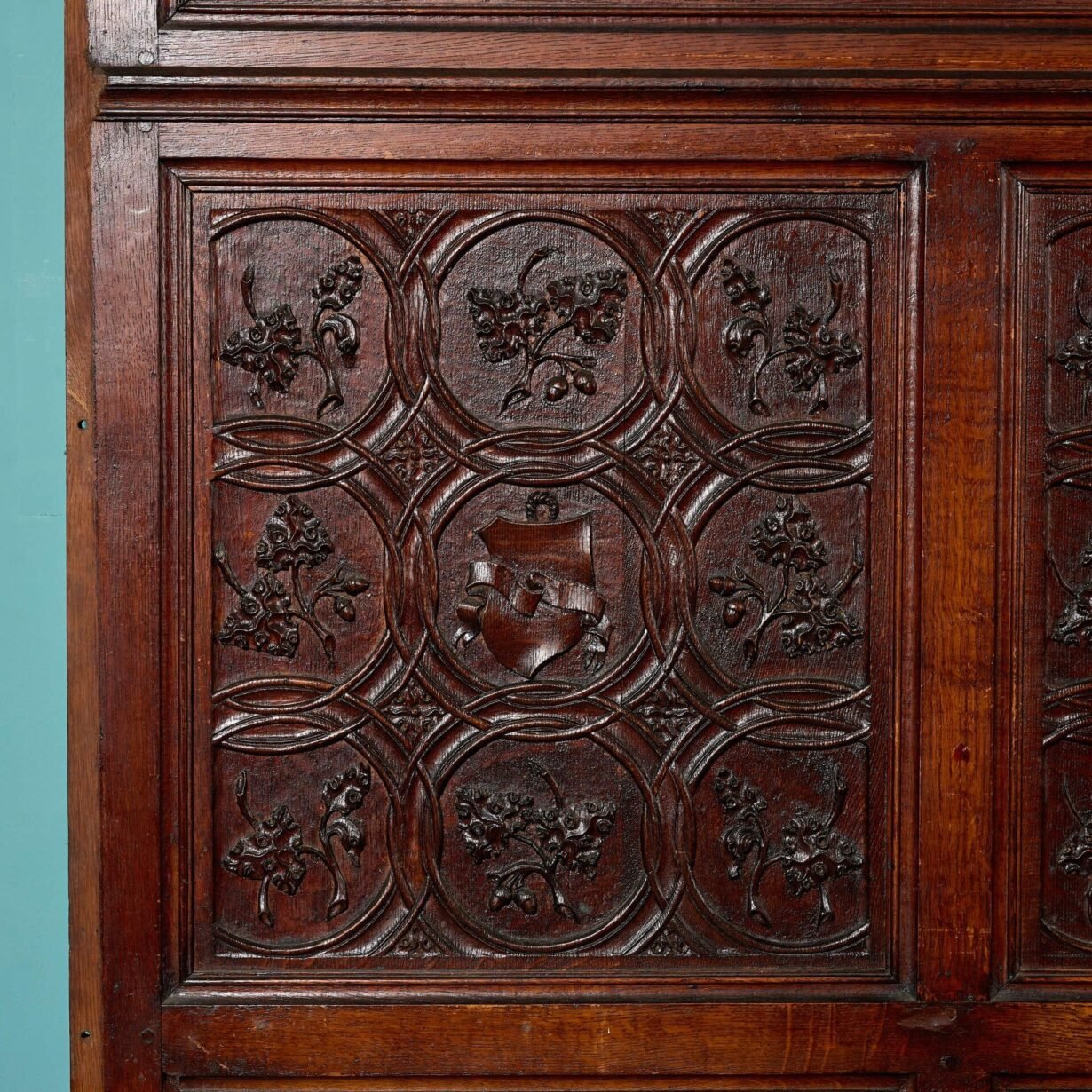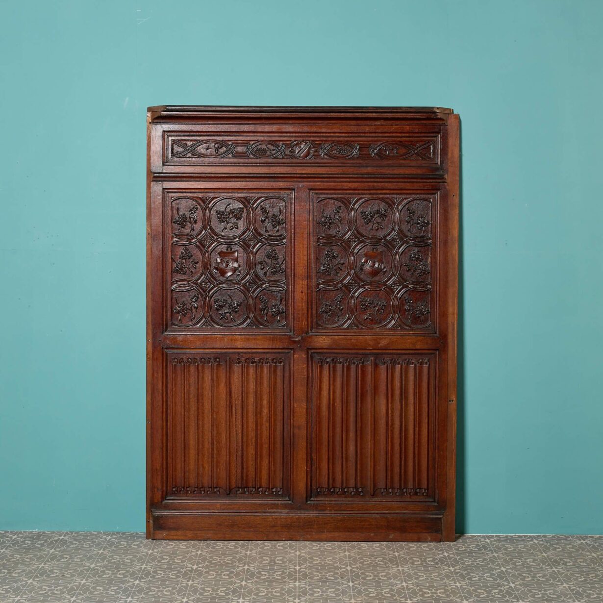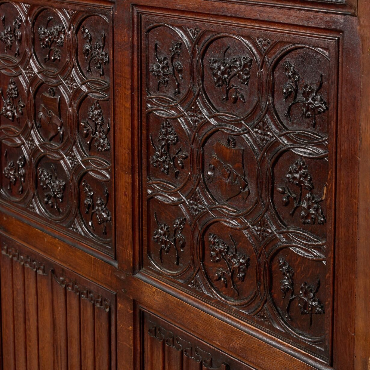 Standing at ¾ height, this reclaimed wall panelling comprises of 20 solid oak wall panels of varying widths (see below for individual details). The panels are exquisitely decorated with carvings that each vary slightly to include shields, coats of arms, oak leaves and roundels above elegant linenfold panels with cornice to the top and skirting to the base.