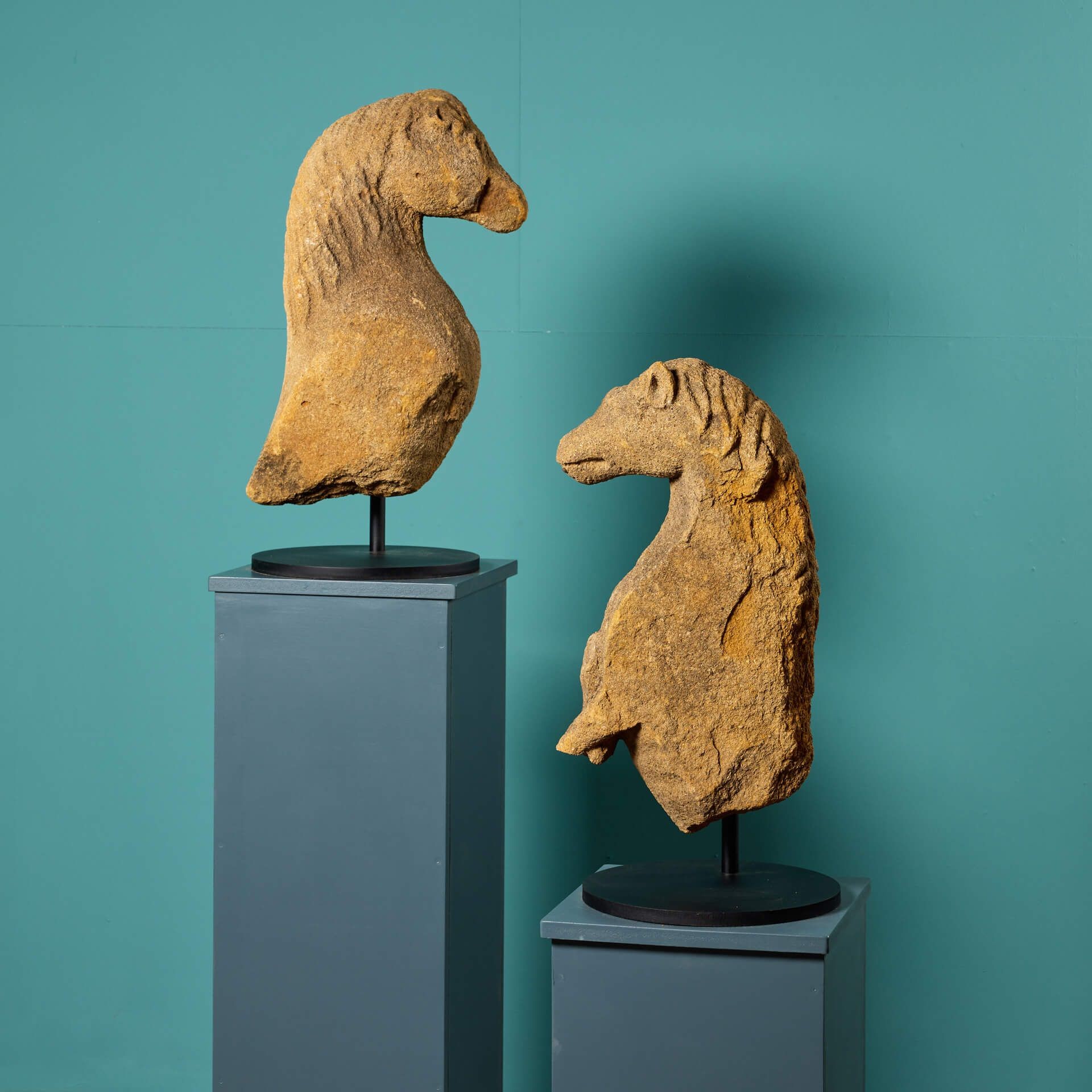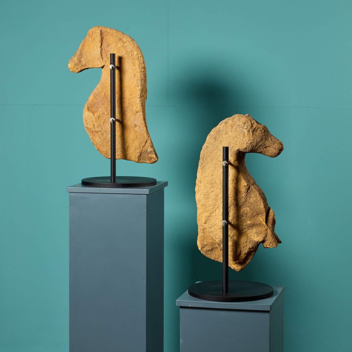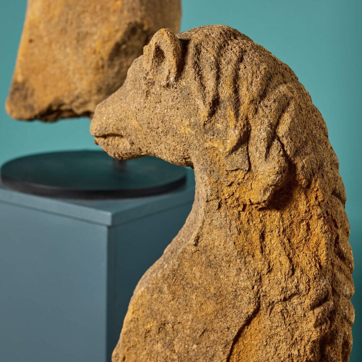 back to topDating from the 17th century, these English carved stone horse and unicorn statues are architectural fragments from history. Over 350 years old, they likely once served as decorative features of 17th century exterior architecture, now mounted onto contemporary metal stands for display. Though the unicorn horn has been lost over the centuries, both horse and unicorn remain intact, showcasing recognisable details in the warm honey coloured limestone.