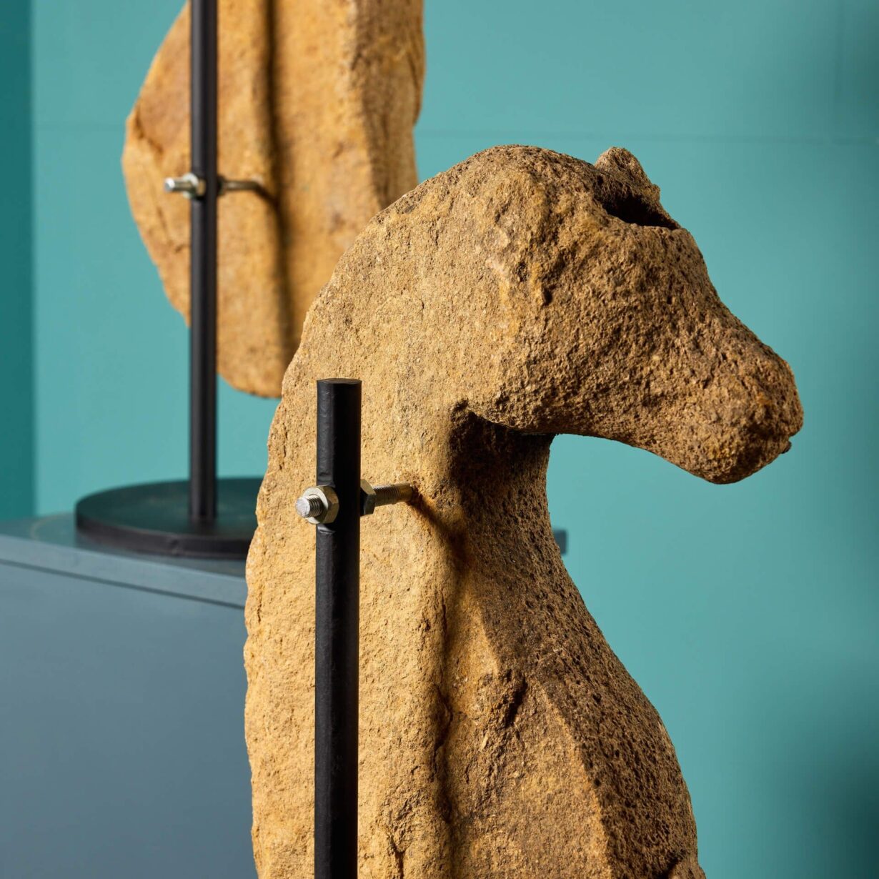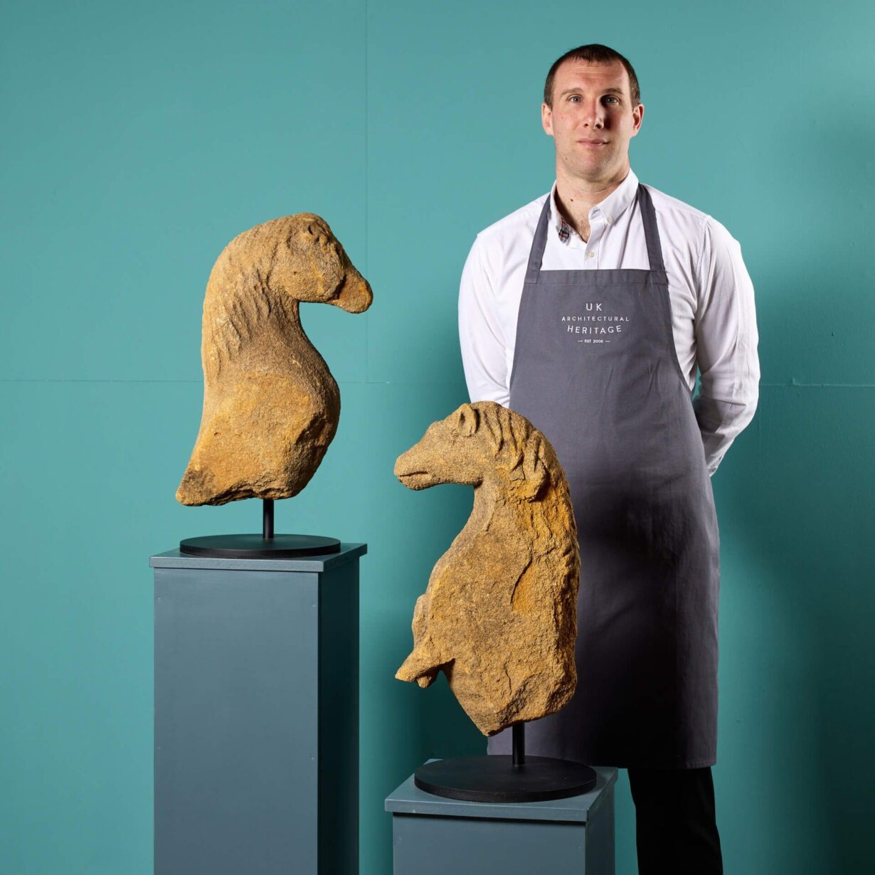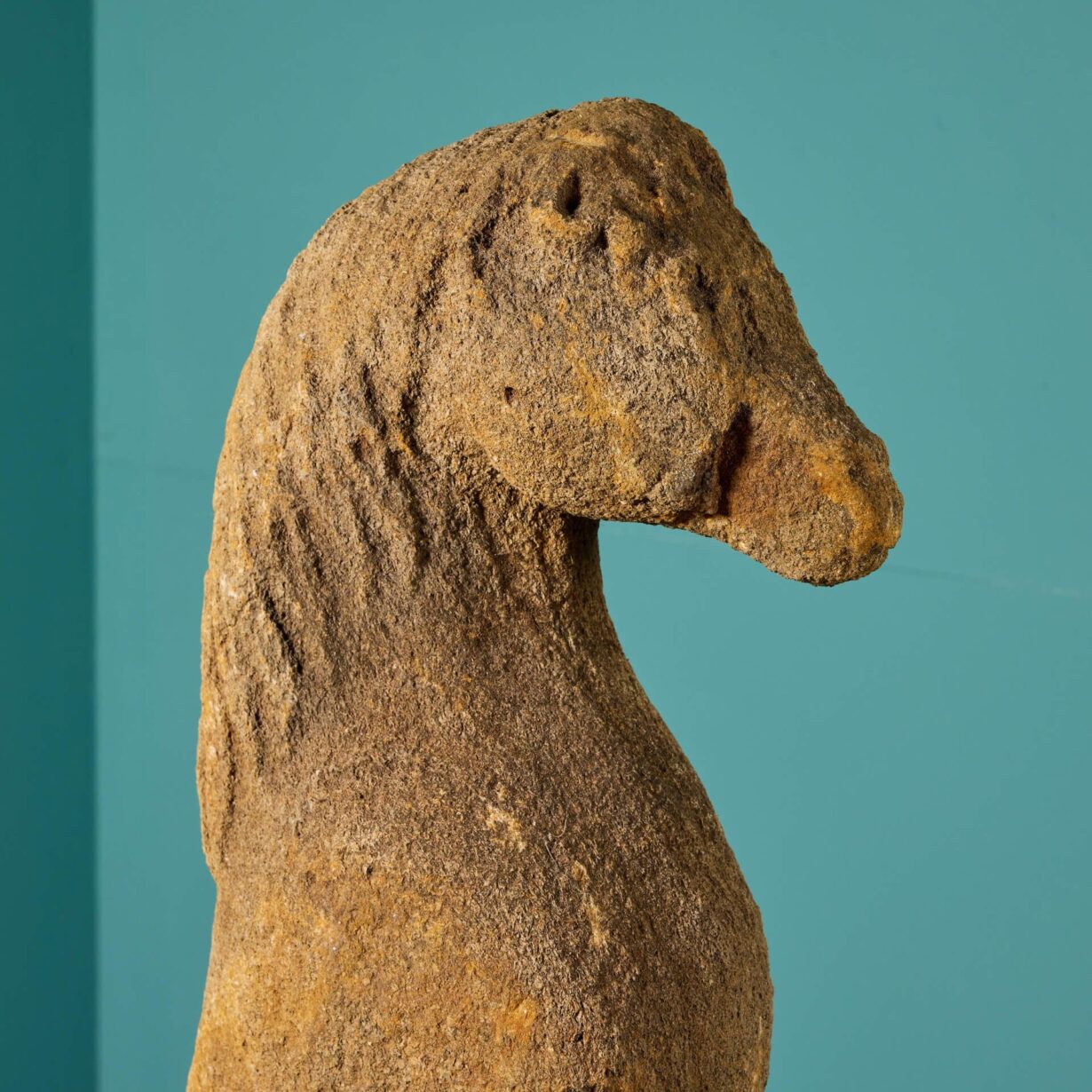 back to topDating from the 17th century, these English carved stone horse and unicorn statues are architectural fragments from history. Over 350 years old, they likely once served as decorative features of 17th century exterior architecture, now mounted onto contemporary metal stands for display. Though the unicorn horn has been lost over the centuries, both horse and unicorn remain intact, showcasing recognisable details in the warm honey coloured limestone.