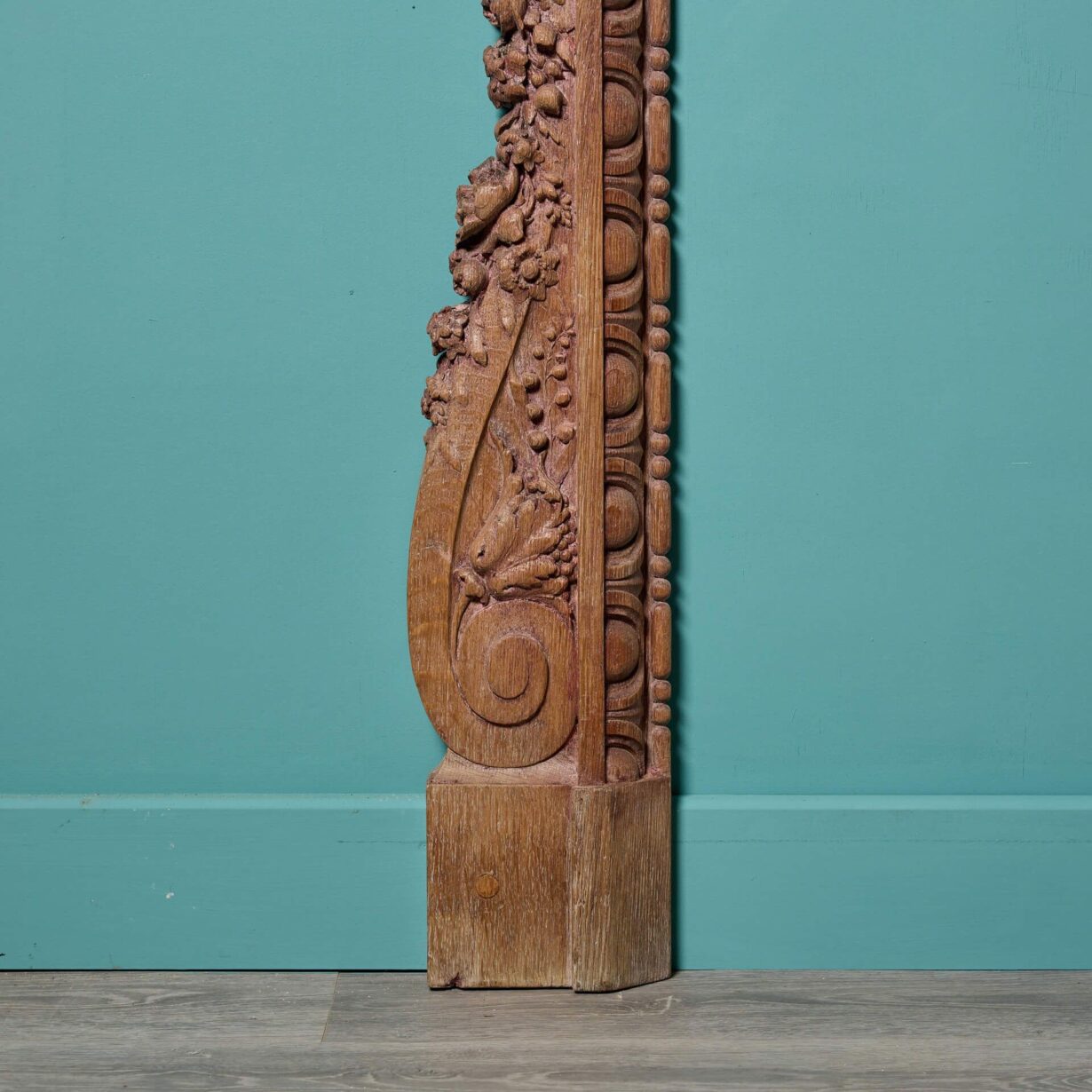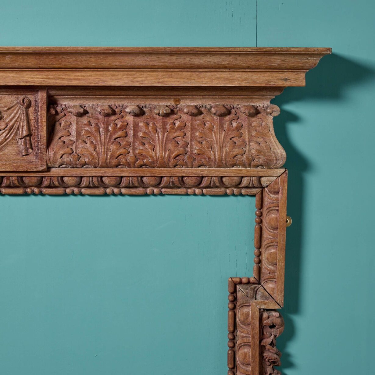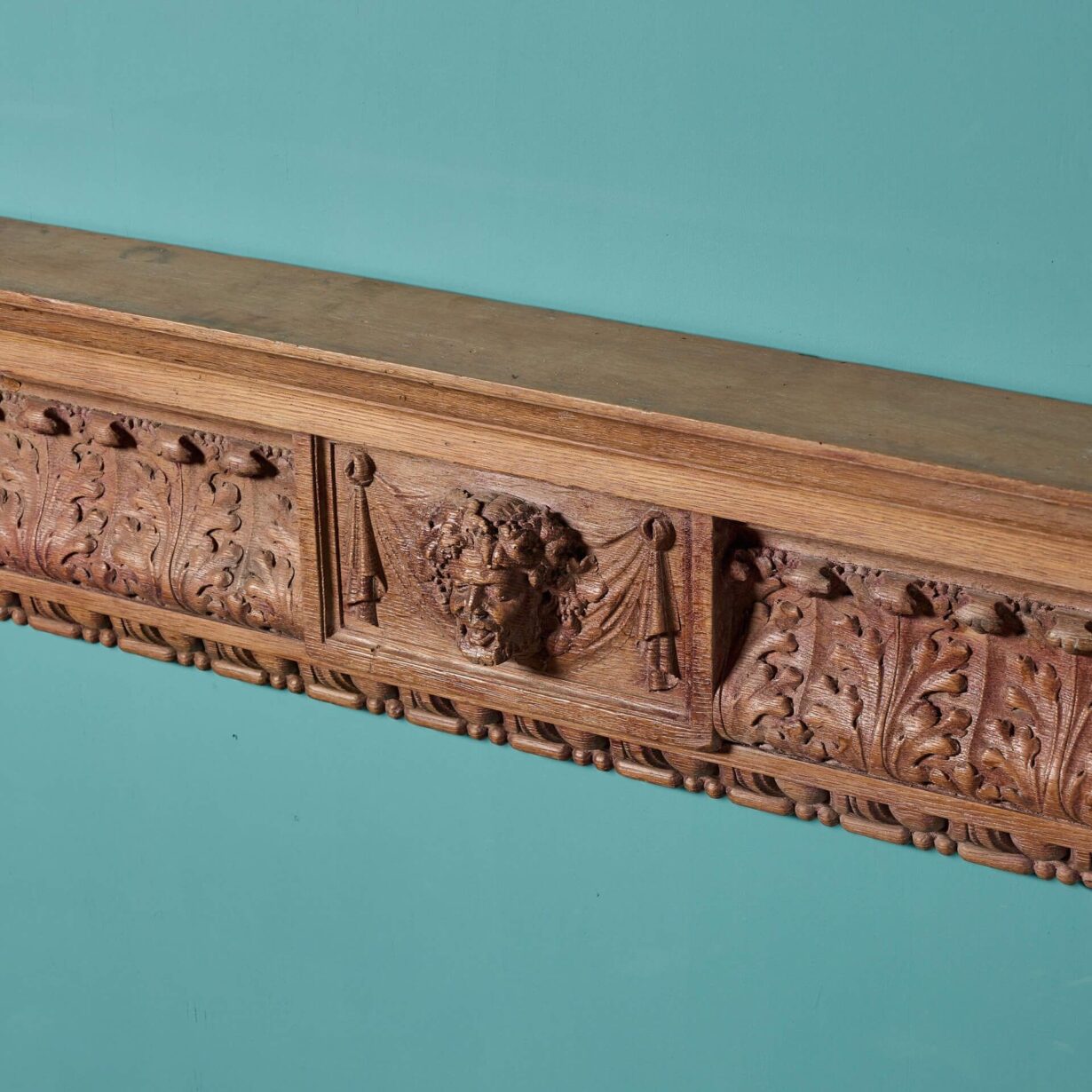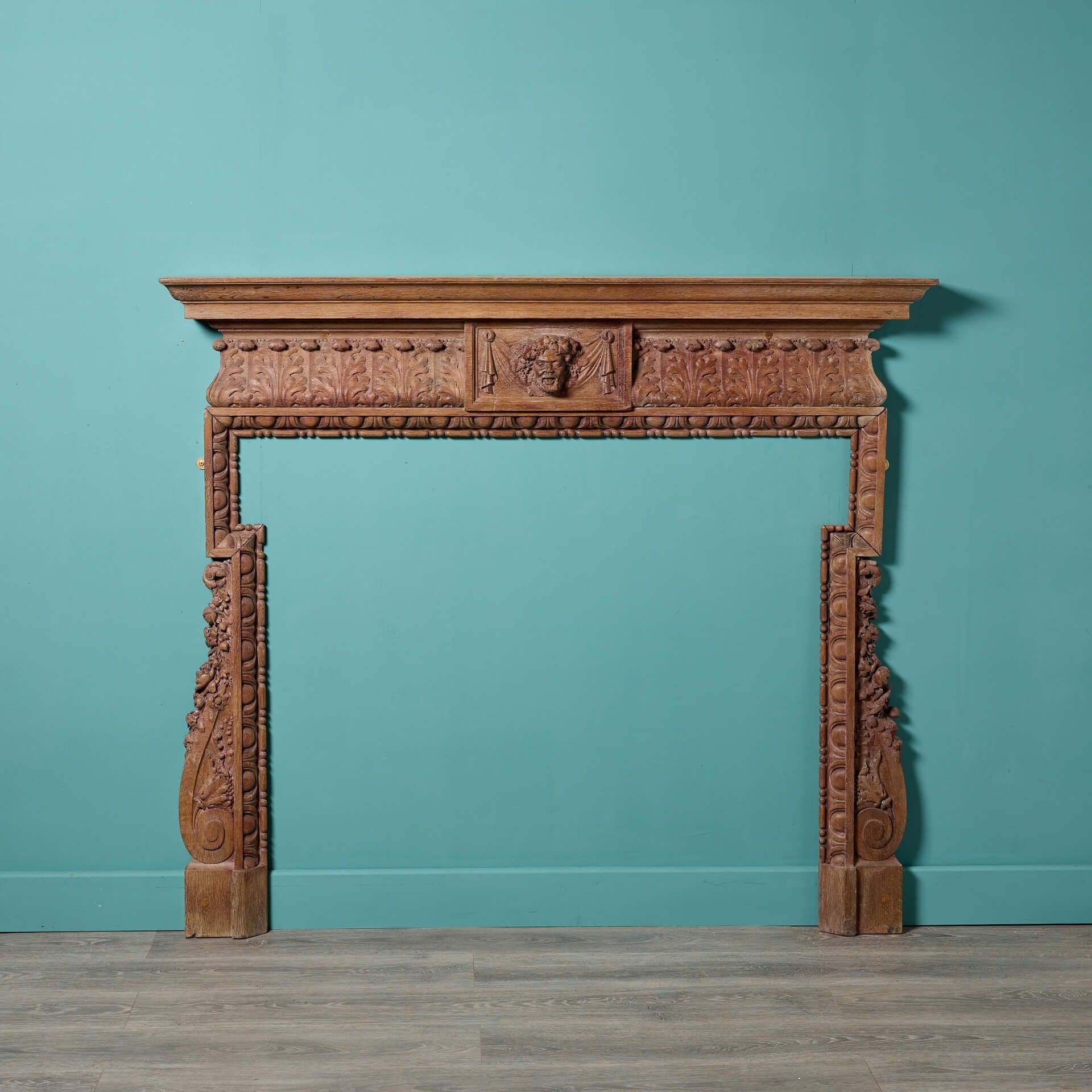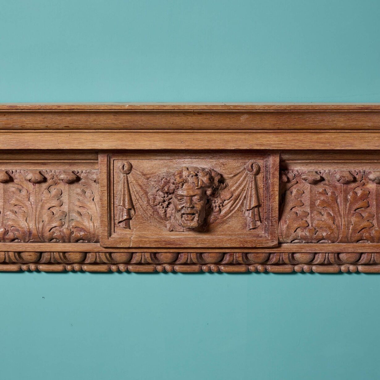 back to topA deeply carved, late 18th / early 19th century English oak Georgian era fireplace, circa 1800. Highly decorative, this antique fireplace is carved to the frieze tablet with the mask of Bacchus, the ancient Greco-Roman God of Wine and Festivity, with acanthus leaves to either side. Other decorative features of this surround include scrolling jambs and a dog leg opening lined with egg and dart carving and a reel and bead edge.