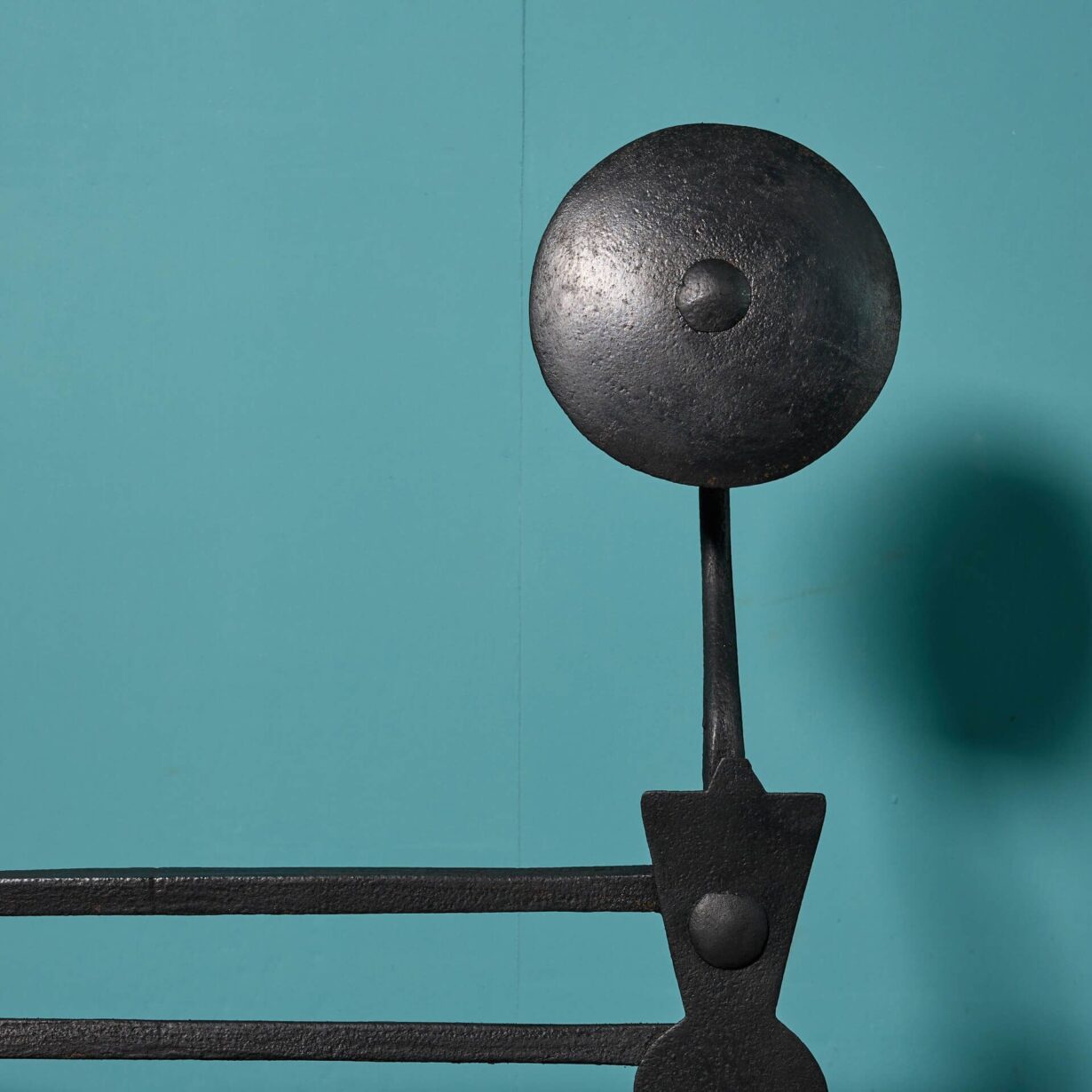 Finely crafted by a talented English blacksmith, this Georgian fire grate displays striking large rounded spheres standing tall to the top of each finial.