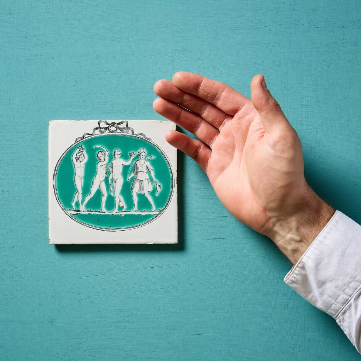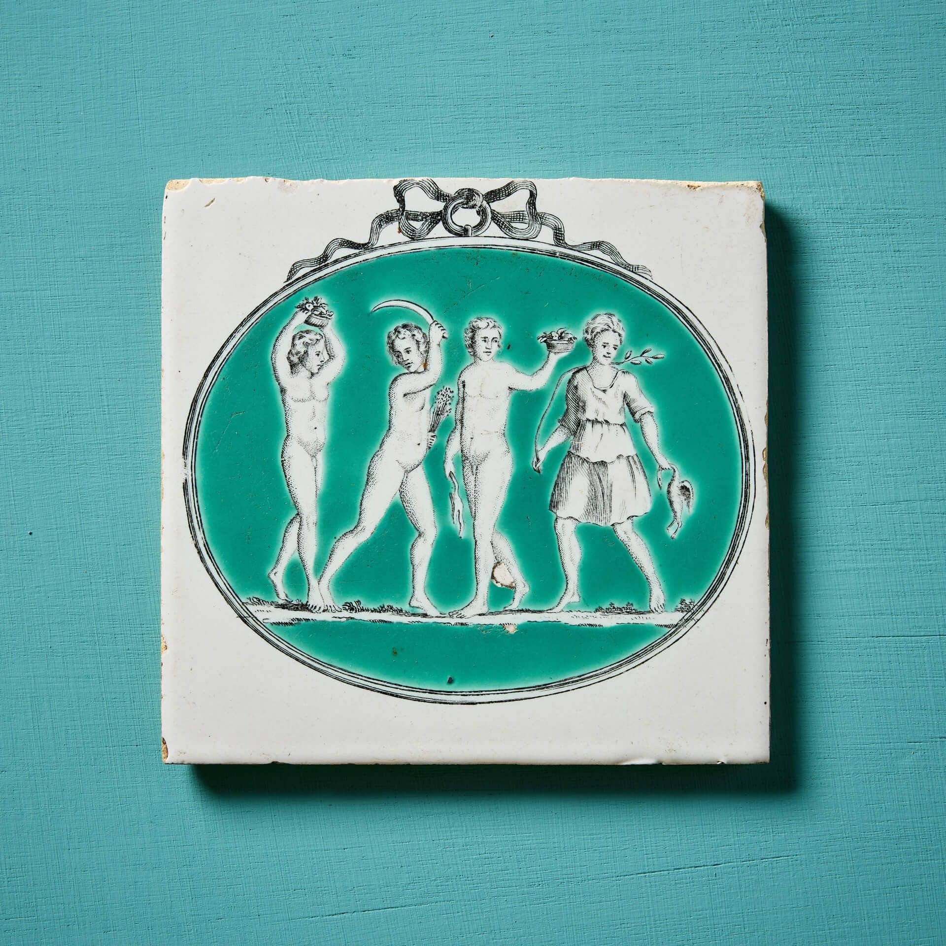 Dating to circa 1775-1780, this antique tile has stood the test of time, the neoclassical figures surrounded by a green glazed oval with ribbon to the top as if a pendant before a white glazed background. An excellent collector’s item!