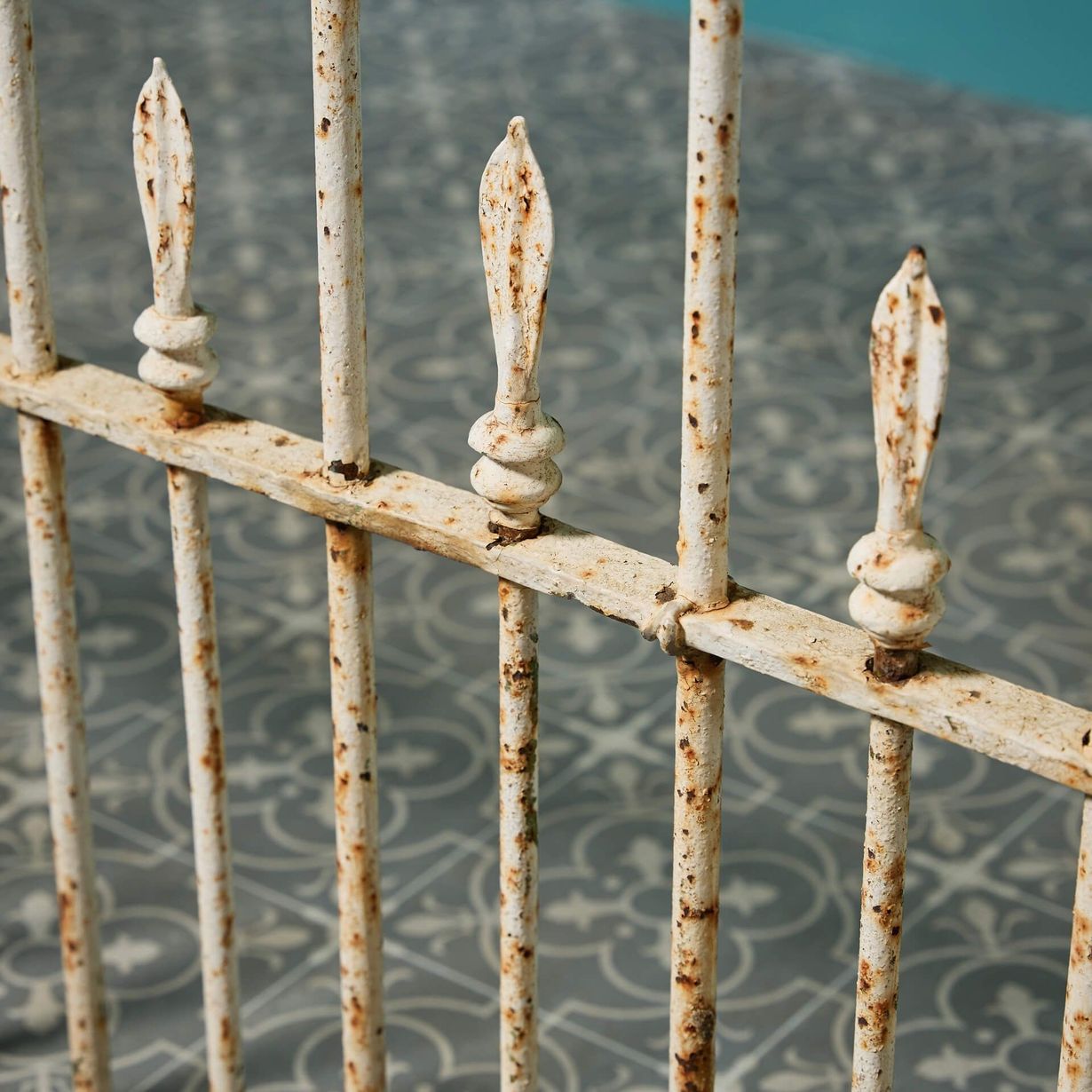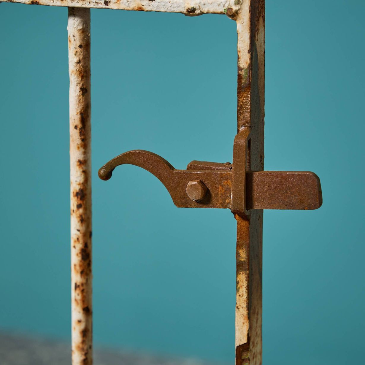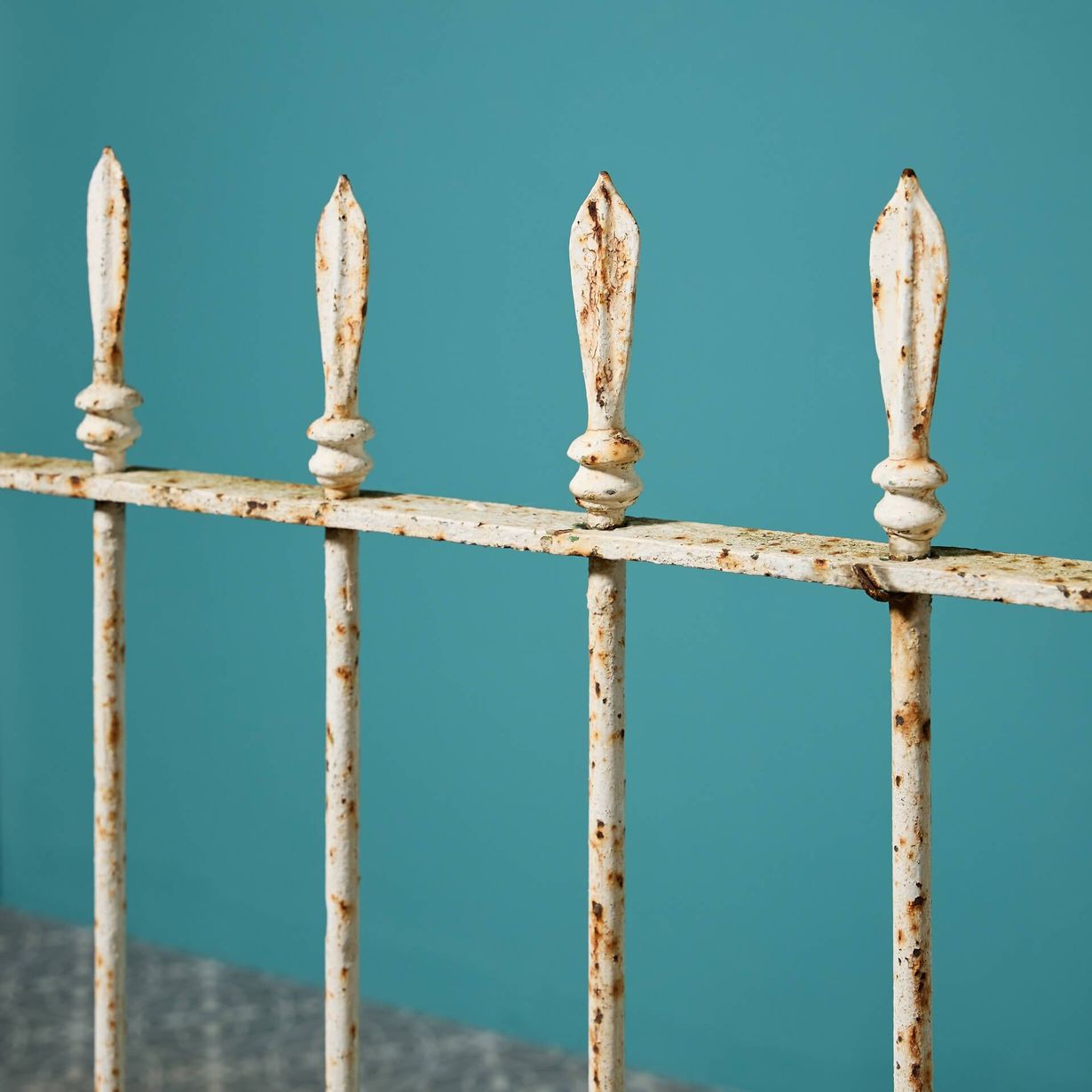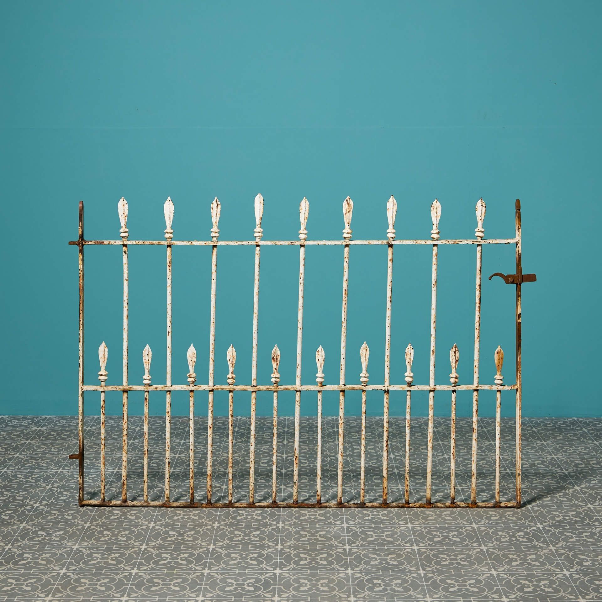 back to topA 19th century antique Georgian style pedestrian gate with a very wide opening. Dating back to circa 1850, the white paint has given way to present a rusted patina.