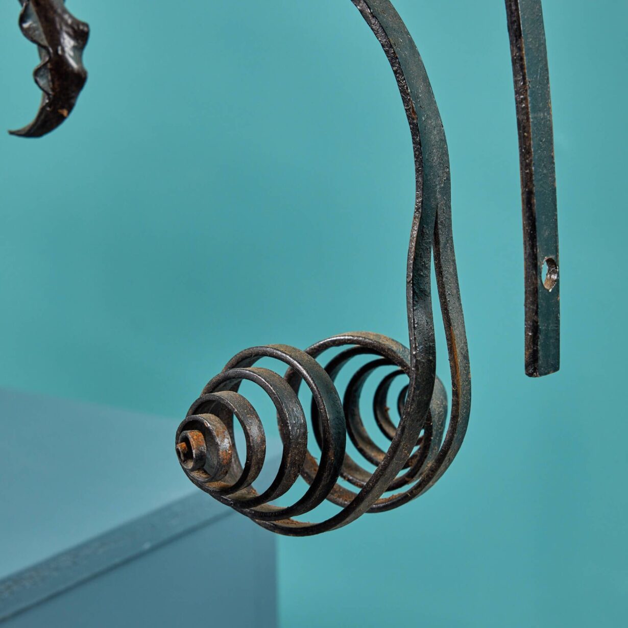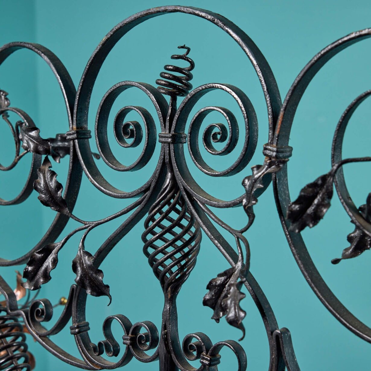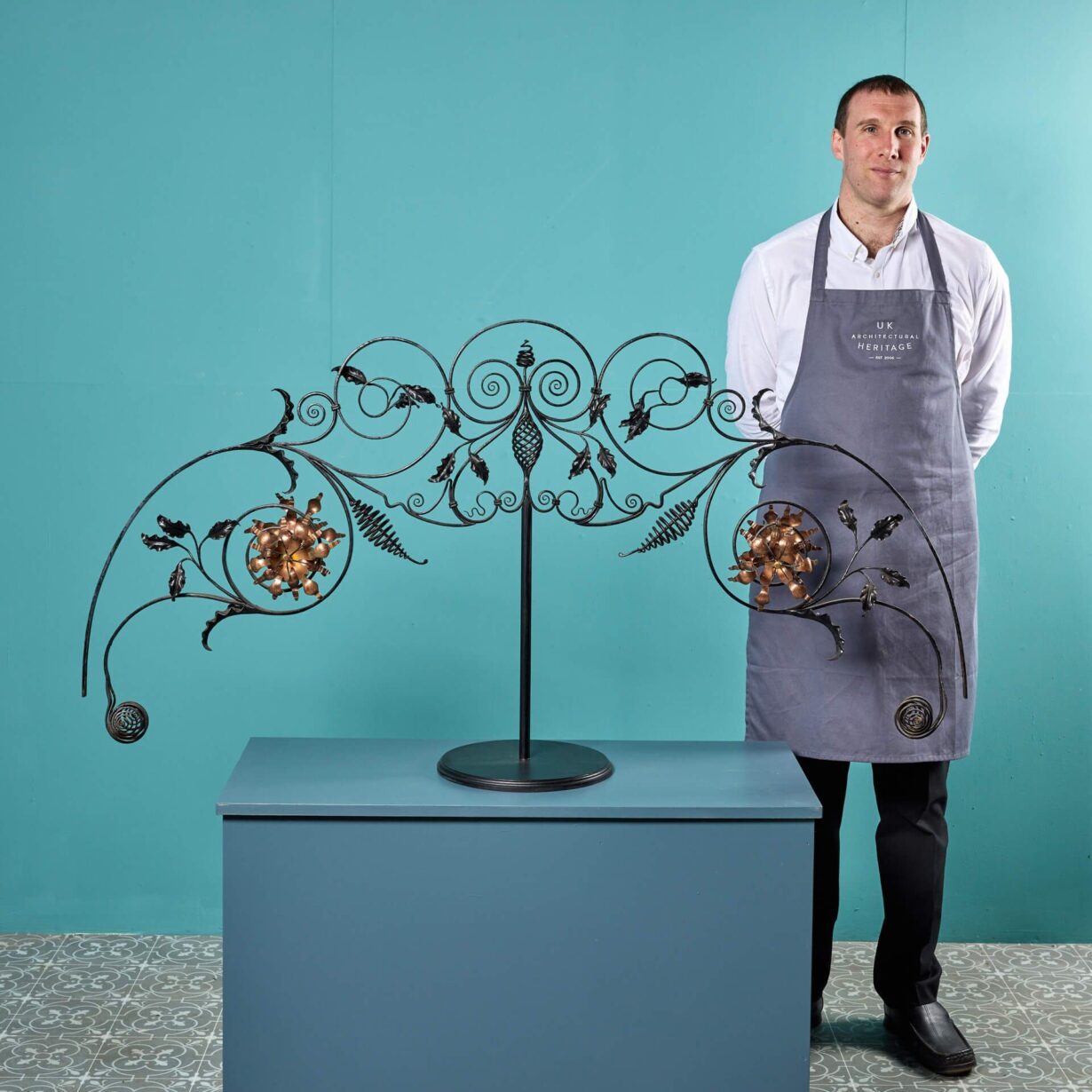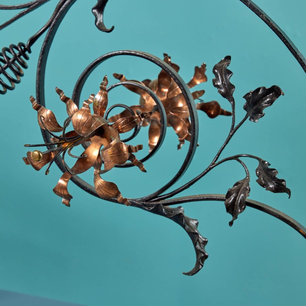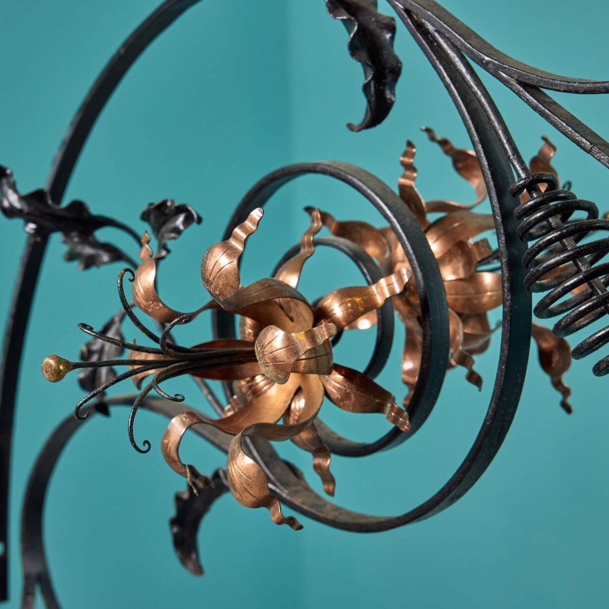 back to topDelicately handcrafted, this 19th century wrought iron gate overthrow is made to the highest quality by a skilled blacksmith. It is an excellent example of 19th century English metalwork, elegantly crafted with scrolling details, twists and leaves, showcasing the true talent of the maker. In a striking colour contrast, finely made copper flowers ornament both sides, making this item a highly detailed architectural feature for a property. Of the Arts and Crafts era, it will look spectacular beneath the shelter of a porch or on its stand as an item of decorative sculpture in an interior.