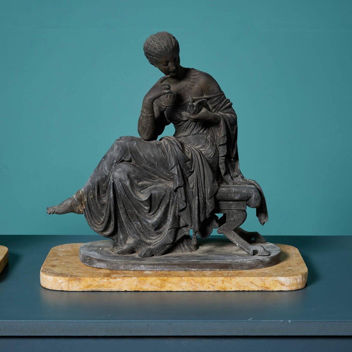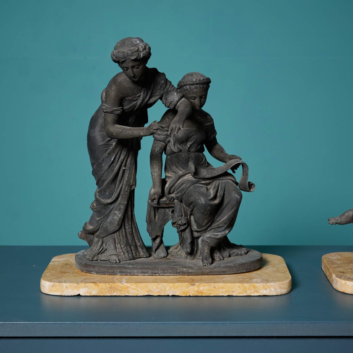 back to topTwo elegant 19th century classical spelter figures on yellow fossilised marble bases, dating to circa 1850.