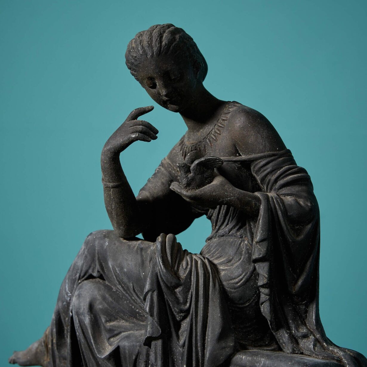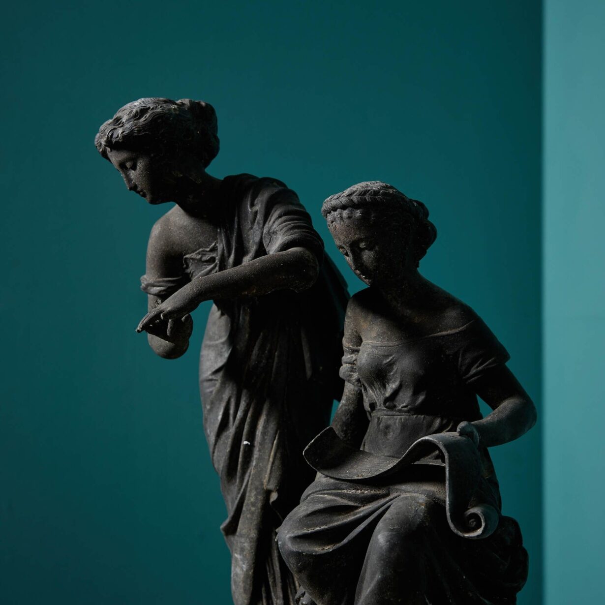 This decorative pair of classical sculptures – one modelled as a seated female observing her reflection in a mirror, and the other as two females, one standing, one seated, with a scroll of parchment in hand – are perfect for placement either side of a mantelpiece, sideboard or console table, bringing an air of grace and sophistication to any setting.
