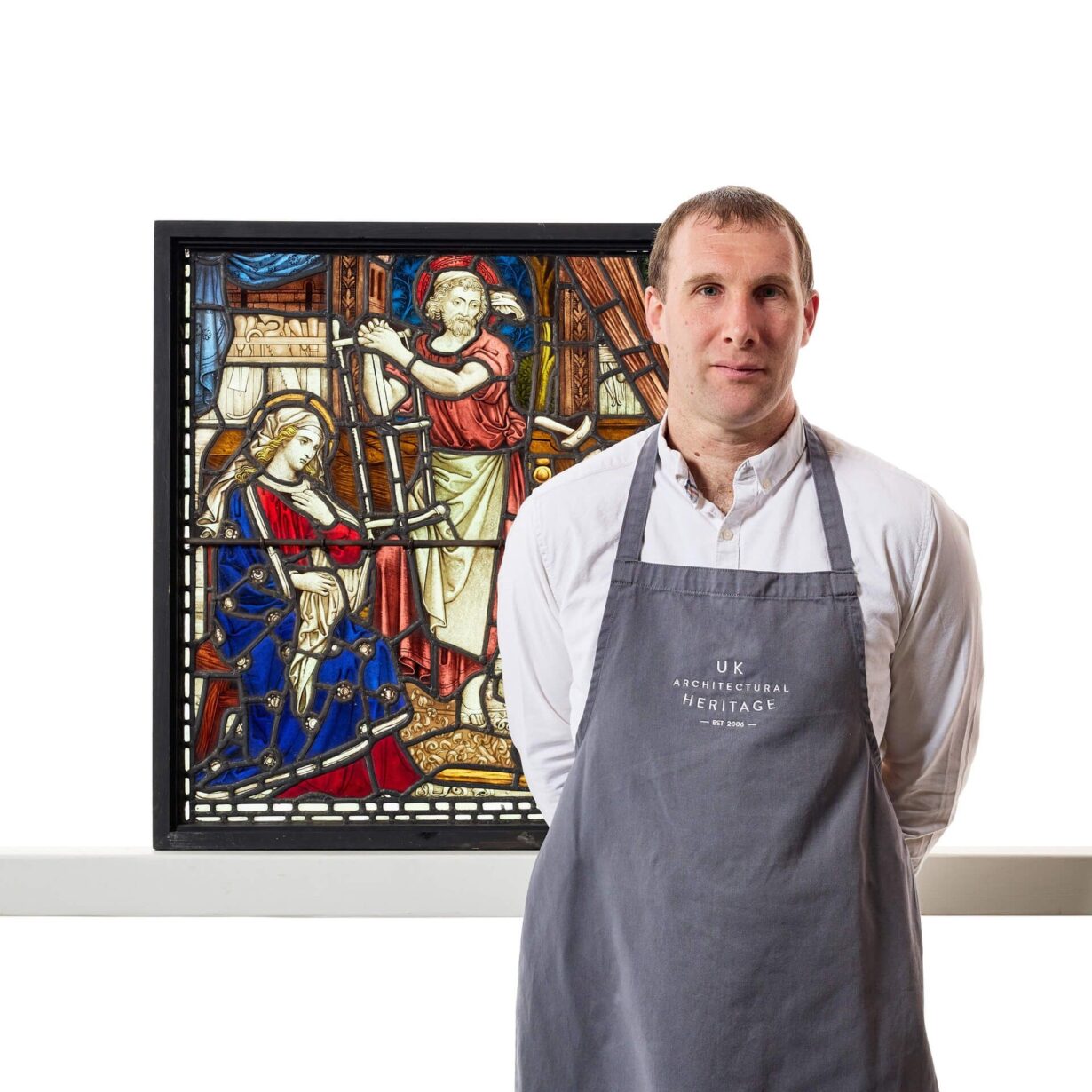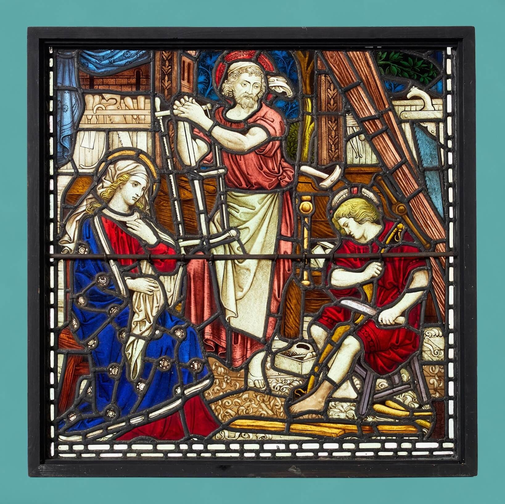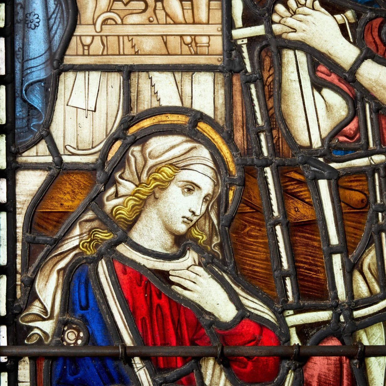 This spectacular late 19th century stained glass panel detail titled ‘Christ in St Joseph’s Workshop’ – Christ is shown seated and holding a file with St Joseph standing to the centre holding a saw, while Mary is seated to the left observing their work.