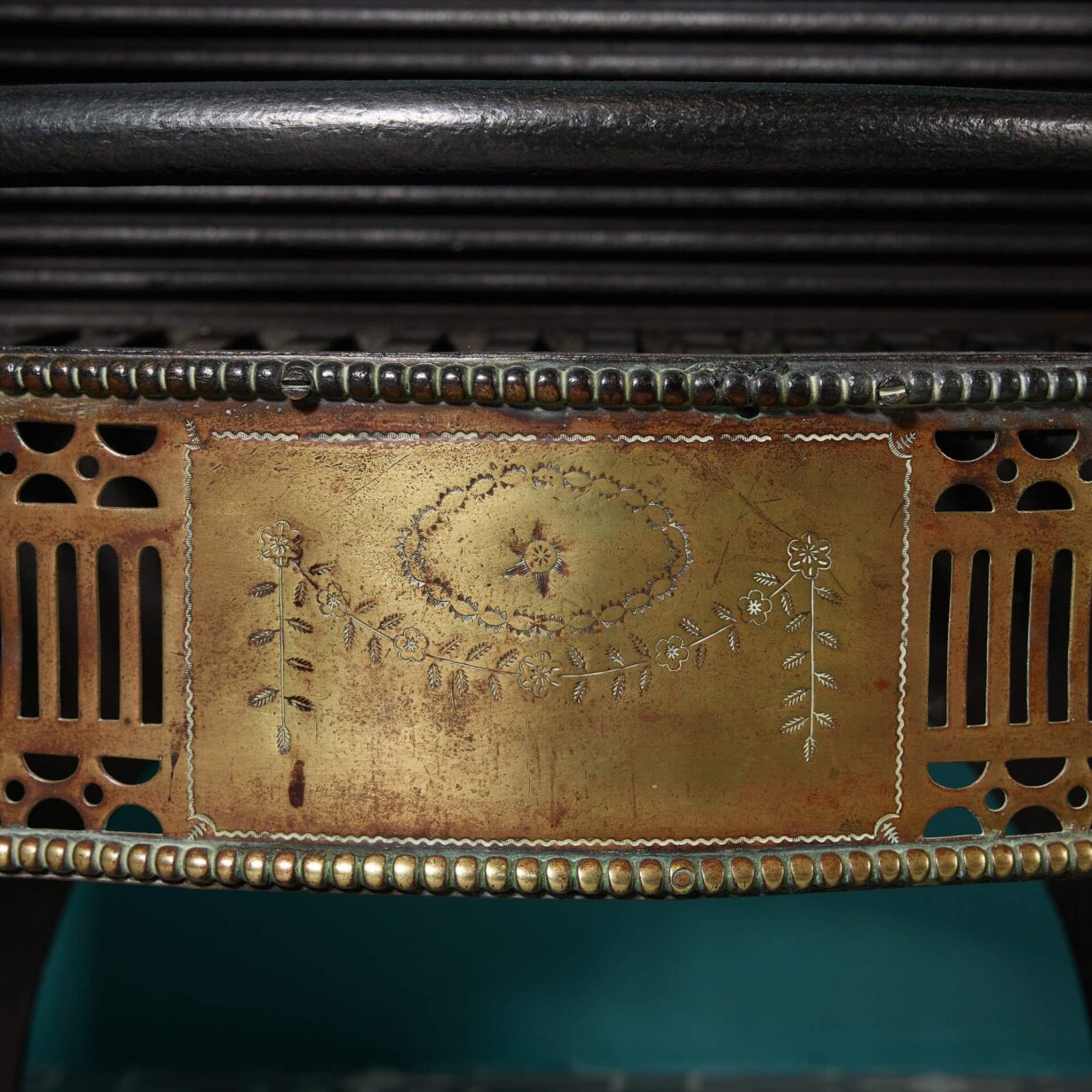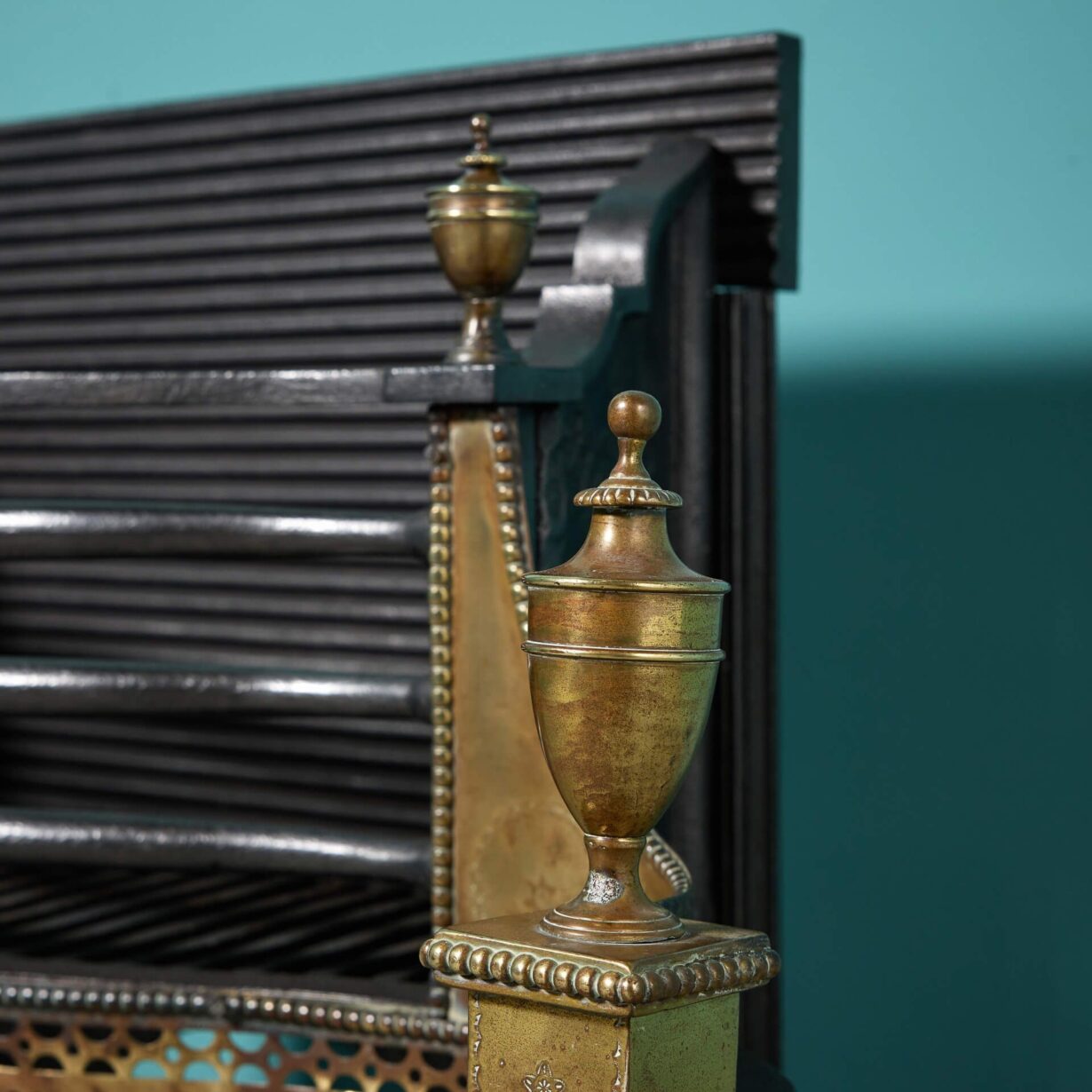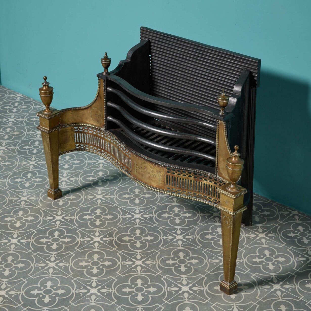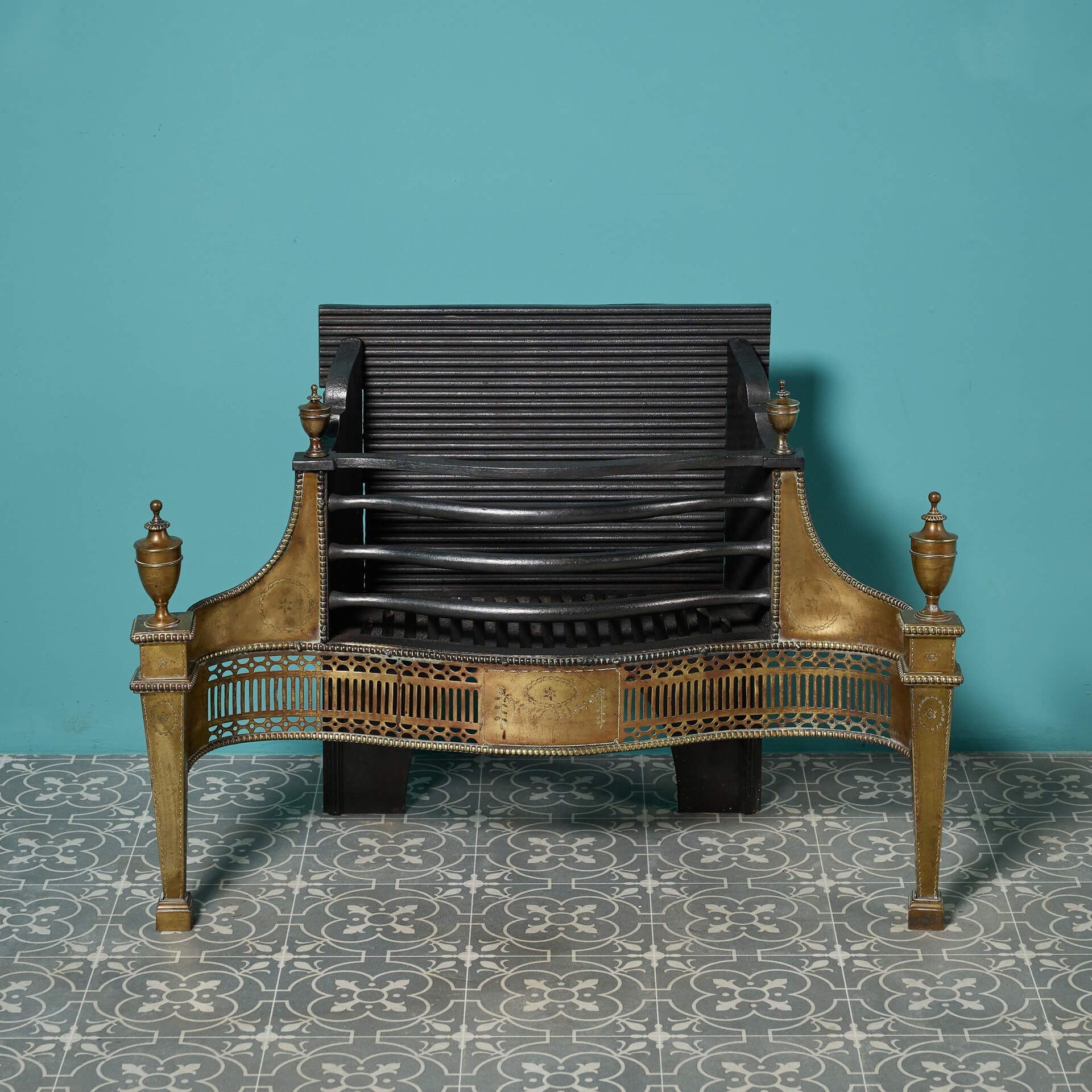 back to topA beautiful 19th century Georgian style cast and wrought iron fire basket with a striking brass front, decorated with neoclassical style urn finials, repeating pierced fretwork and floral swag engraving.