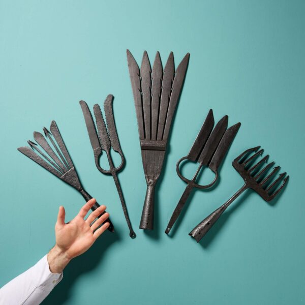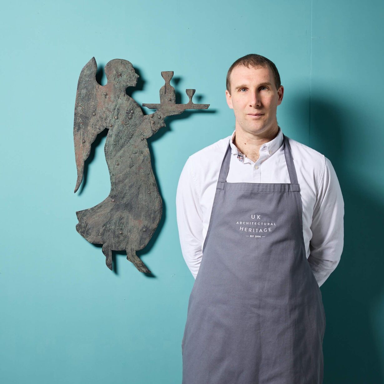 The patinated sheet iron silhouette compliments the design of this a beautiful wall plaque, that displays the silhouette of the winged figure, bearing a drinks tray.