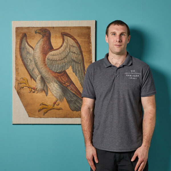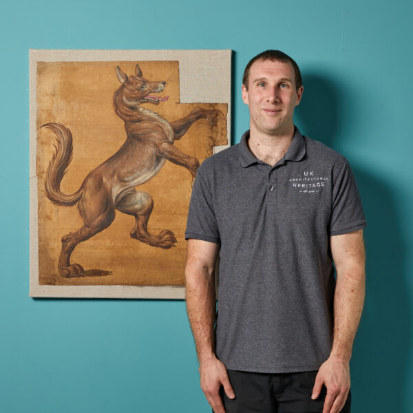 back to top19th Century Oil Painting of a Heraldic Lion. An antique oil on canvas depiction of a Lion in rampant pose. One of four similar panels removed from an English country house.