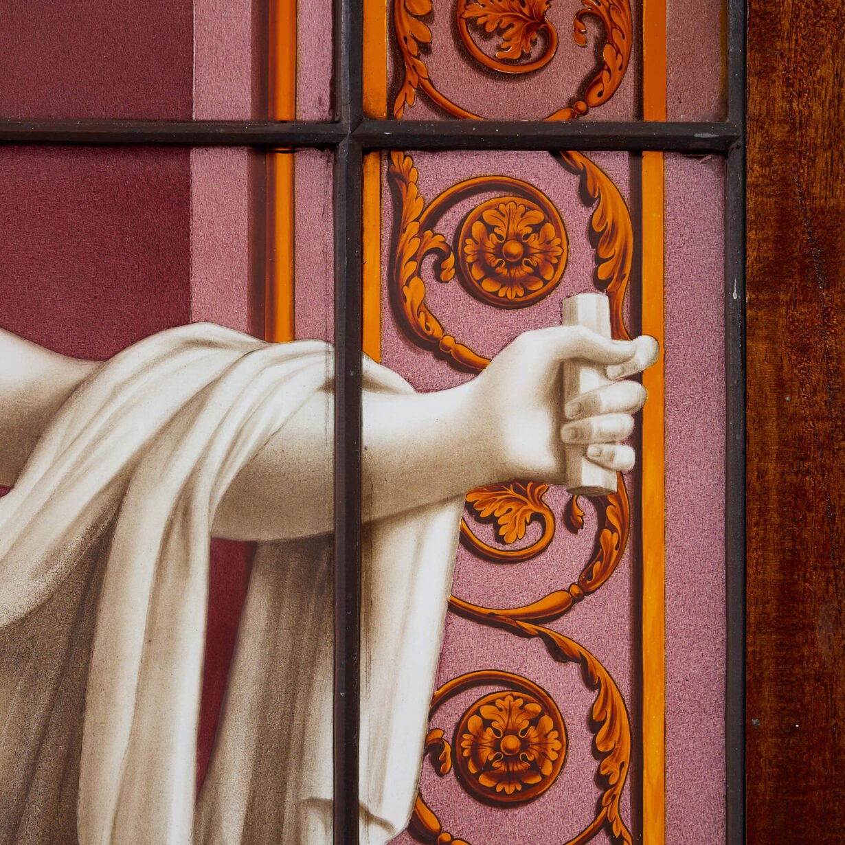 Made up of twenty-three highly detailed panels, the painted niche has great depth and shading, which makes the statue stand out from the glass. The scrolling foliate border is vivid orange when lit from behind. The marble on the base is painted with exceptional detail, making for a photorealistic effect.