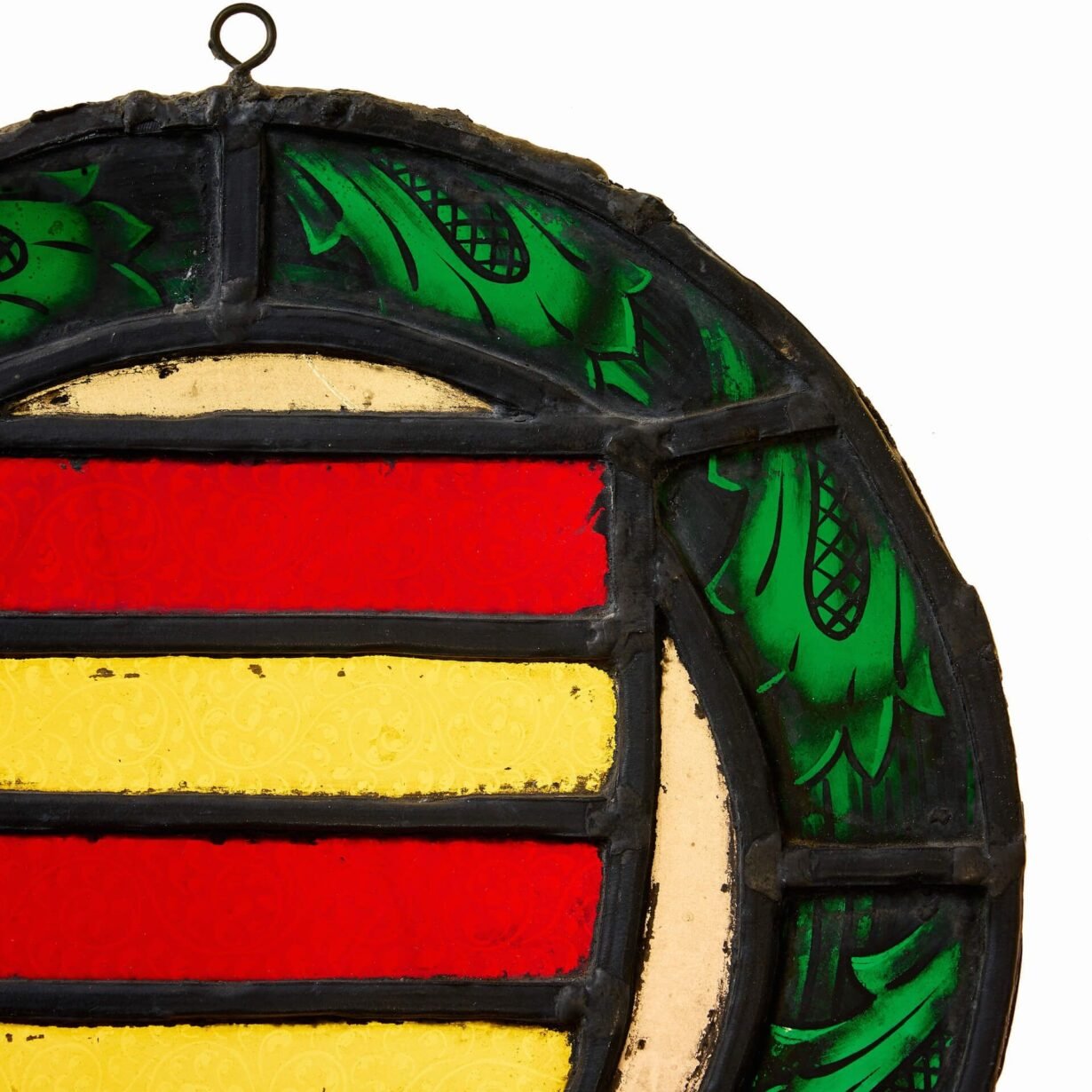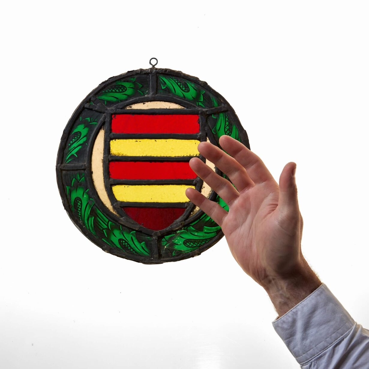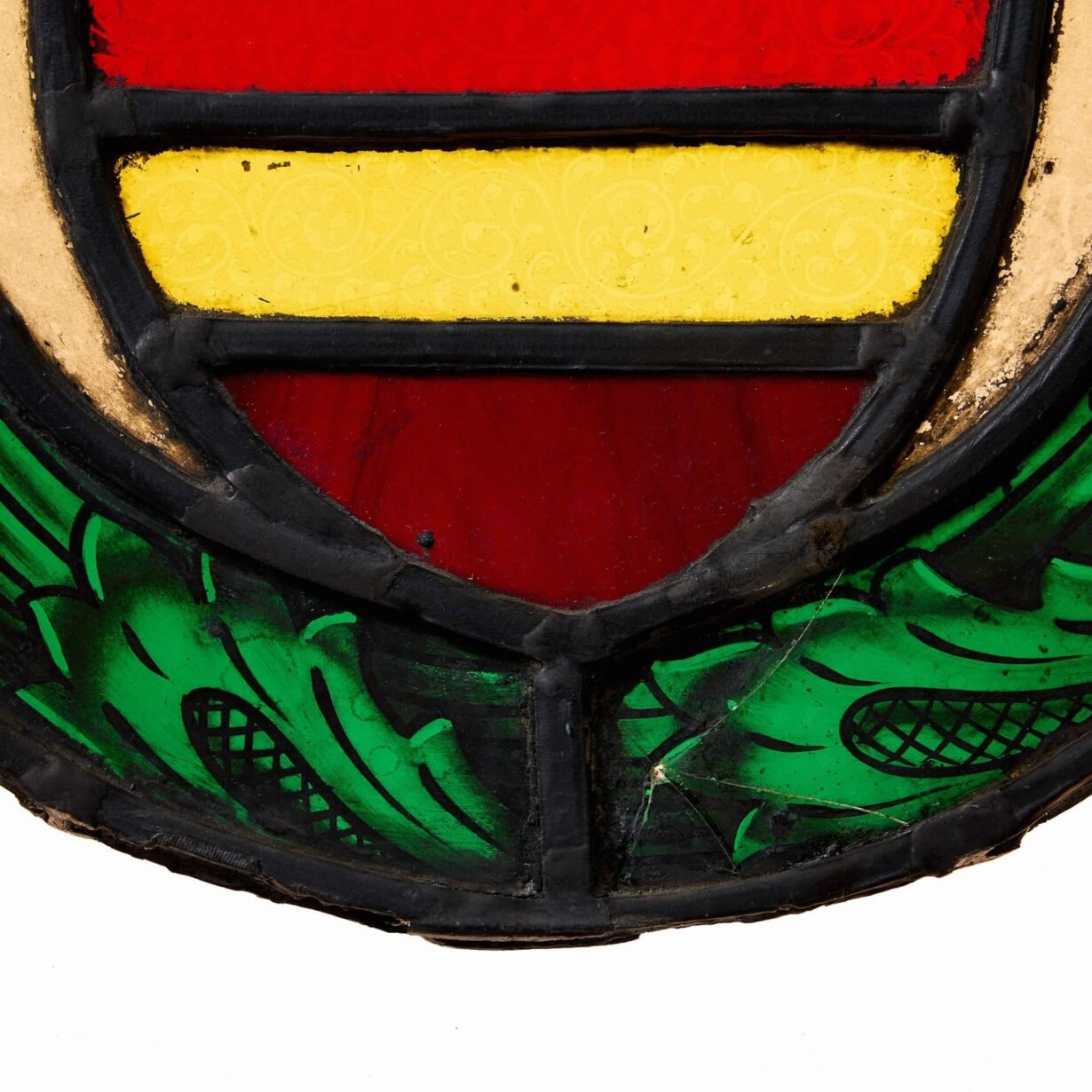 The red and yellow banded shield is reminiscent of a heraldic coat of arms, situated in a deep green floral border. The outer foliage is hand painted and possibly taken from an earlier piece of work.