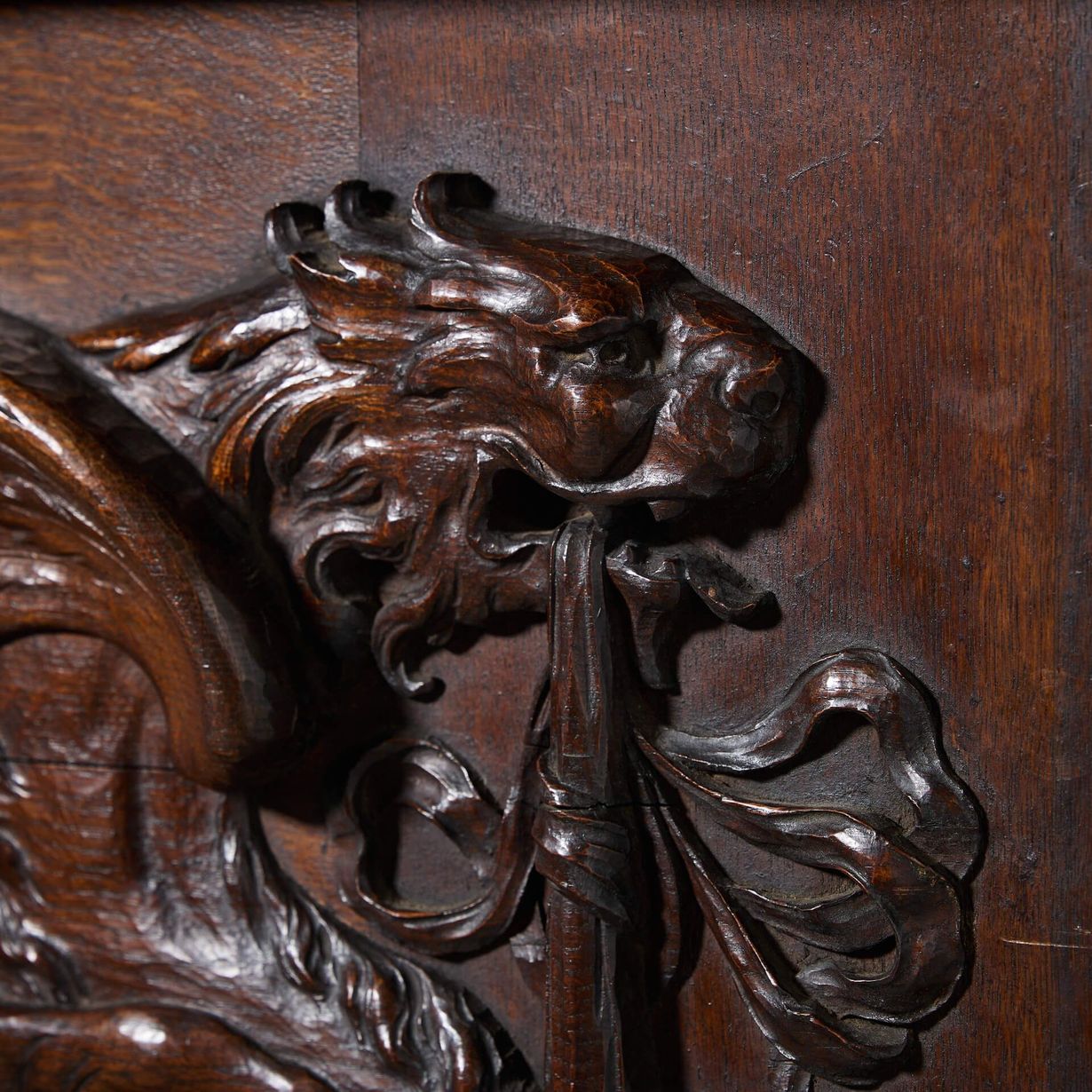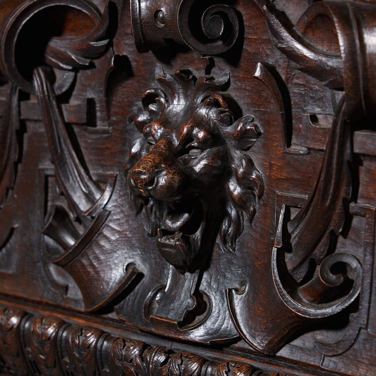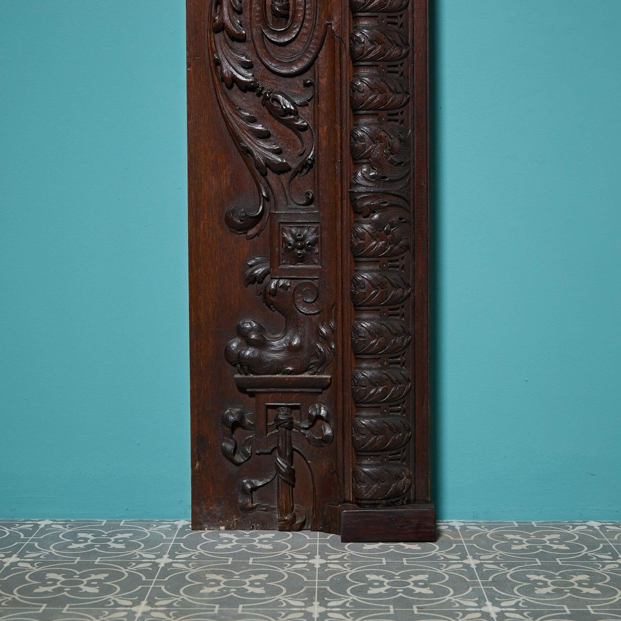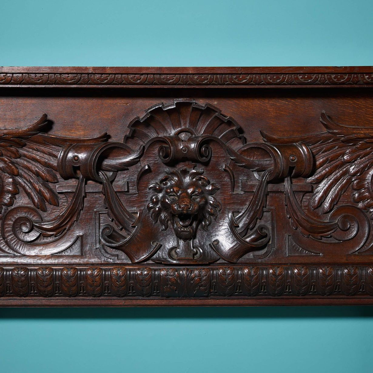 The base of each jamb begins with a lion’s foot atop a ribboned podium. Rich foliage and scrolls pour from the mouths of symmetrical griffons with finely detailed feathered wings. The frieze is centred with a fierce, roaring lion deliberately missing a tooth. Surrounded by flowing scrolls over a Romanesque meander.