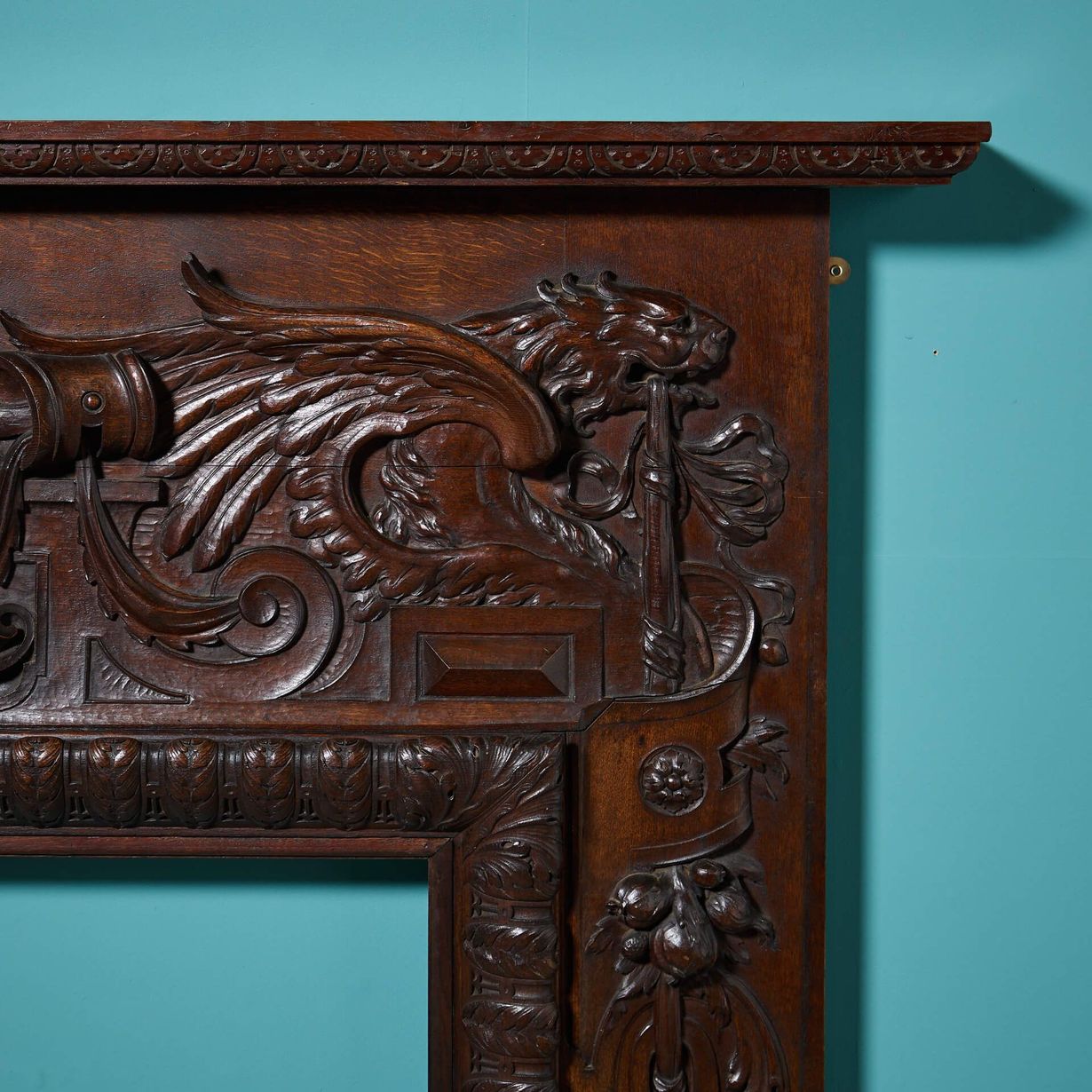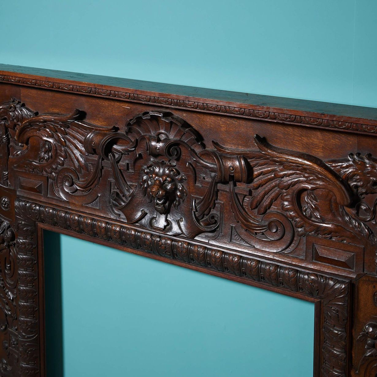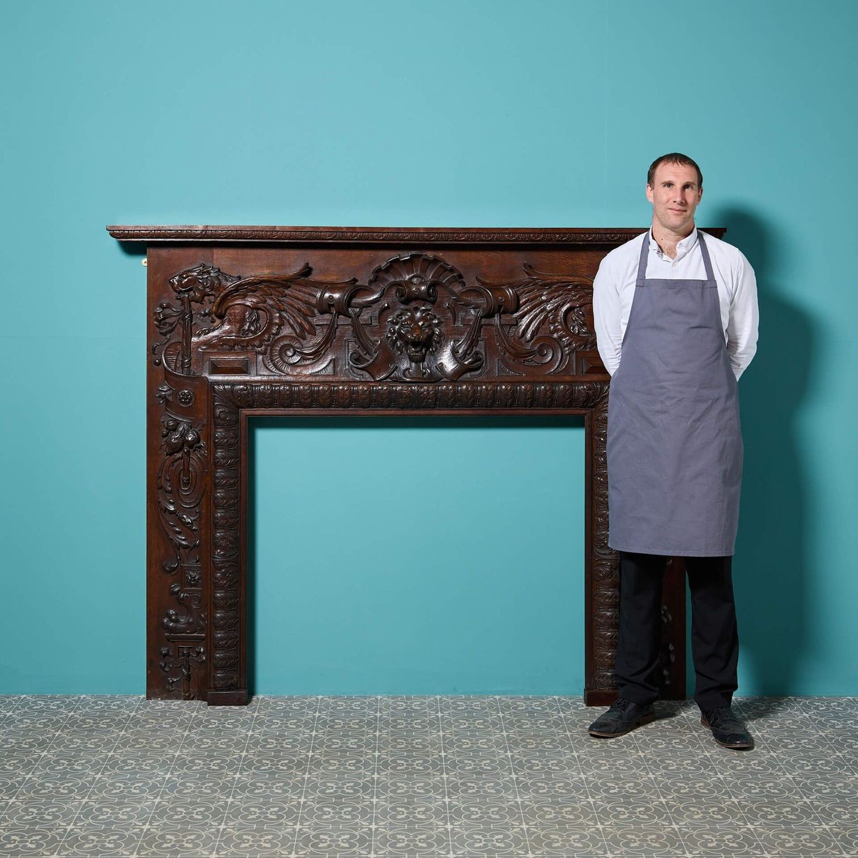 back to topA large scale 19th century Victorian carved English oak fireplace. Dating to circa 1870 this main room fire surround is profusely carved with exceptional skill. Presented in a high/dark oak finish, this main room feature piece blends Victorian and Georgian styles.
