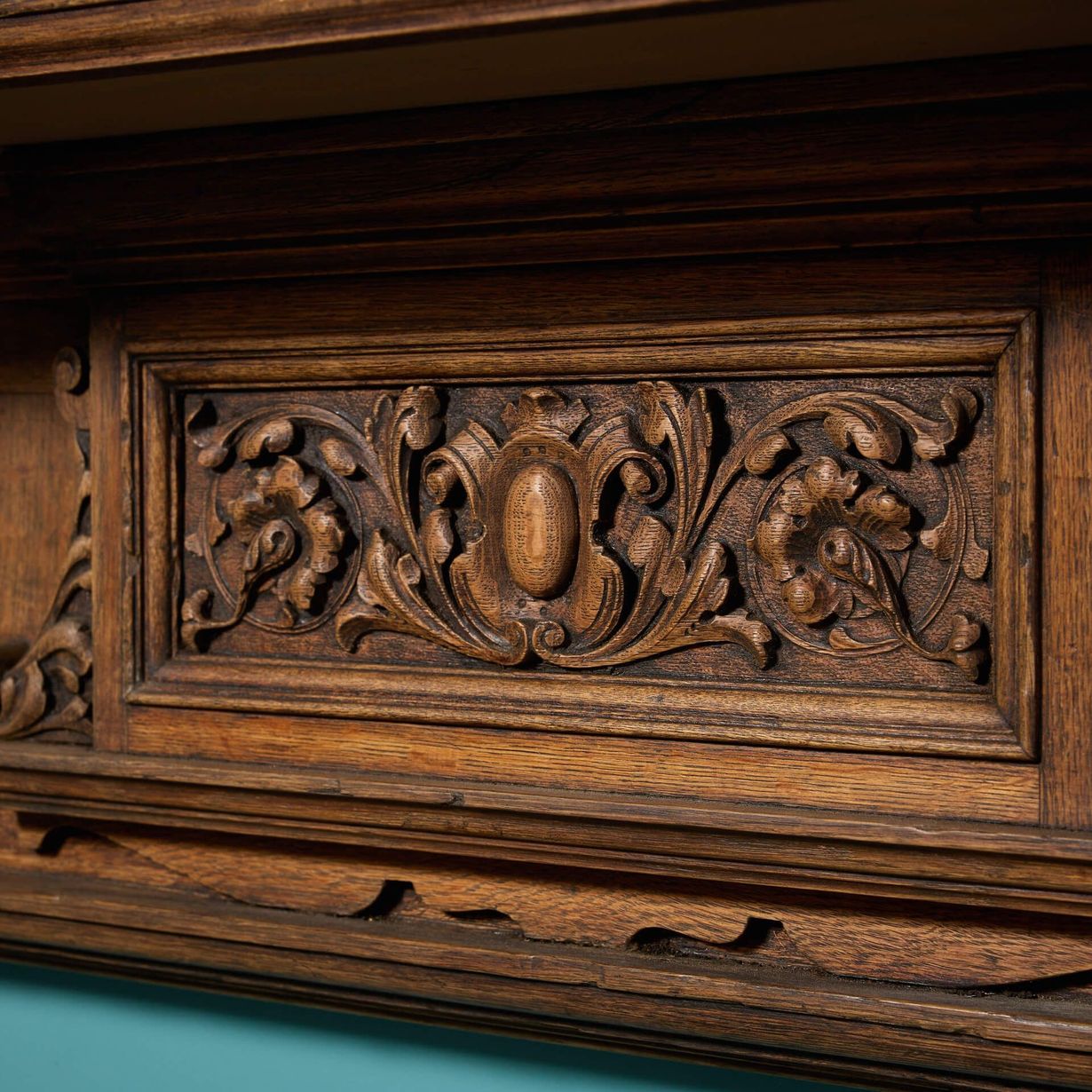 This antique oak fire surround features a beautiful handcarved foliage tablet to the centre between corbel end blocks and smart panelled jambs.