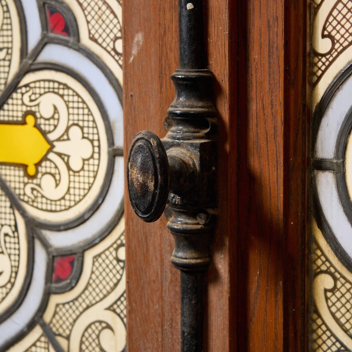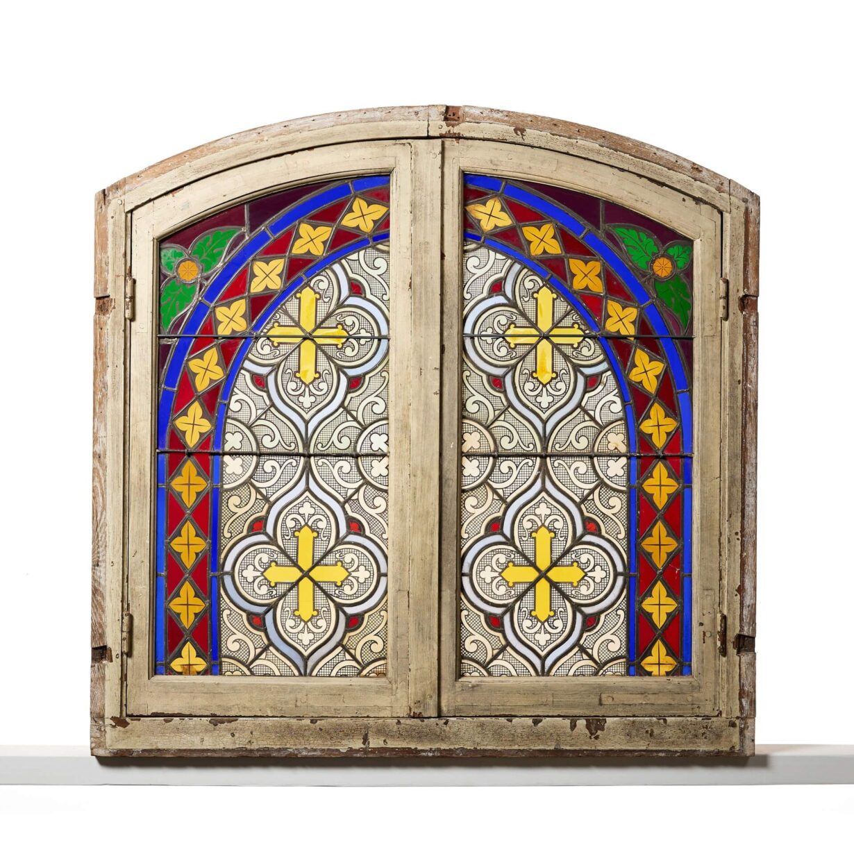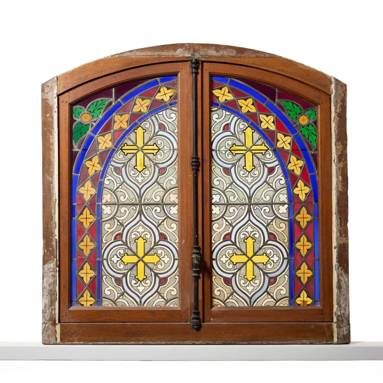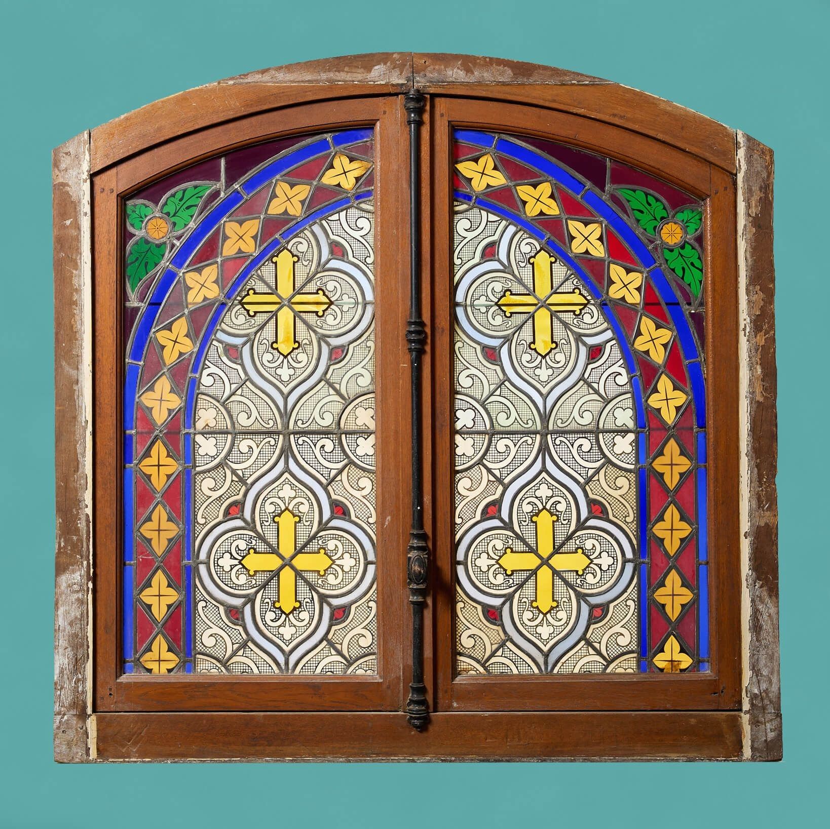 back to topAn early 20th century antique oak window with two stained glass panels originating from France, circa 1910. This colourful stained glass window is large in scale and features an oak frame with two glass panels decorated with scrolls, crosses and foliage, opening at the centre with a sophisticated espagnolette locking system.