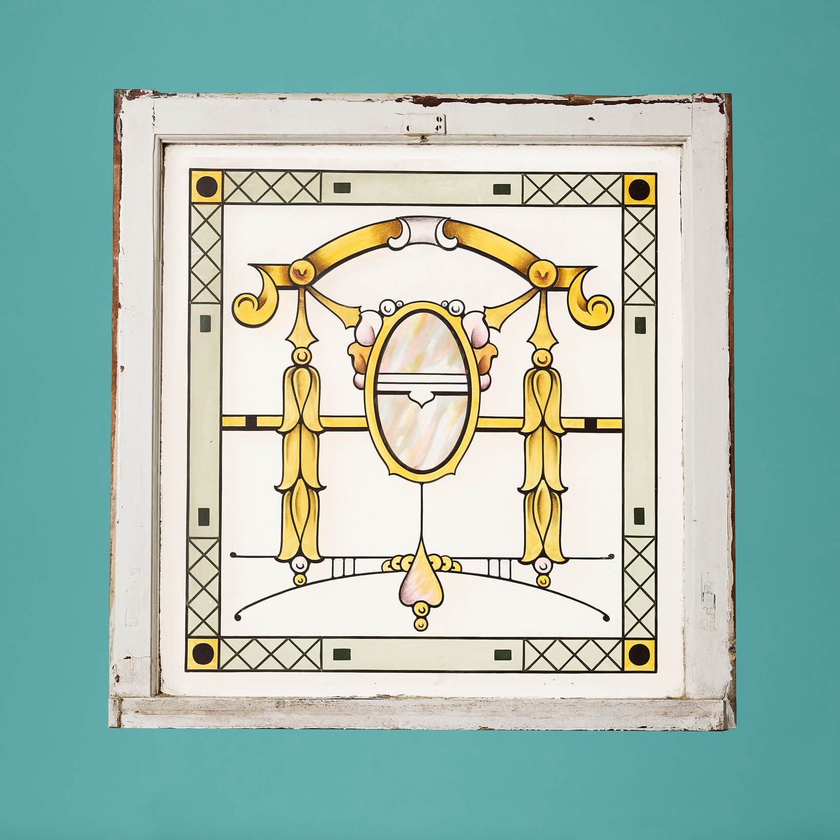 back to topAn early 20th century stained glass window, beautifully etched with Art Nouveau style details.