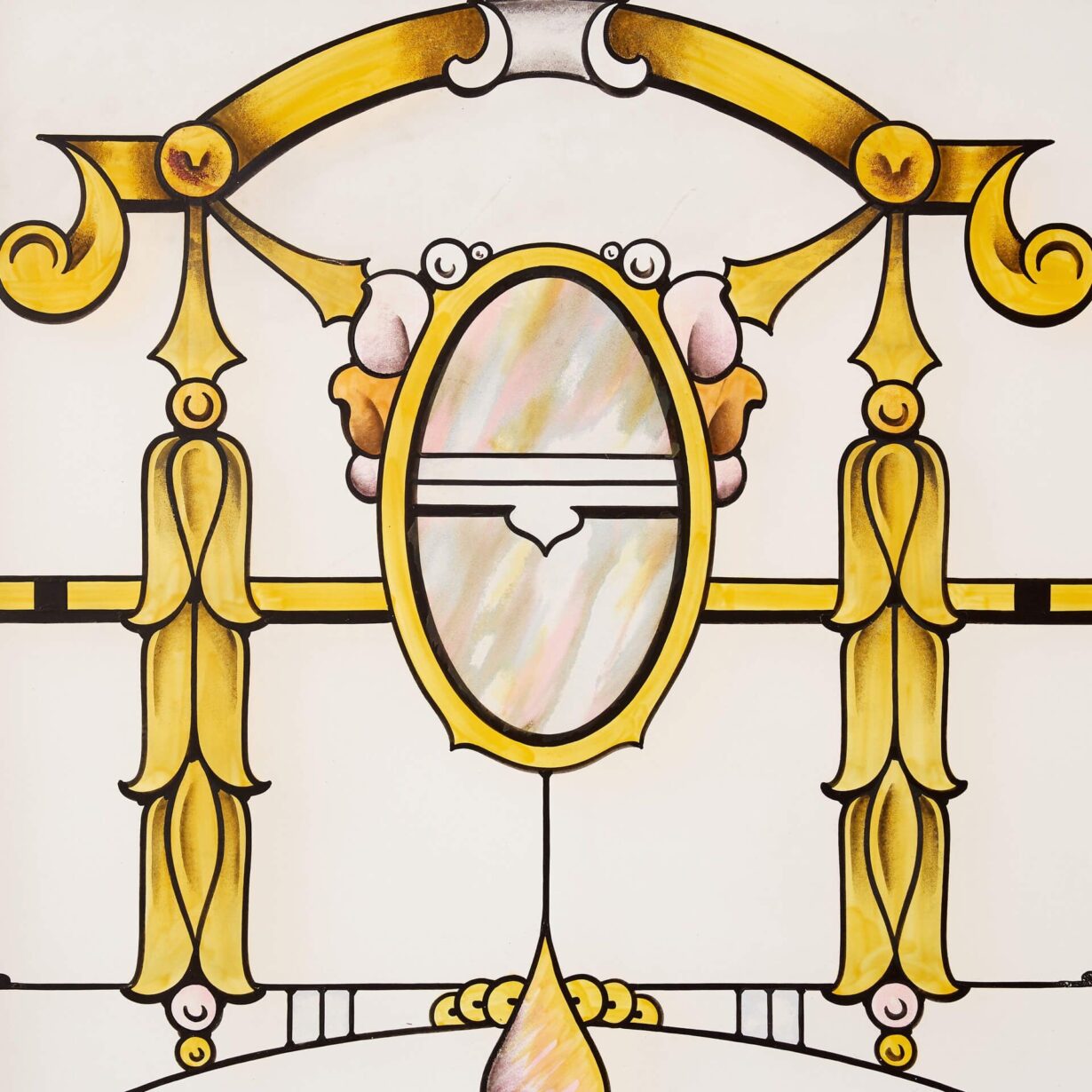 The design is evocative of styling typical of the Art Nouveau period, stained with shades of pale green, pink and vibrant gold, and elegantly etched with intricate arched lines and organic stylised patterns.