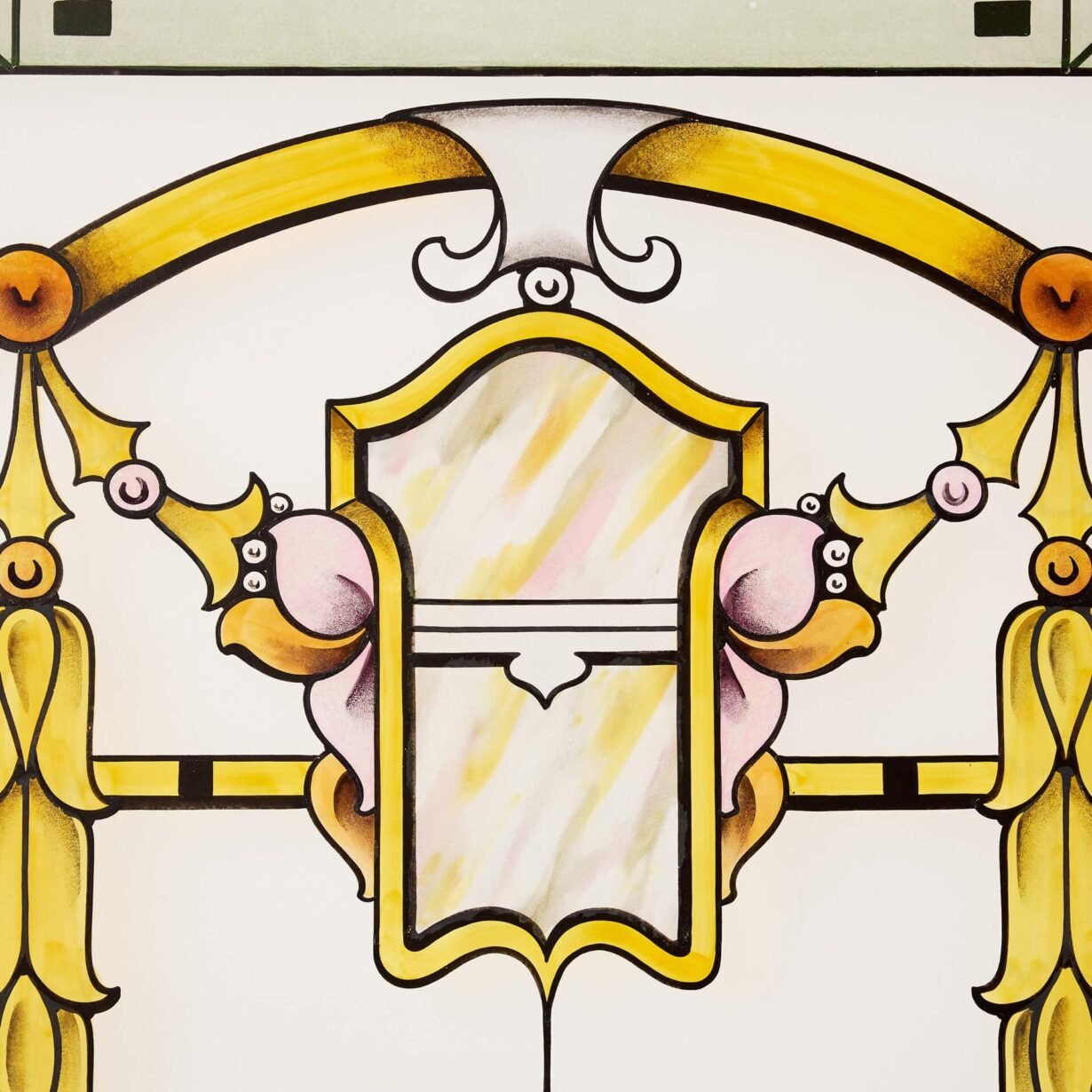 The design is evocative of styling typical of the Art Nouveau period, stained with shades of pale green, pink and vibrant gold, and elegantly etched with intricate arched lines and organic stylised patterns.