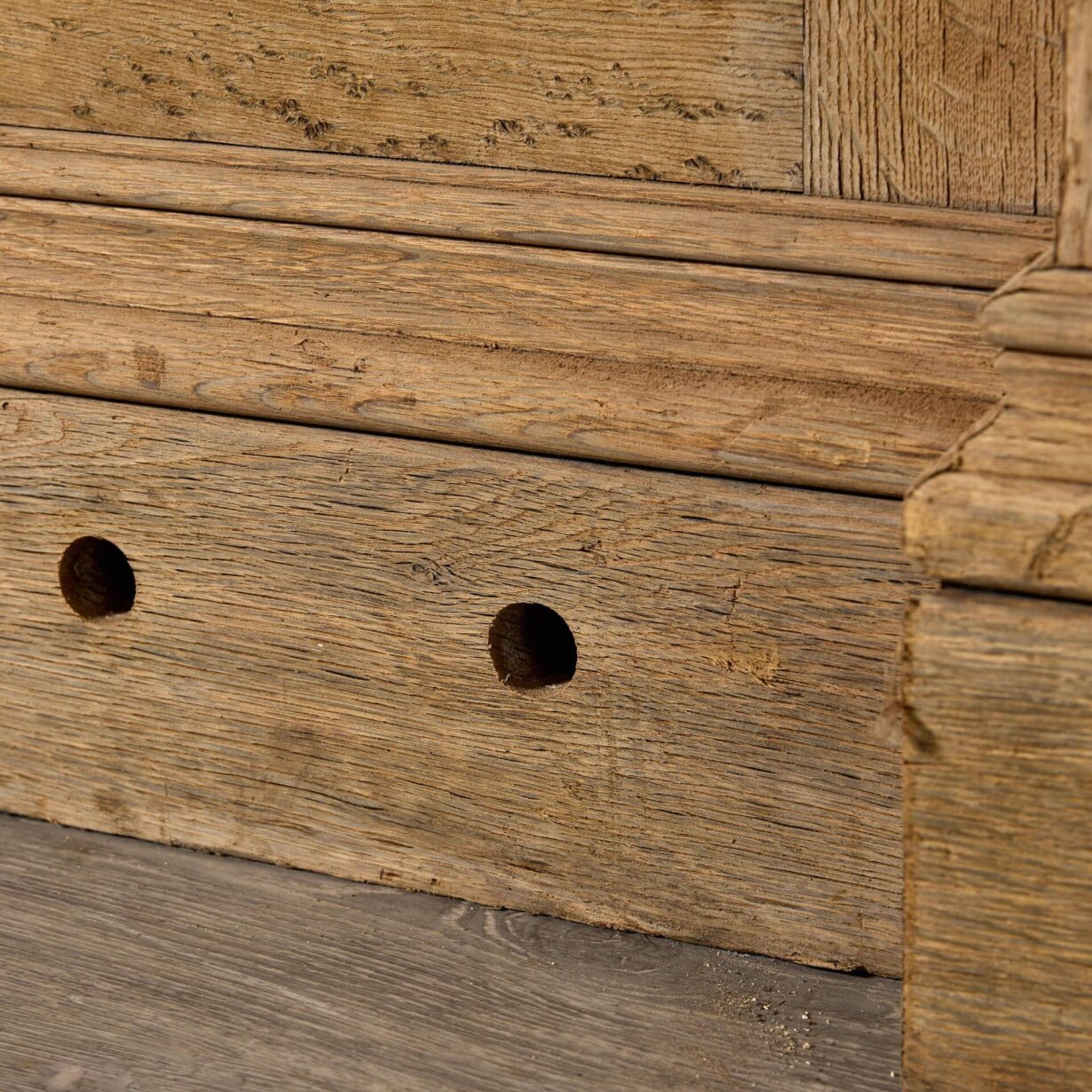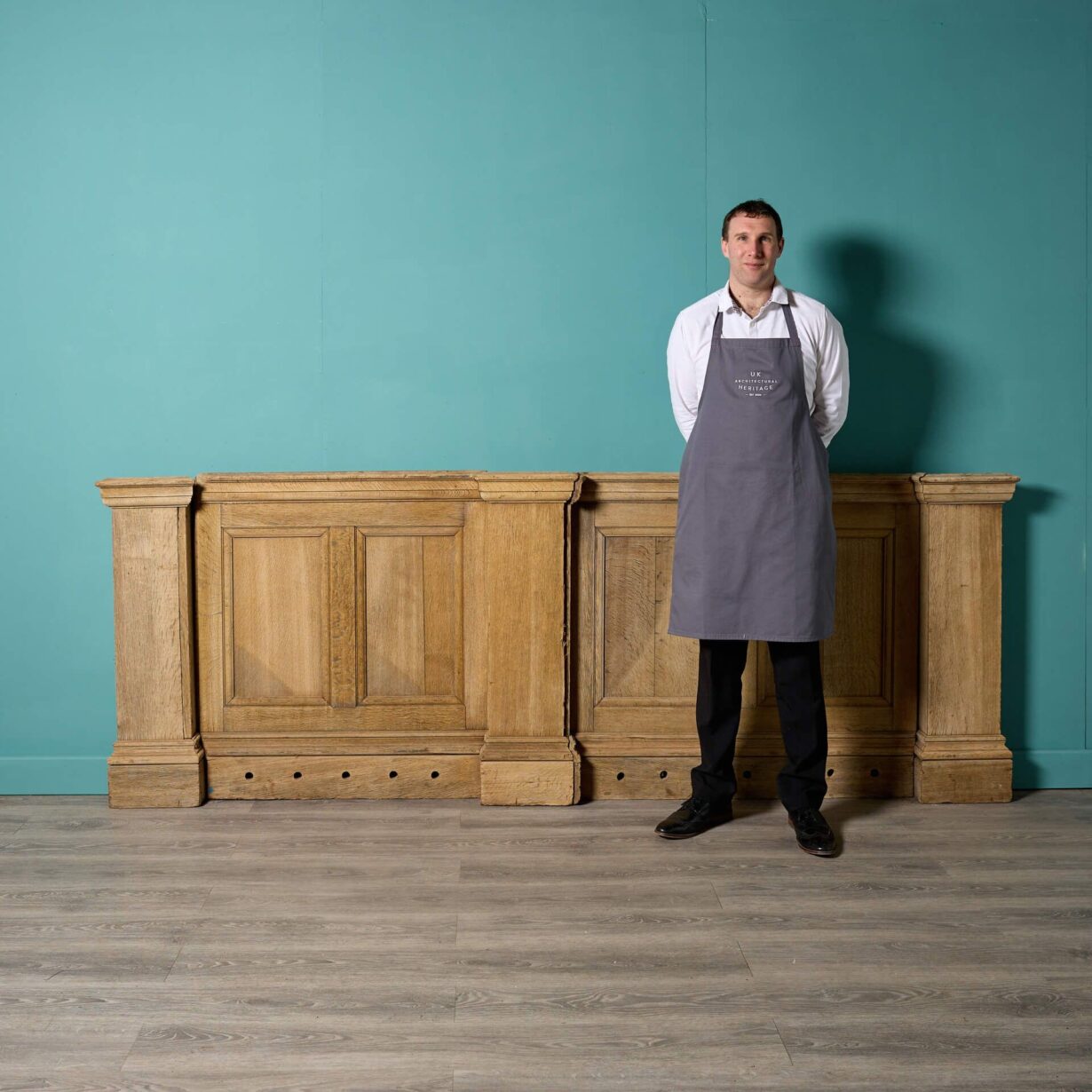 This reclaimed wall panelling has a bare, stripped oak finish that gives it an appealing light oak colour to suit period and contemporary properties alike. It is comprised of around 25 individual panels varying in size, designed to be separated by intermediate pillars approx. 25 cm wide in between as pictured.