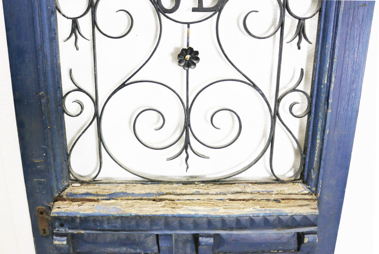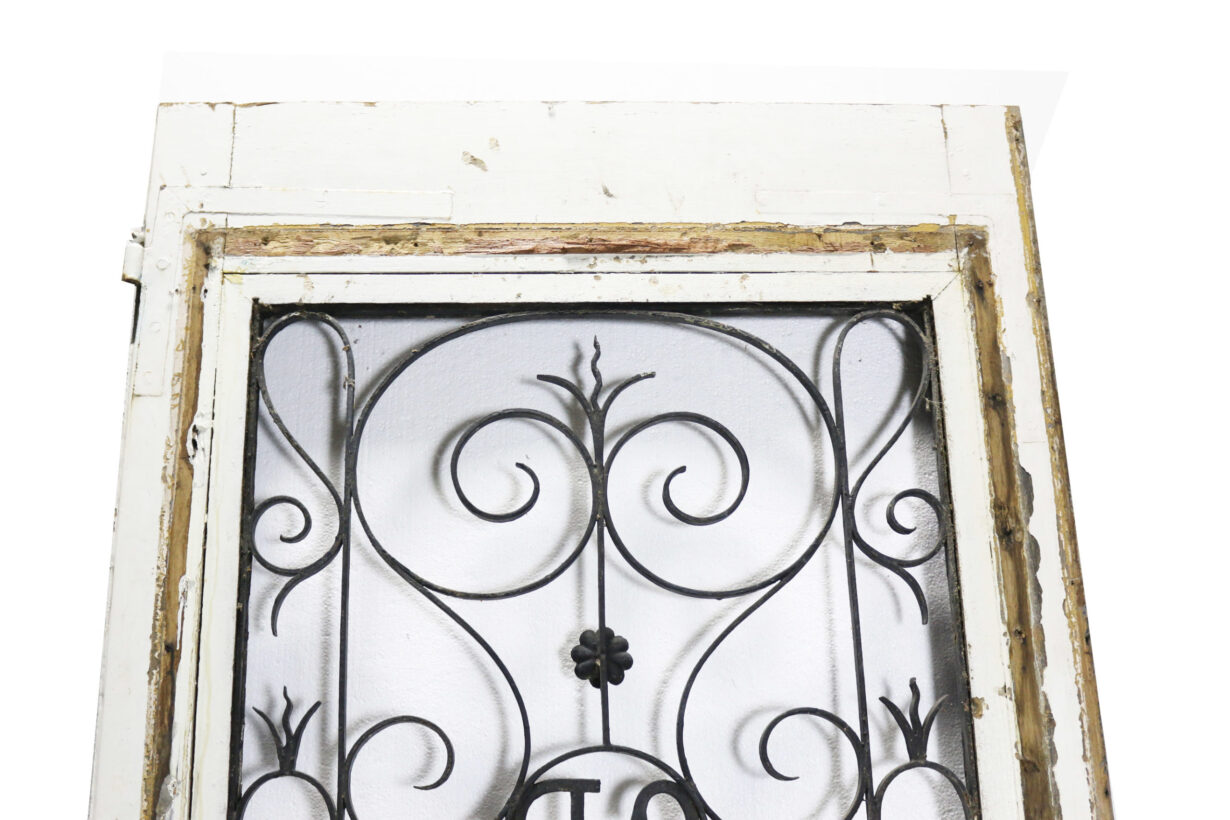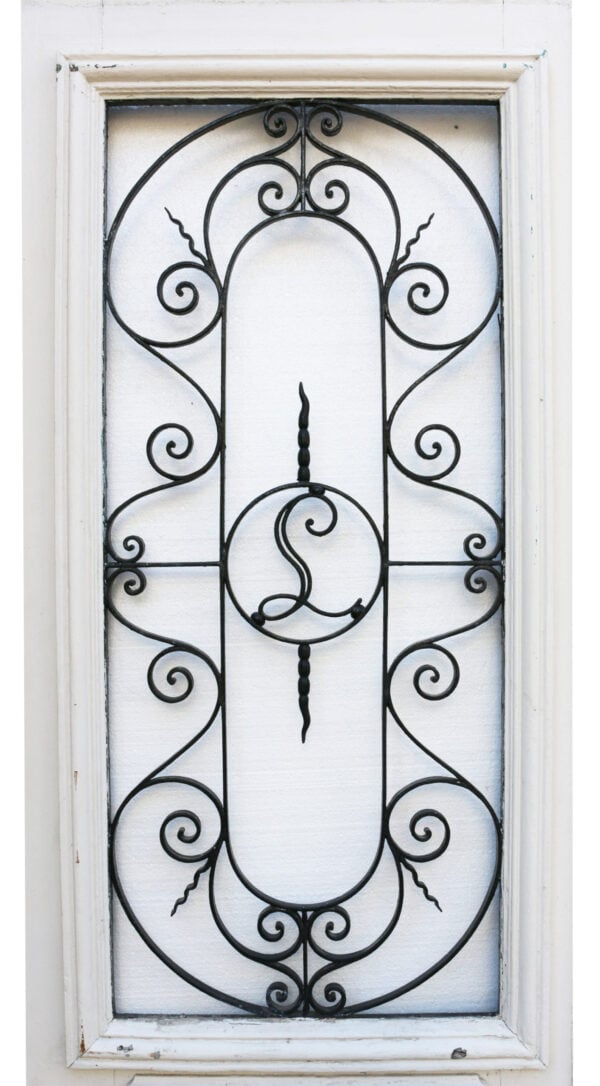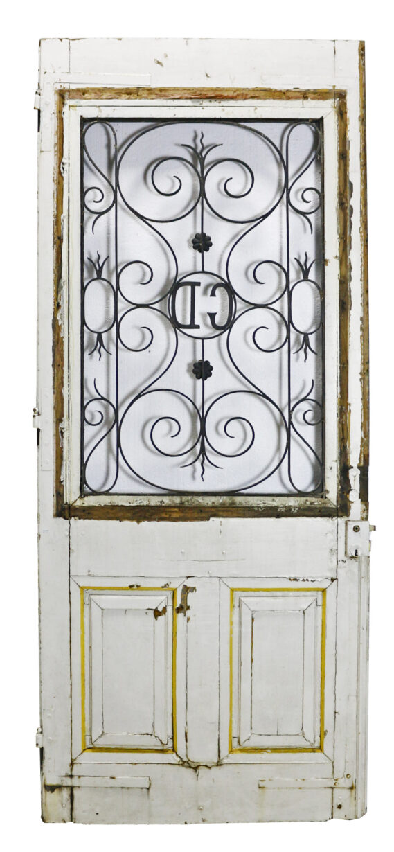 back to topA French oak door fitted with a wrought iron window grill, with monogram, no glazing.