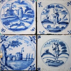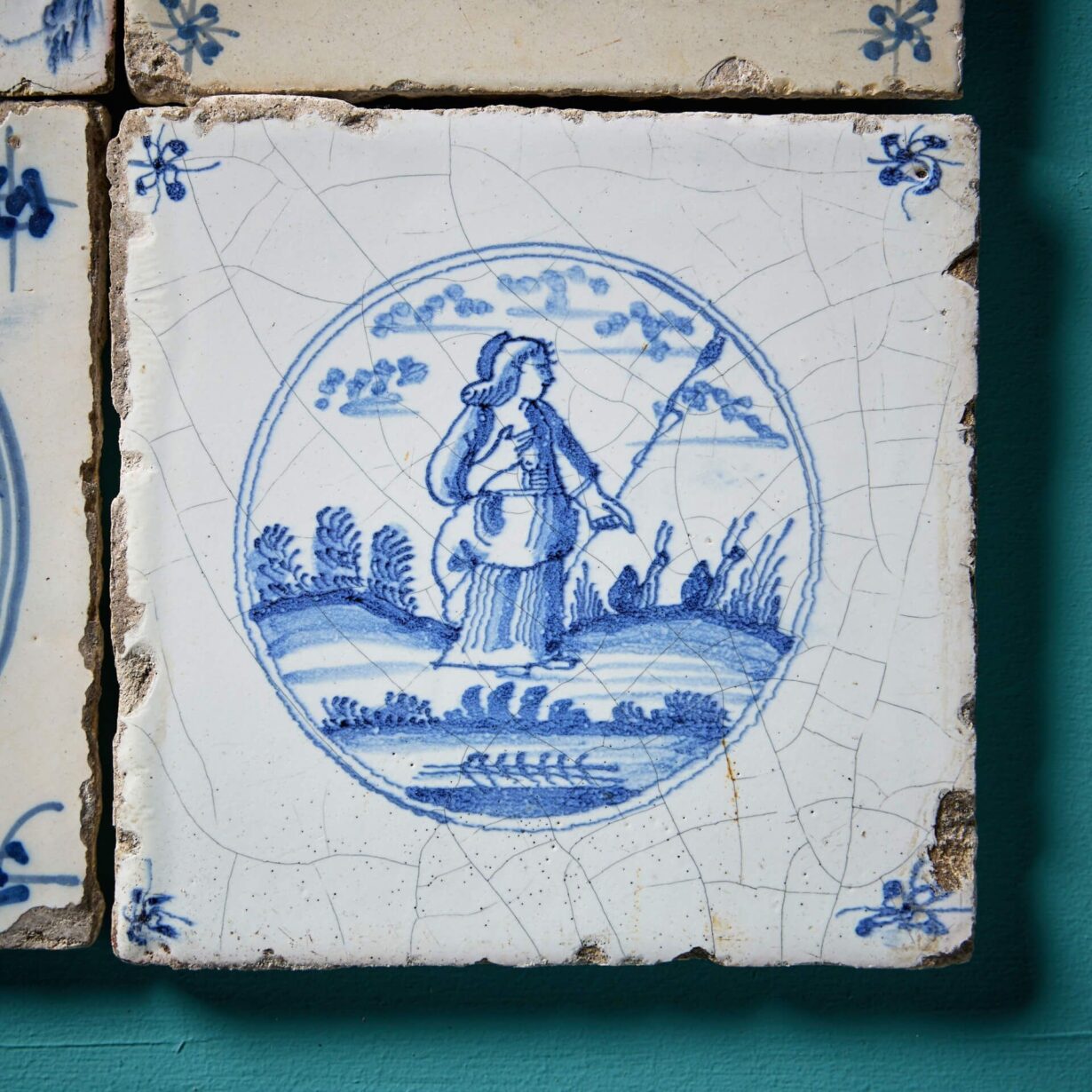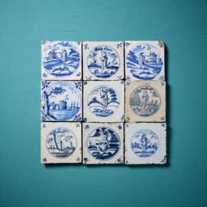 back to topA collection of nine 5-inch antique Delft tiles depicting Dutch scenes with windmills, maidens and soldiers, all of which are in expressive blue colouring on a white background. Each image provides a wonderful unique illustration.