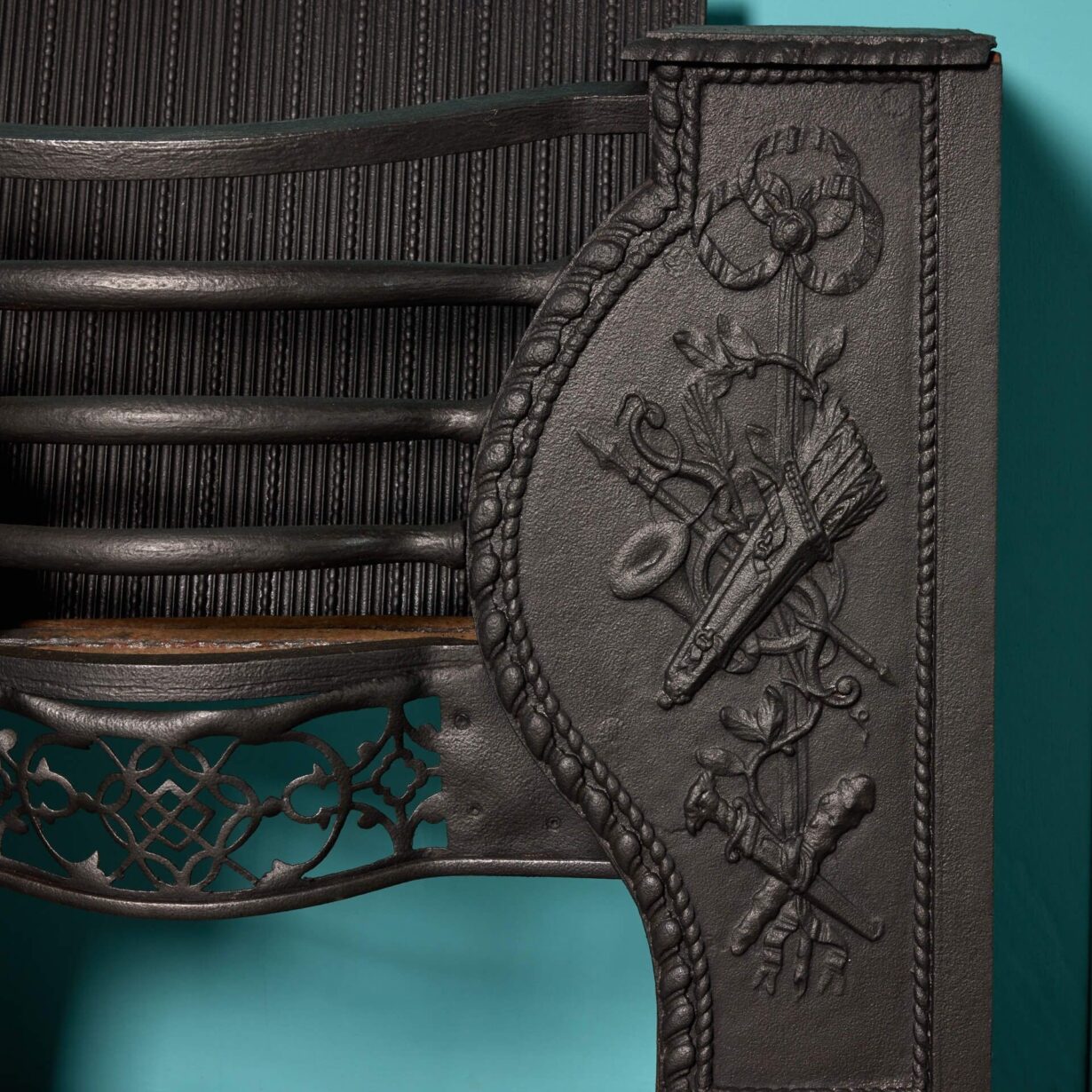 back to topA good quality George III hob grate smartly finished in black graphite polish and ready for placement in your home. Dating from circa 1790, this antique hob grate is handsomely cast in the Georgian style, depicting to the front of both sides a quiver of arrows among scrolling foliage and a spear and horn above a sword. An ornate steel fret to the centre brings the two front sides together, detailed with a pierced lattice pattern for a final touch of beauty.