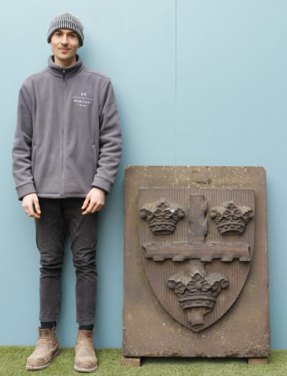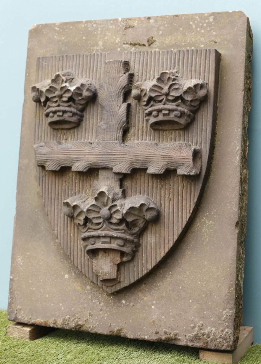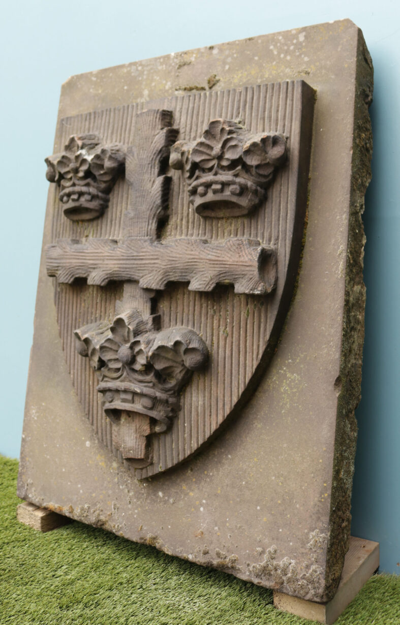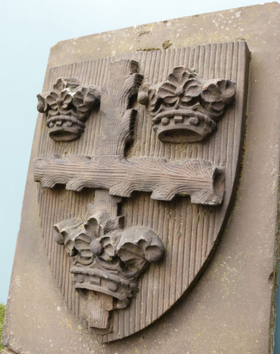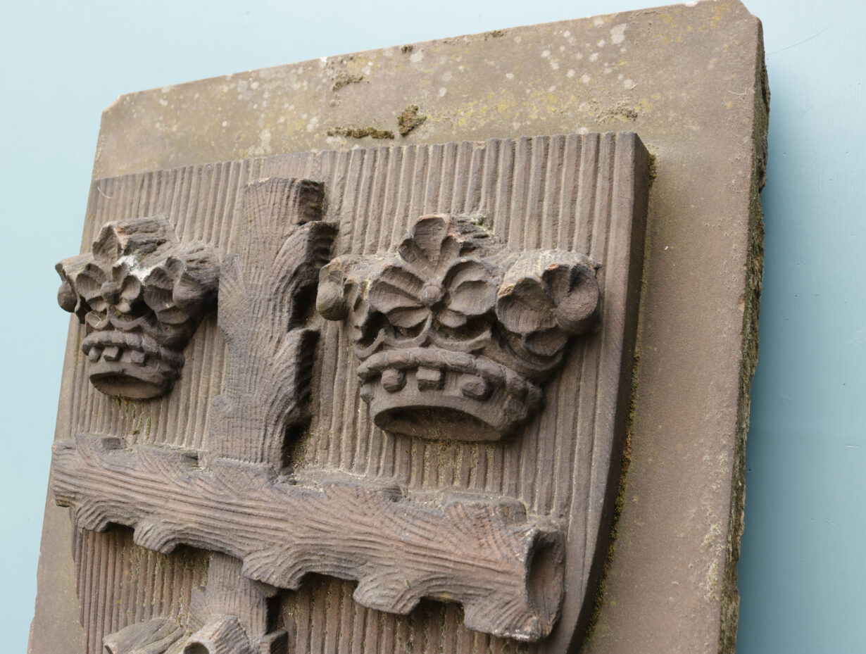 back to topA large hand carved red sandstone plaque bearing the Colchester / Essex Coat of Arms