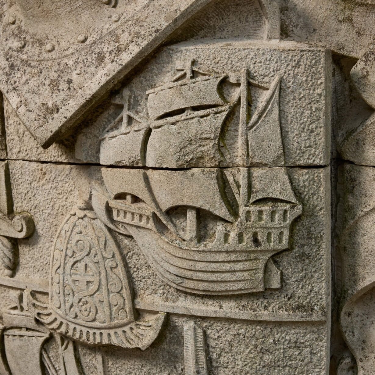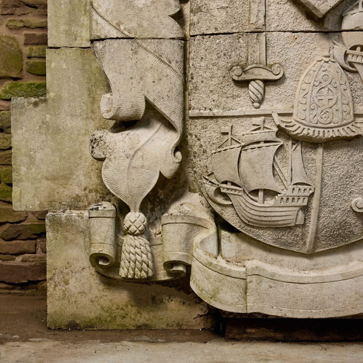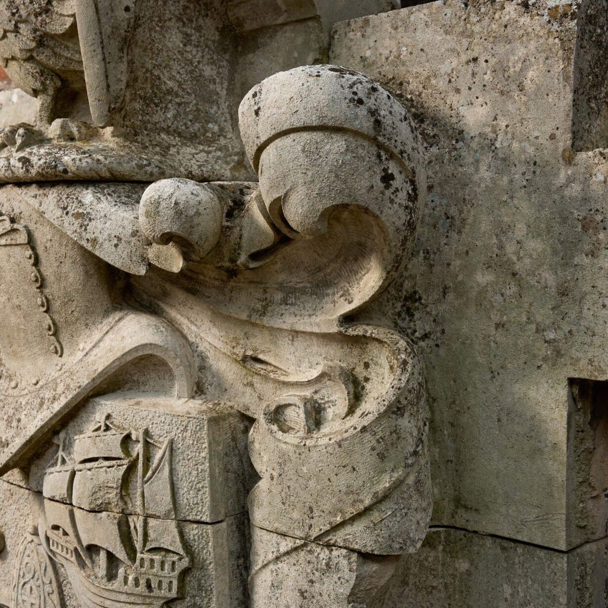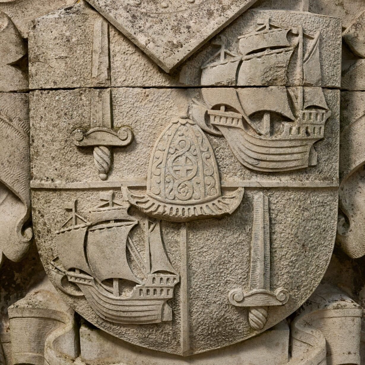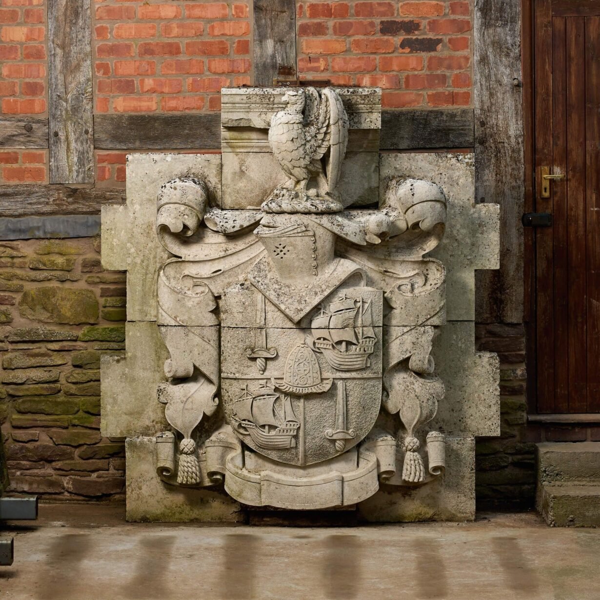 Measuring almost 2m high, this antique stone heraldic crest is a spectacular find. Handcrafted, it depicts a huge coat of arms carved in relief, the shield bearing swords, galleons and a helmet, below a further helmet and an eagle rising with wings back and inverted.