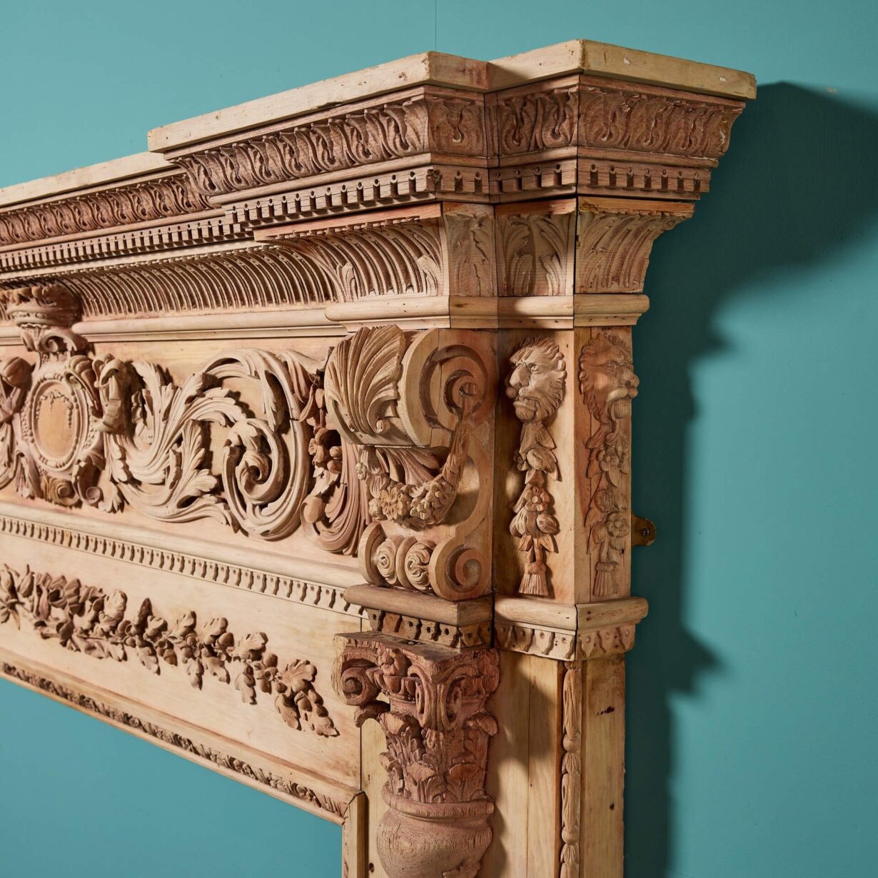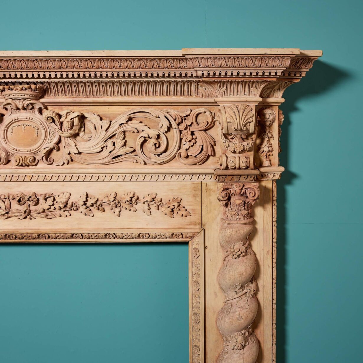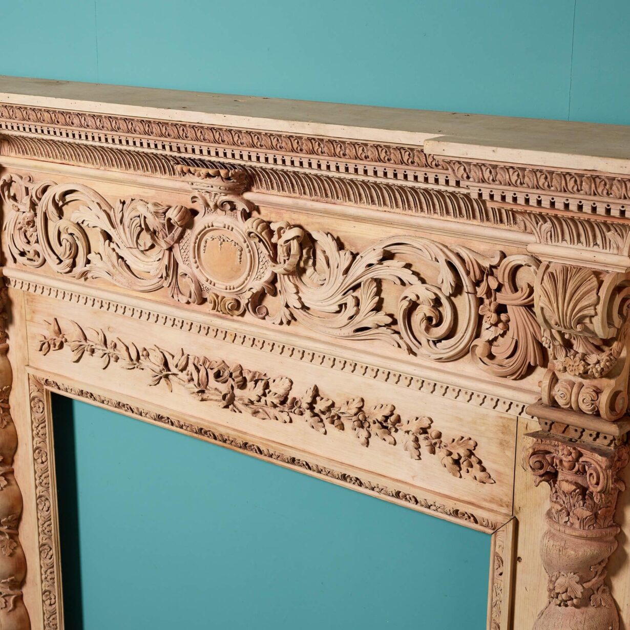 back to topAn impressive, large scale George III carved wooden chimneypiece, circa 1800. This spectacular antique fire surround is beautifully handcarved throughout, featuring acanthus leaf and dentils across a fluted pediment, above a deeply carved frieze of scrolling foliage, decorated with birds, spiral and leaf decoration.