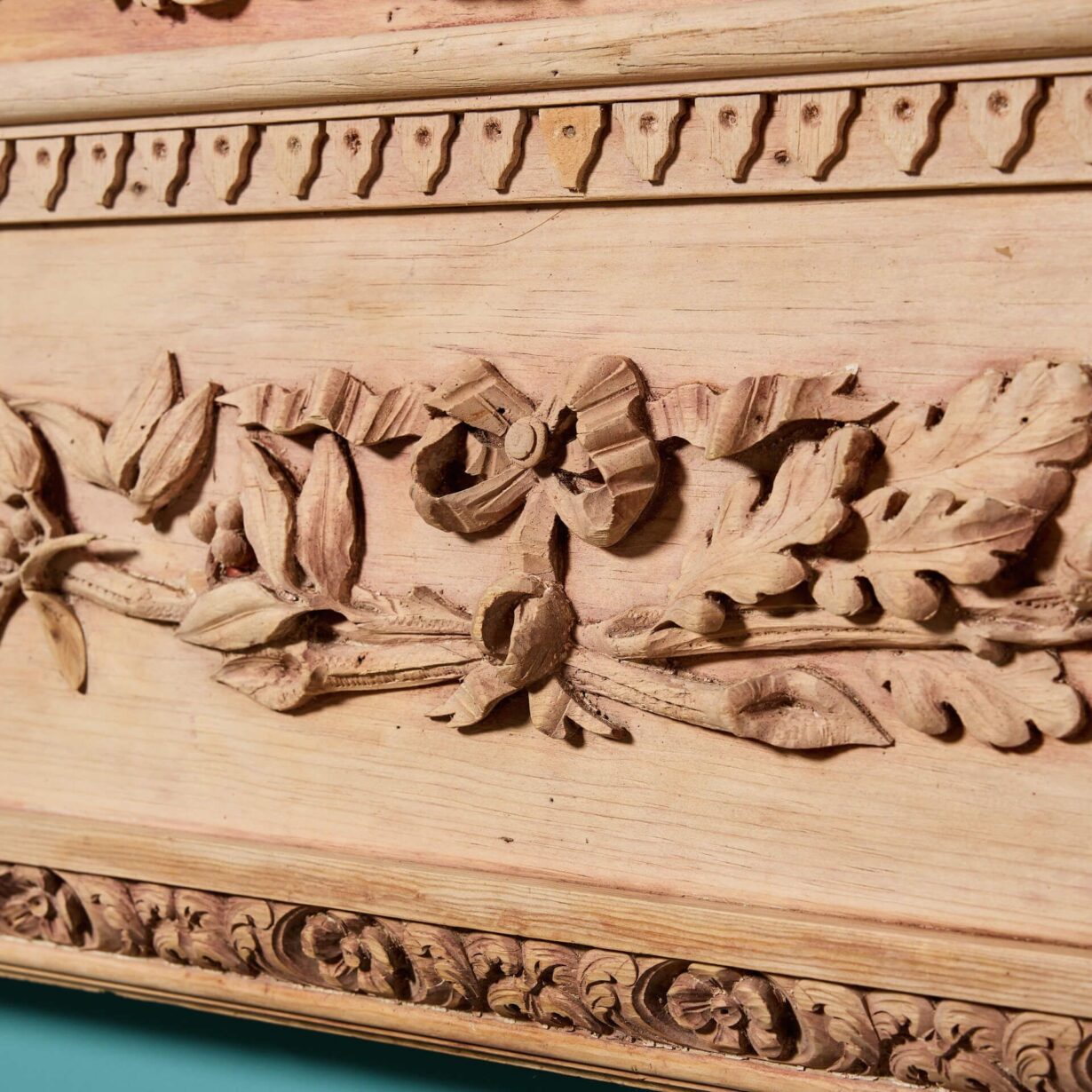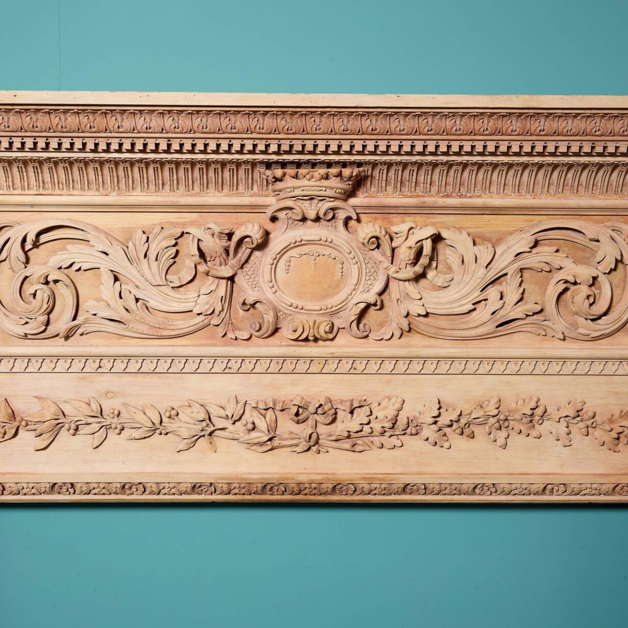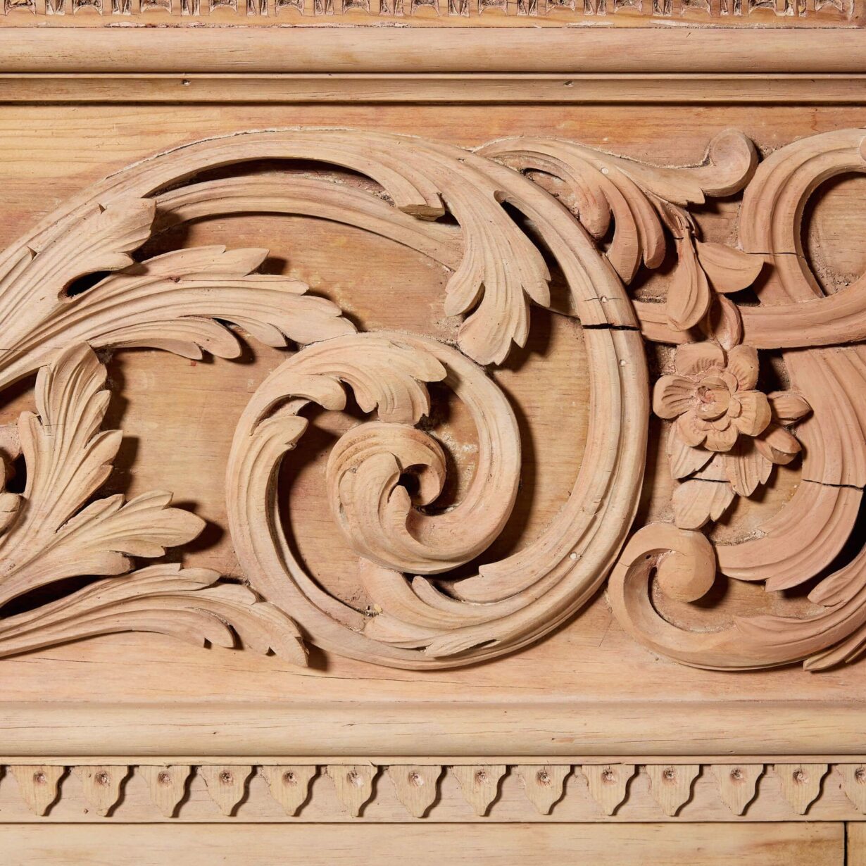 back to topAn impressive, large scale George III carved wooden chimneypiece, circa 1800. This spectacular antique fire surround is beautifully handcarved throughout, featuring acanthus leaf and dentils across a fluted pediment, above a deeply carved frieze of scrolling foliage, decorated with birds, spiral and leaf decoration.