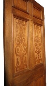 An antique oak door with marquetry panels to one side.