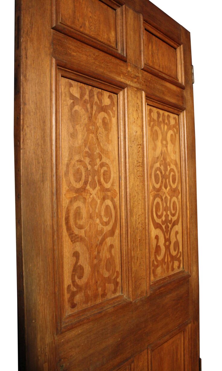 back to topAn antique oak door with marquetry panels to one side.