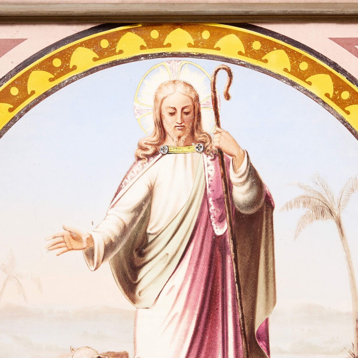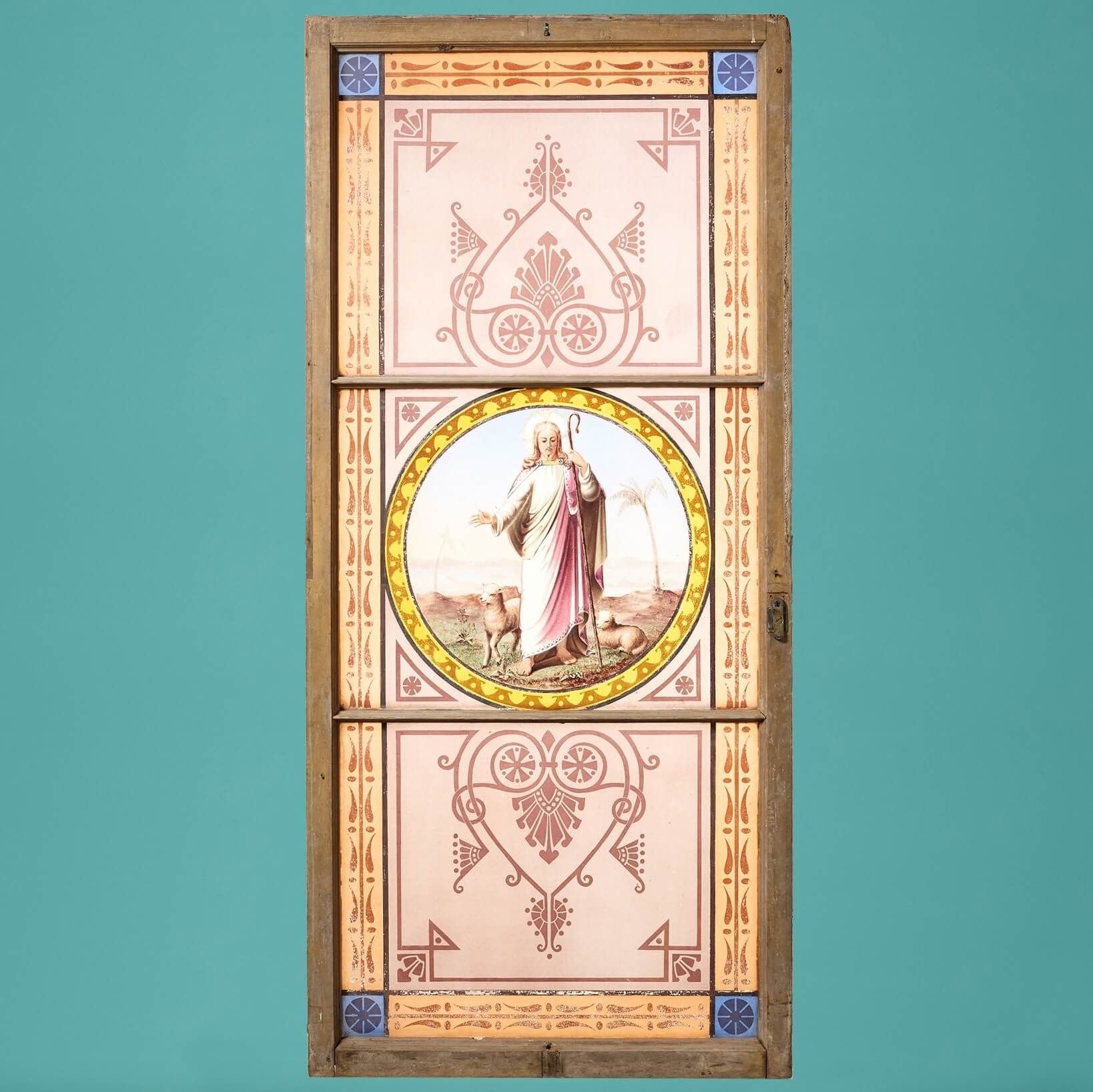 back to topAn impressive large scale religious stained glass window comprising of three hand painted glass panels fitted to a pine frame.
