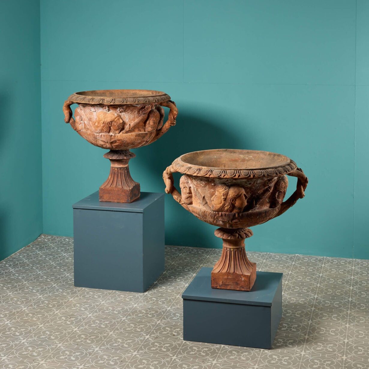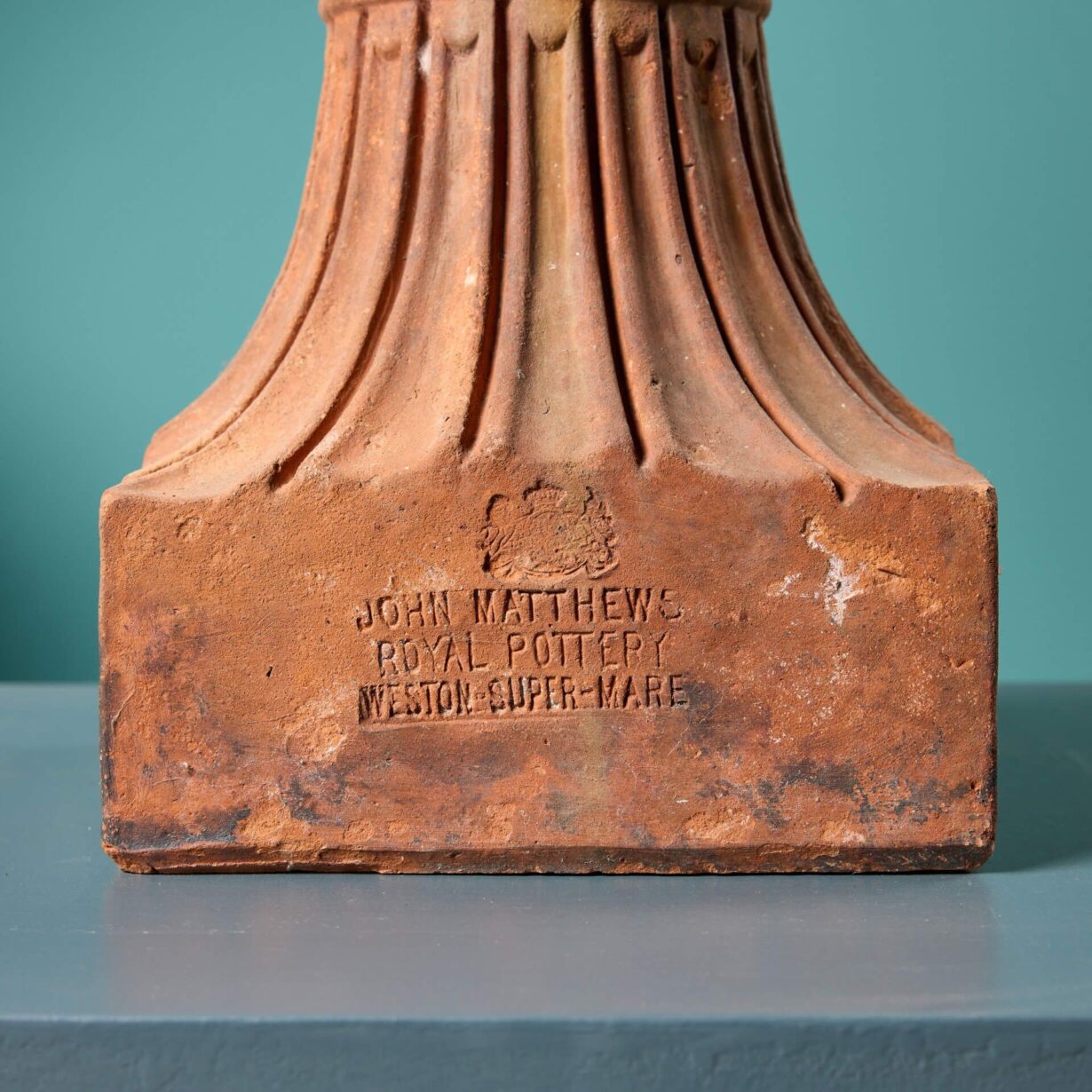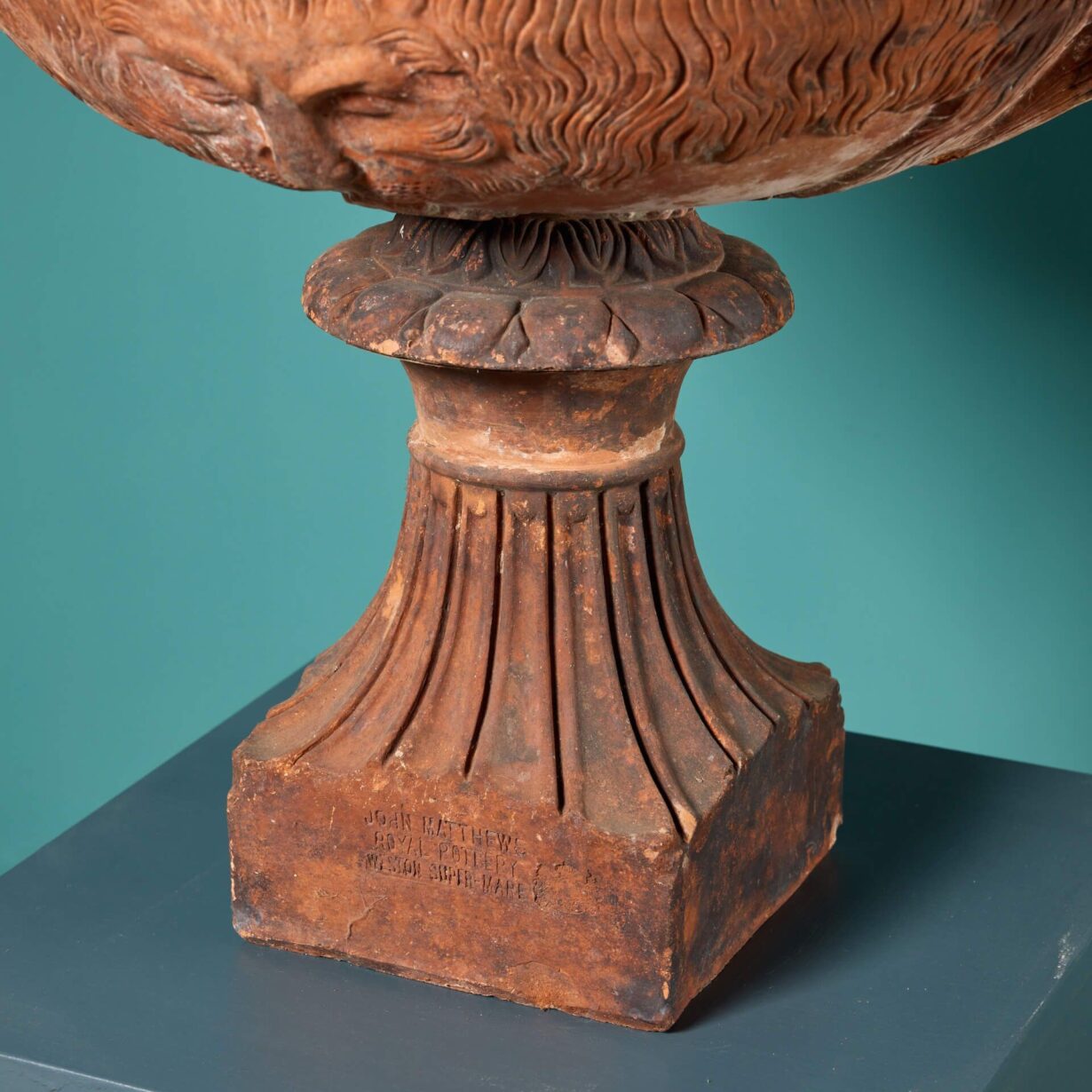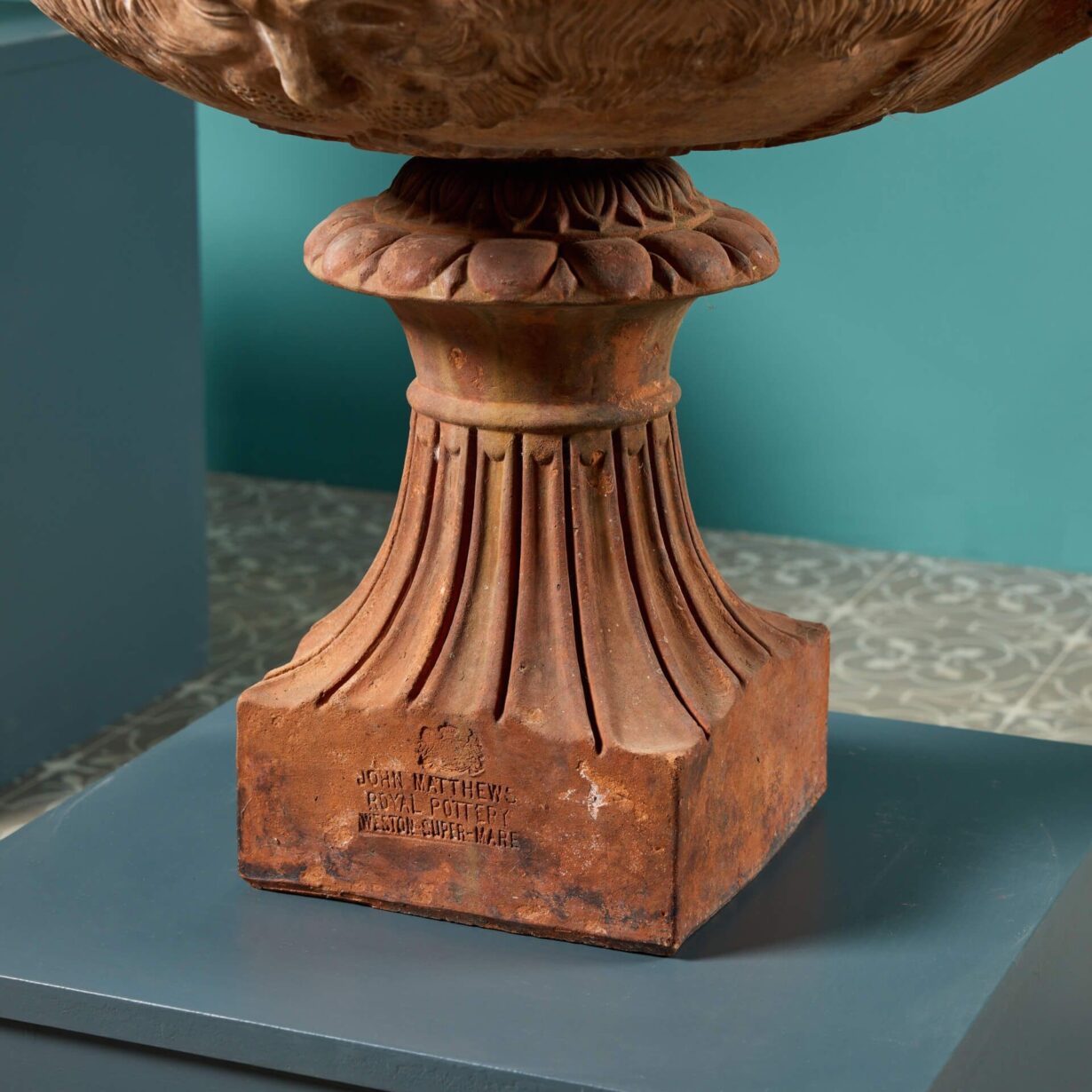back to topA very rare pair of antique terracotta Warwick vases circa 1880 with socles stamped ‘John Matthews Royal Pottery, Weston Super Mare’ and embellished with a royal crest. These 140-year-old garden vases have a lightly weathered appearance, making a characterful addition to any garden or interior.
