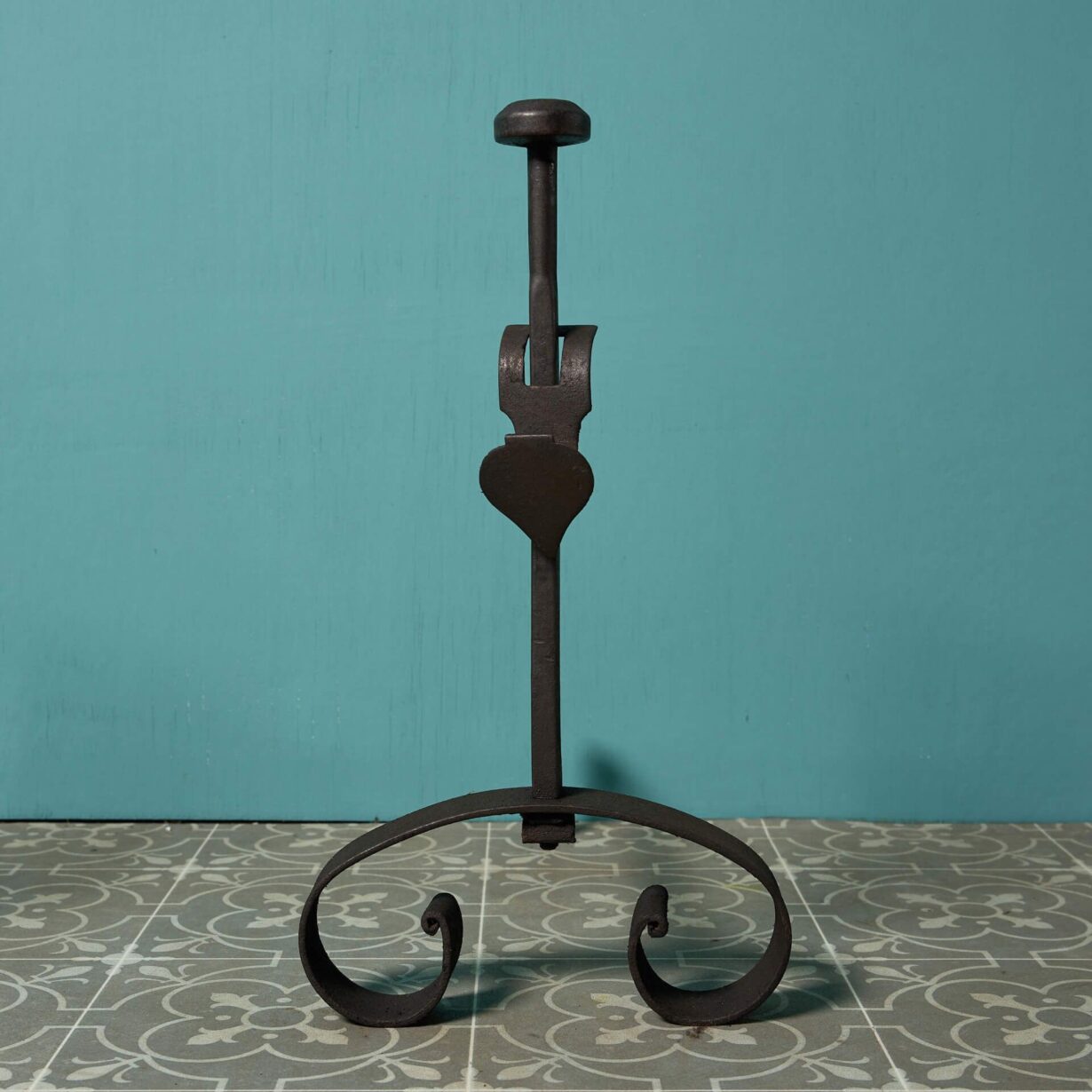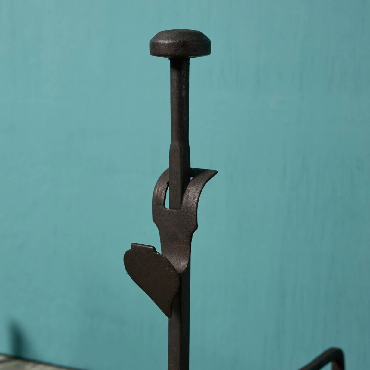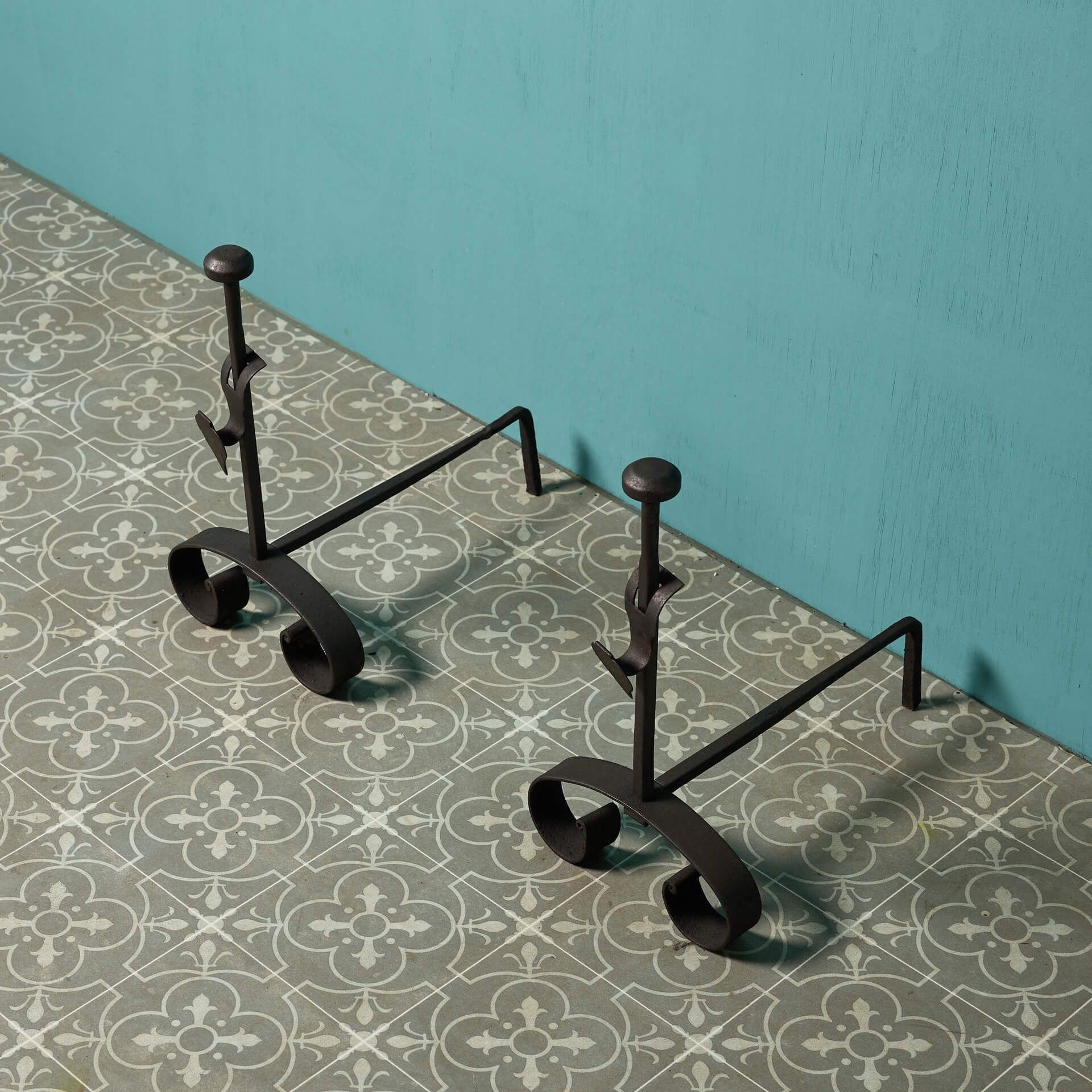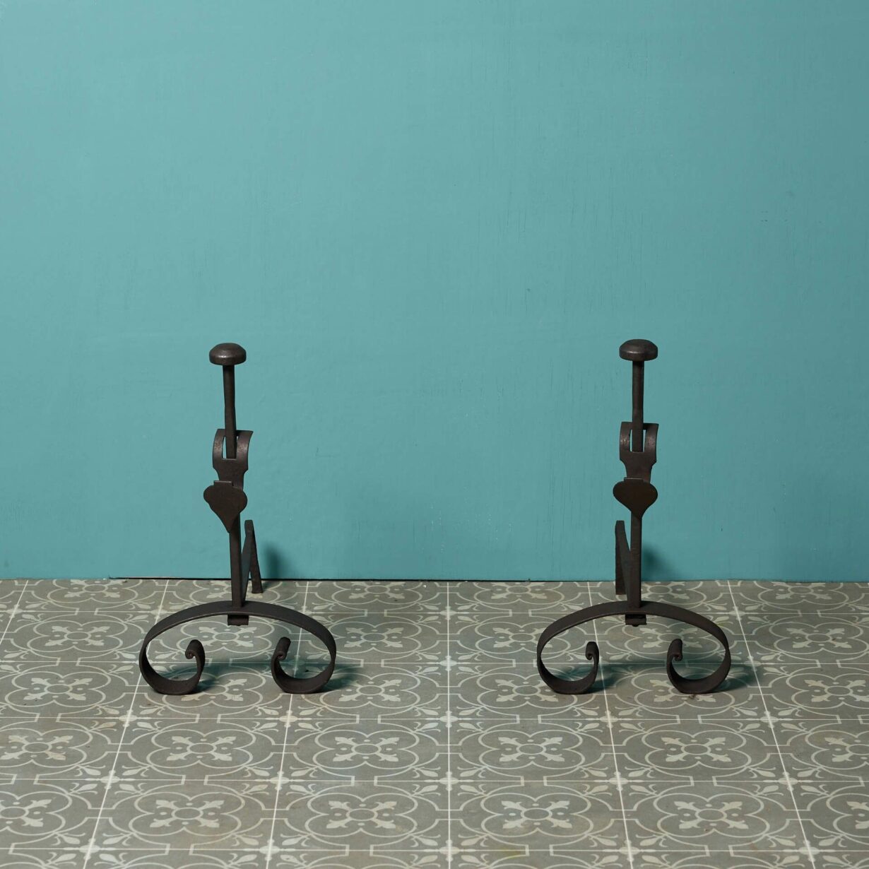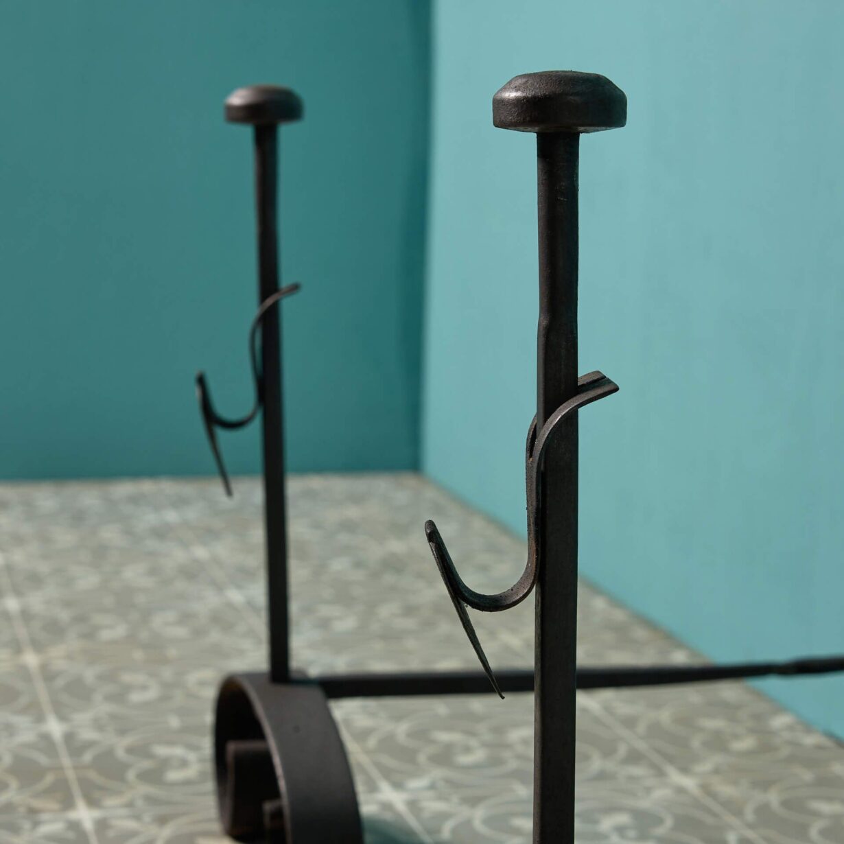 back to topA pair of antique wrought iron fire dogs. Dating to circa 1780, these French fire dogs have slender bodies and unusual scrollings arched legs.