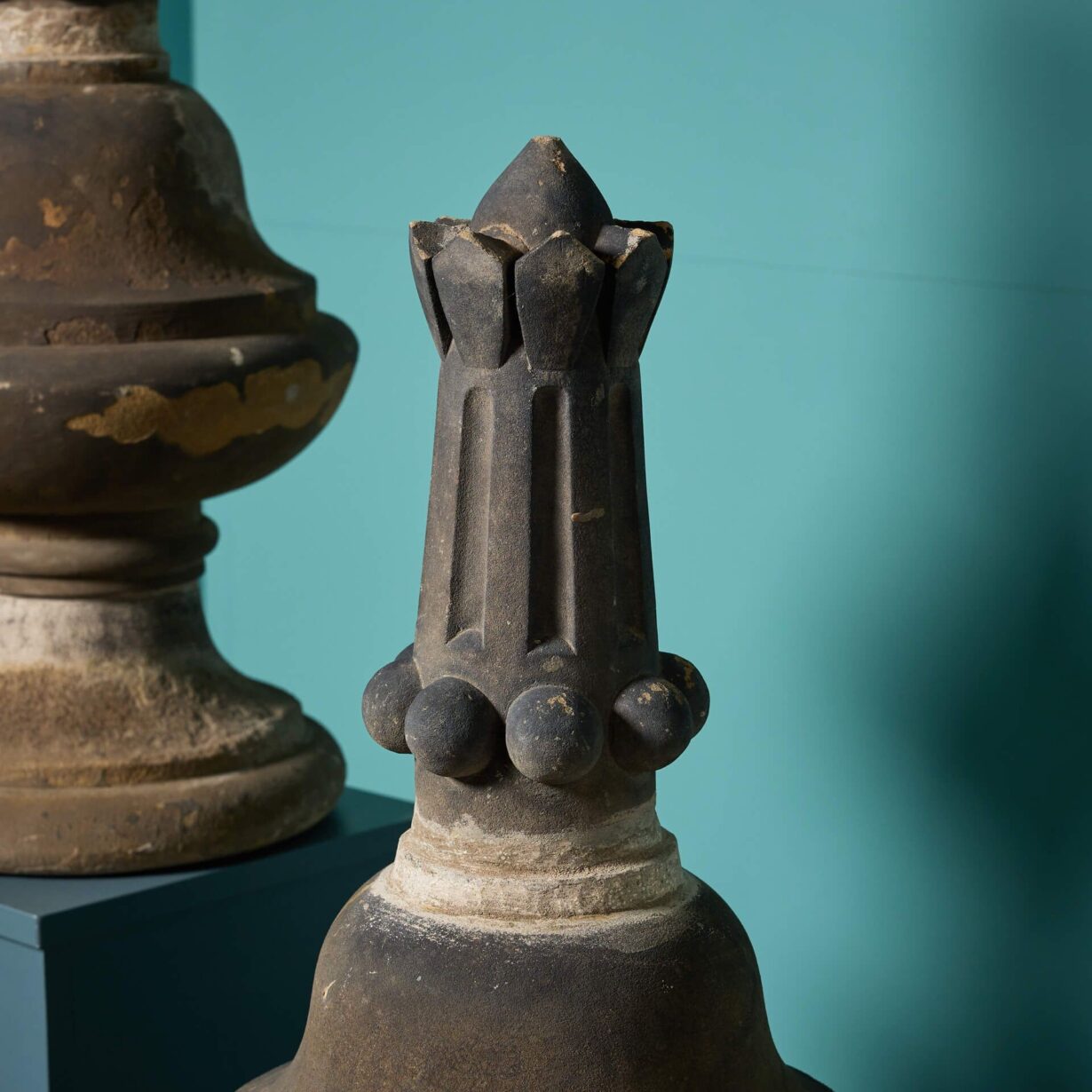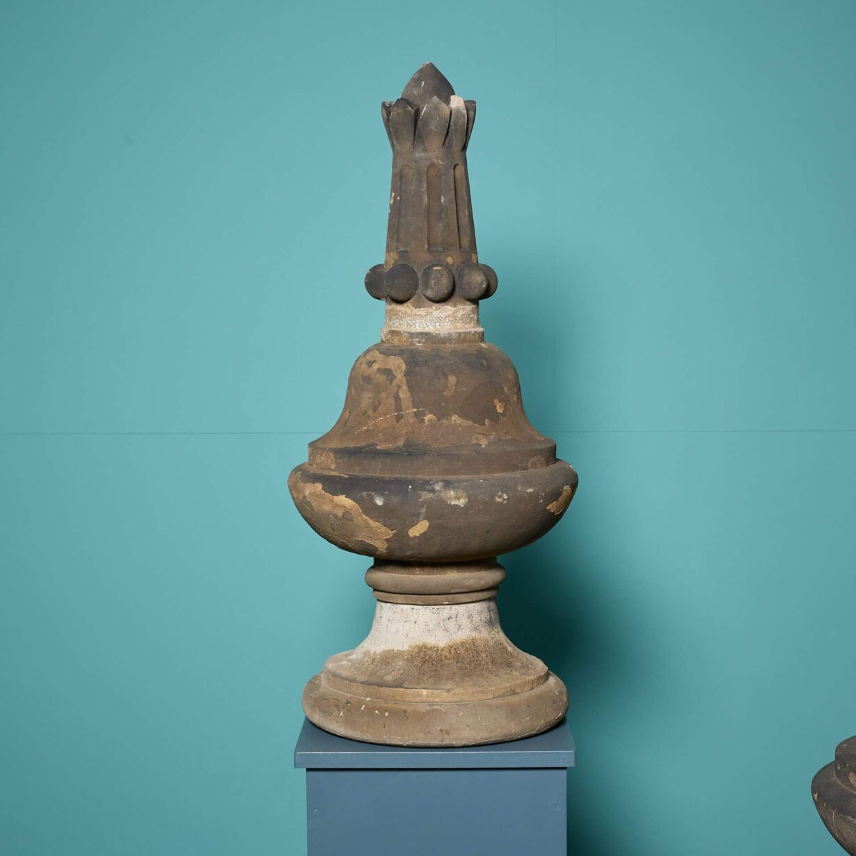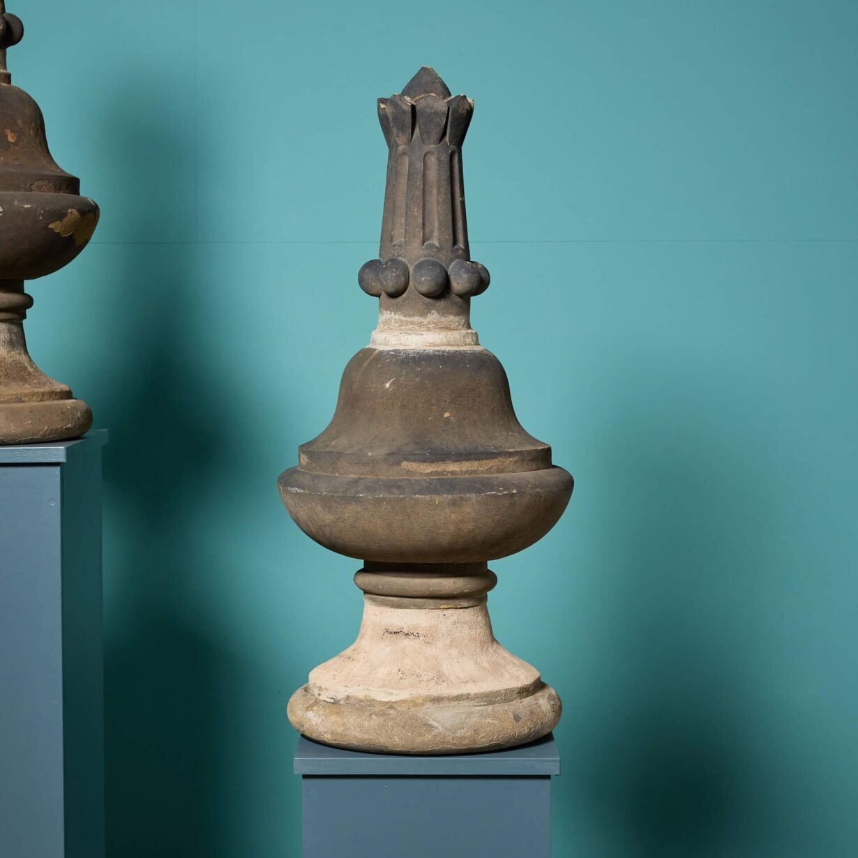 Each finial is of a matching design featuring a pointed top on a nicely shaped pedestal, weathered by exposure to the elements over many years.