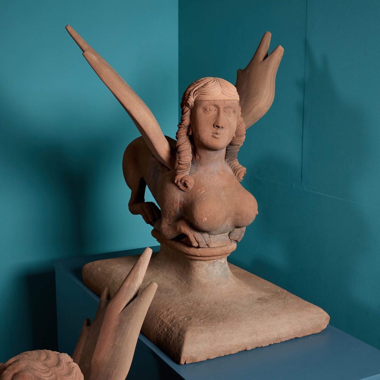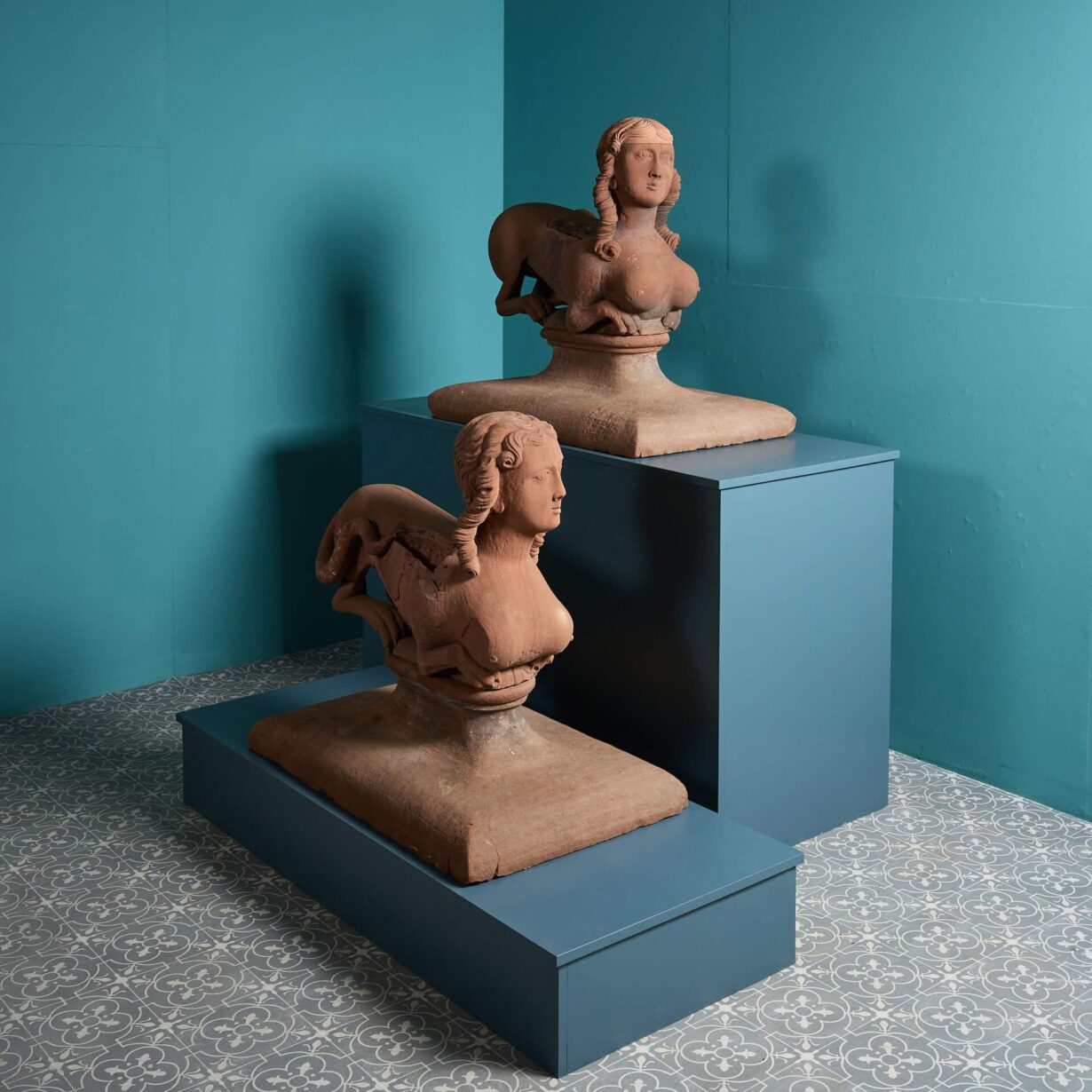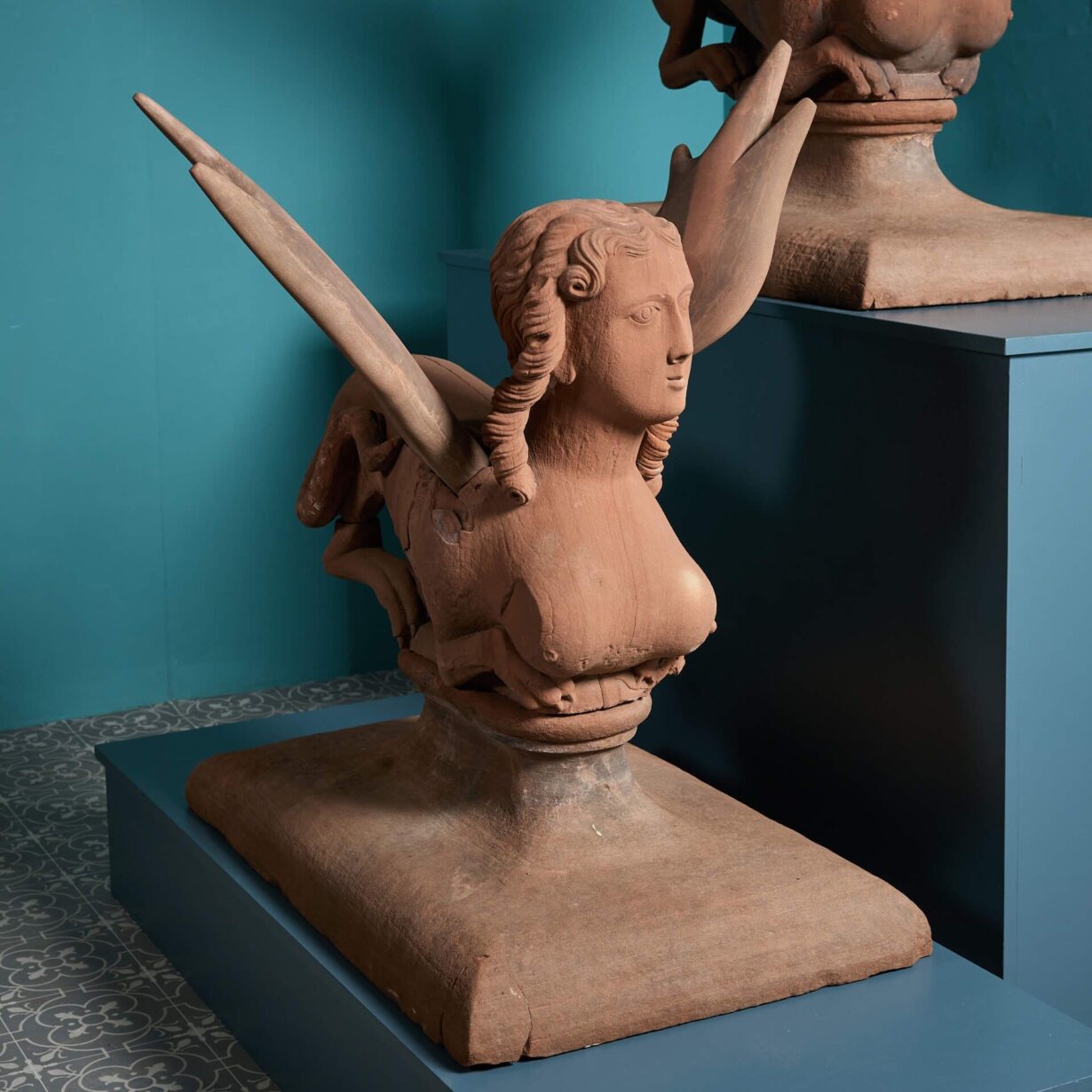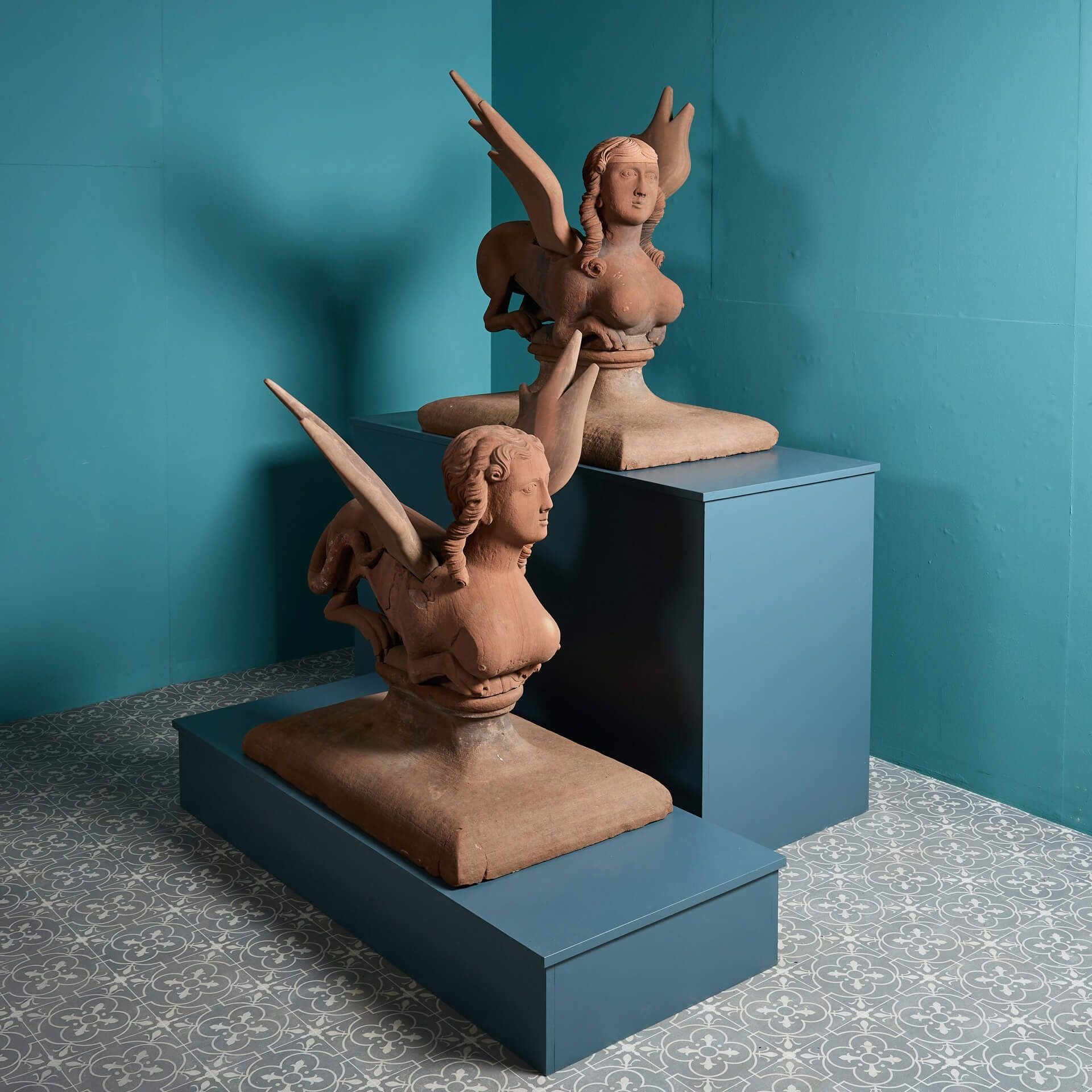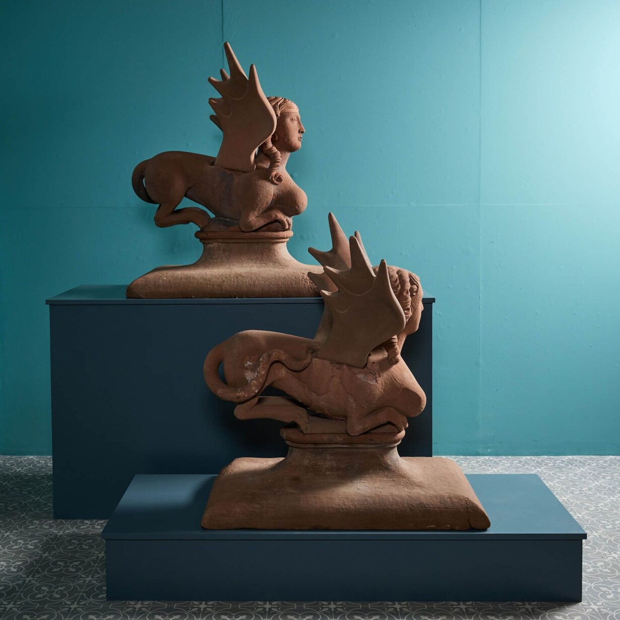 These antique winged sphinx statues date to the remodelling of the High Head Castle in 1744–48, thought to be by the renowned architect, James Gibbs (1682-1754). With their unusual forms, huge scale and unique provenance, they are a spectacular feature for any garden with their mythical forms, resembling winged creatures with human heads from stories of legend! If desired, the wings detach.