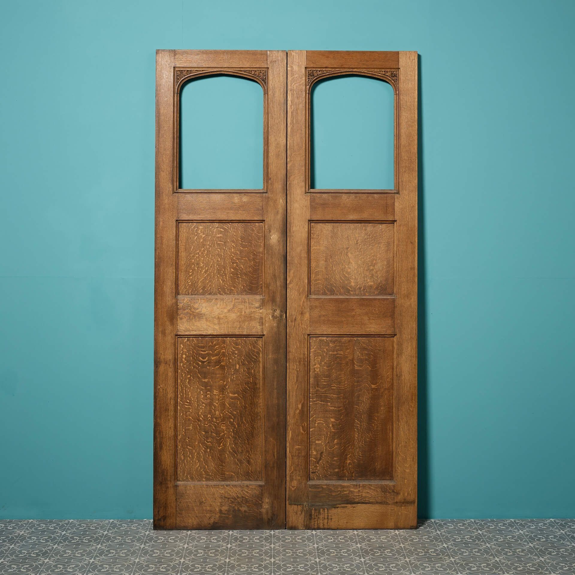 back to topAn unglazed set of Victorian era oak doors reclaimed from a chapel in Derbyshire. Dating from the late 19th century, these antique double doors are steeped in history and will make a heritage feature of any property. Suitable for interior and exterior use, the each panelled oak door has an unglazed arched pane for glass to the top with hand carved floral spandrels to each corner.