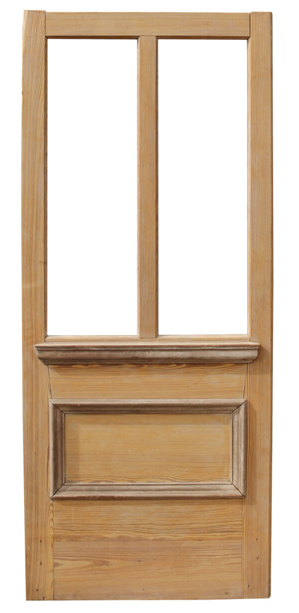 A reclaimed exterior door made from pine, with two spaces for glazing.