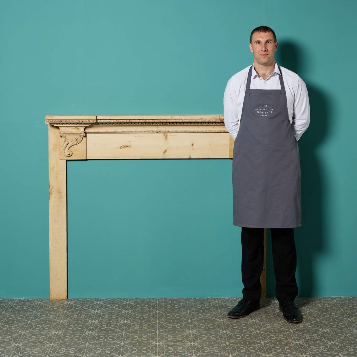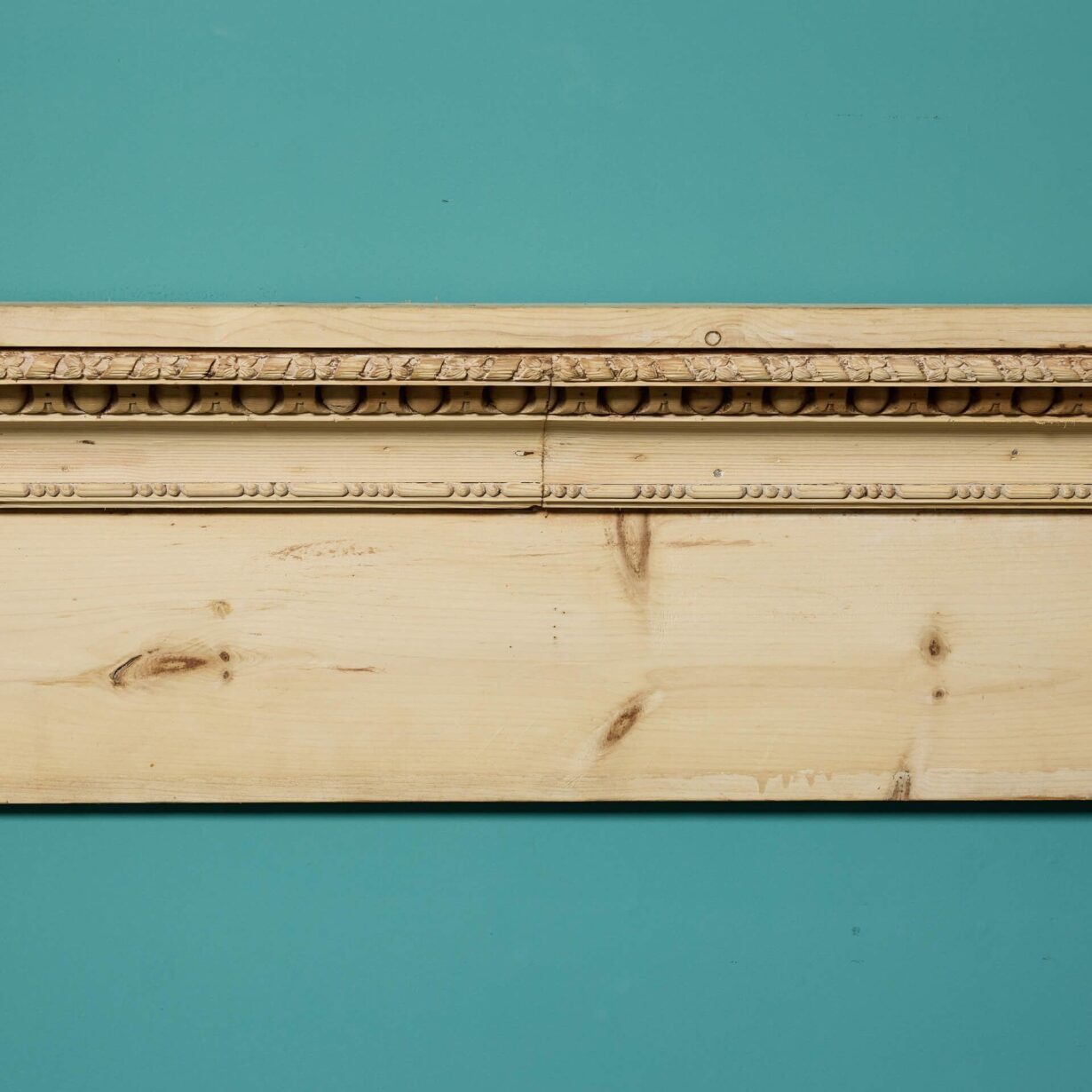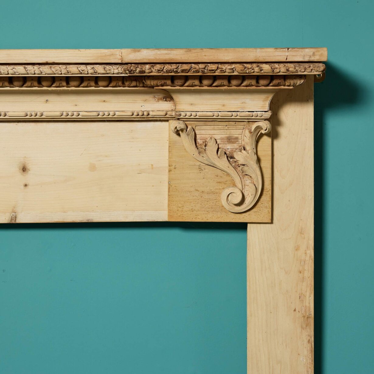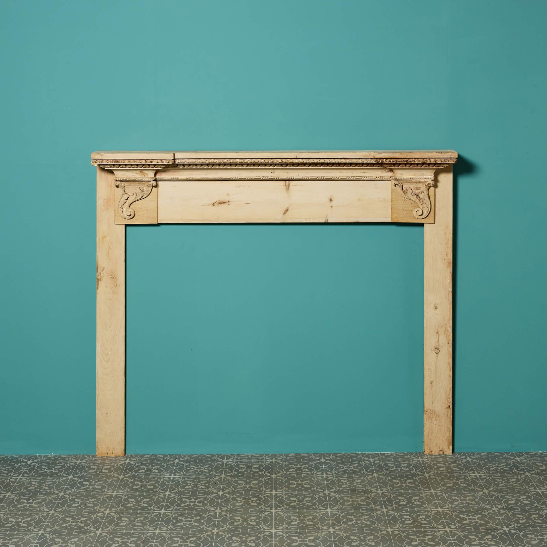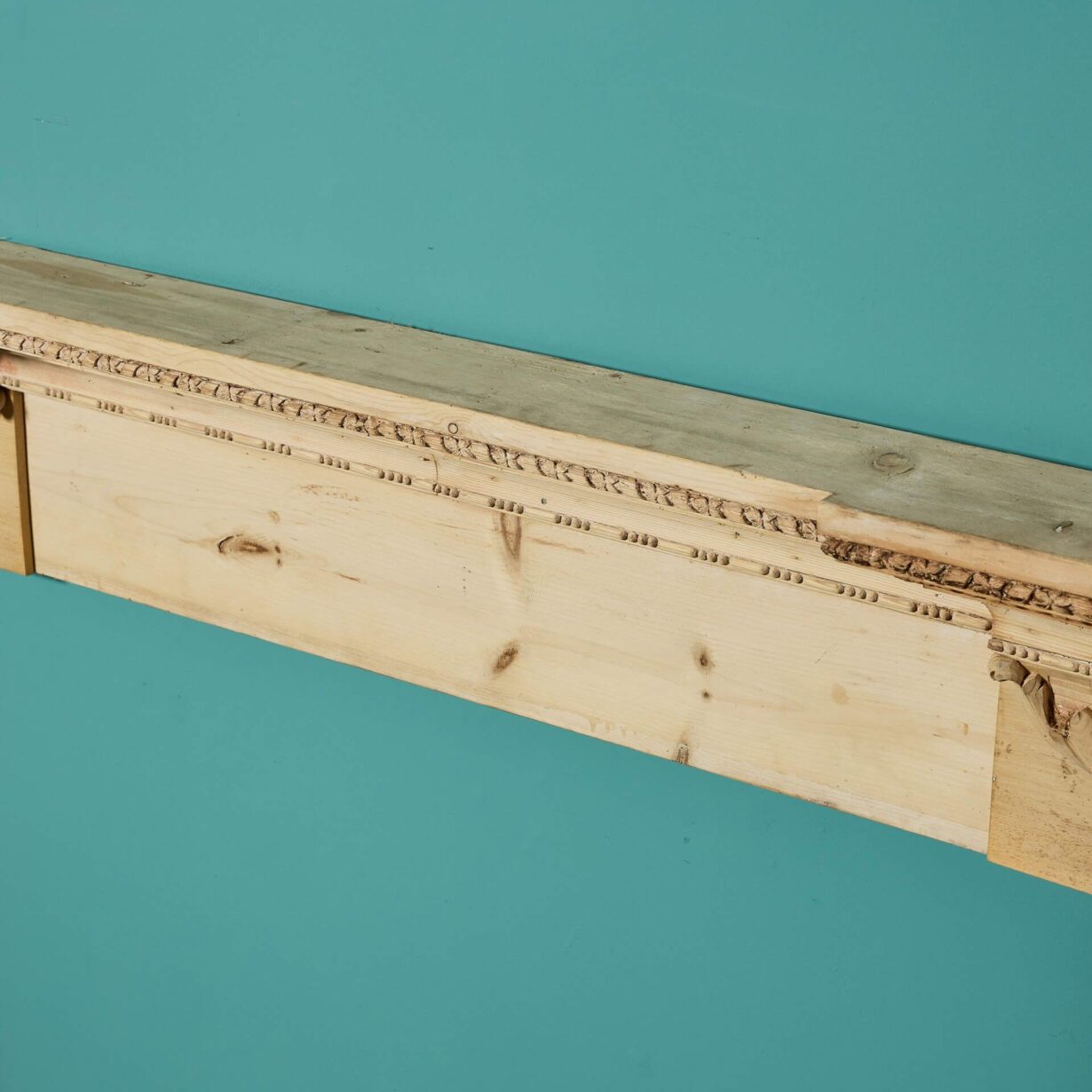 back to topA good quality antique carved pine fire surround, reclaimed from a property in Surrey, UK. This simple fireplace is an elegant addition to any interior with its stripped pine finish – ready for application of stain, paint or wax – and understated design. The end blocks are carved with scrolling foliage below reel and bead, egg and dart and floral carving below the shelf.