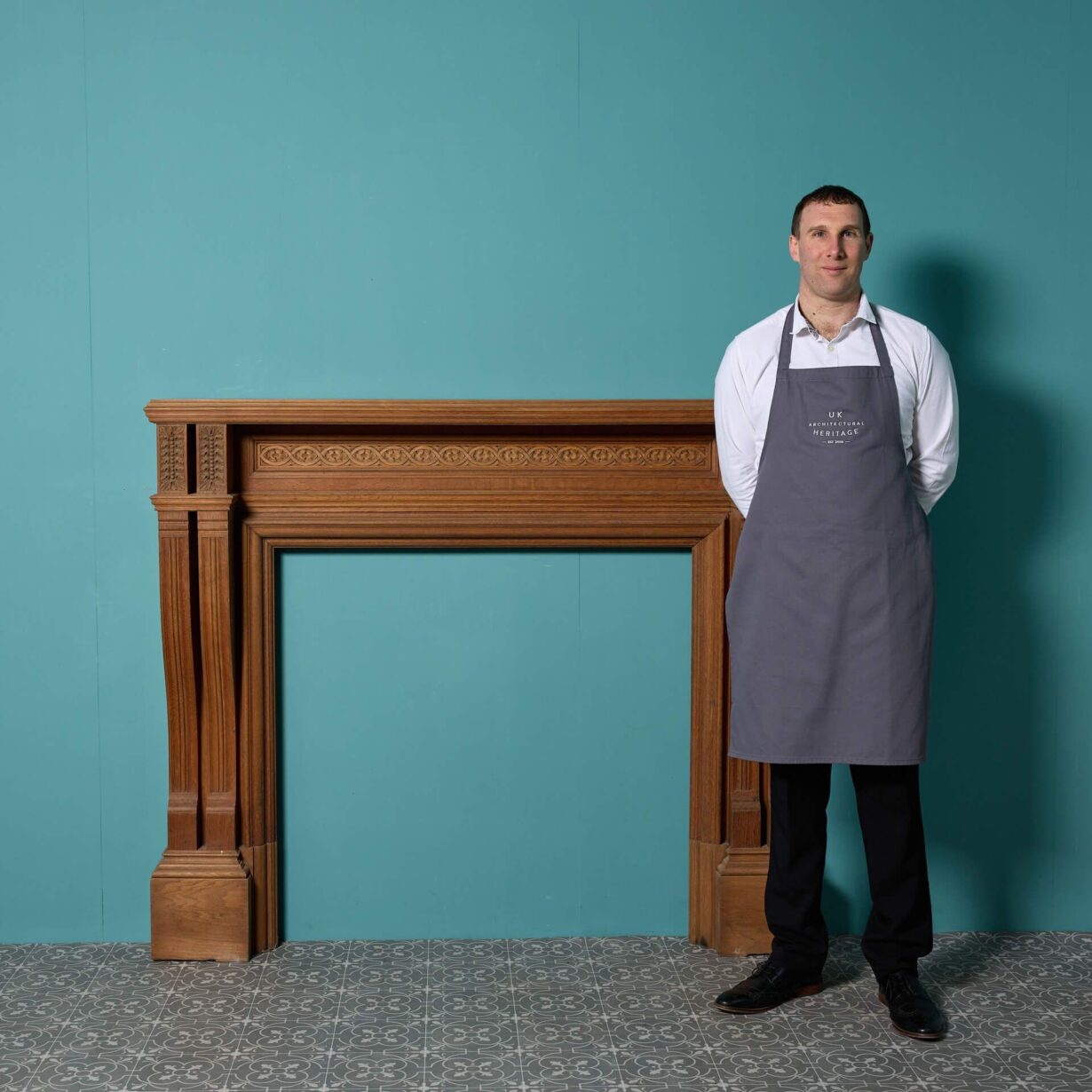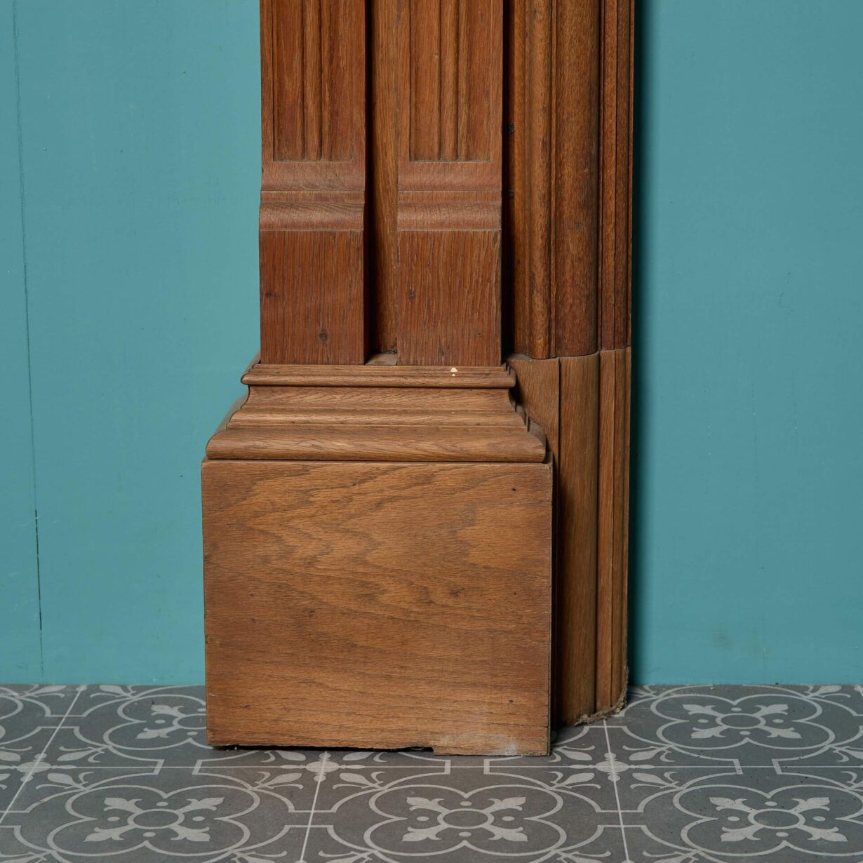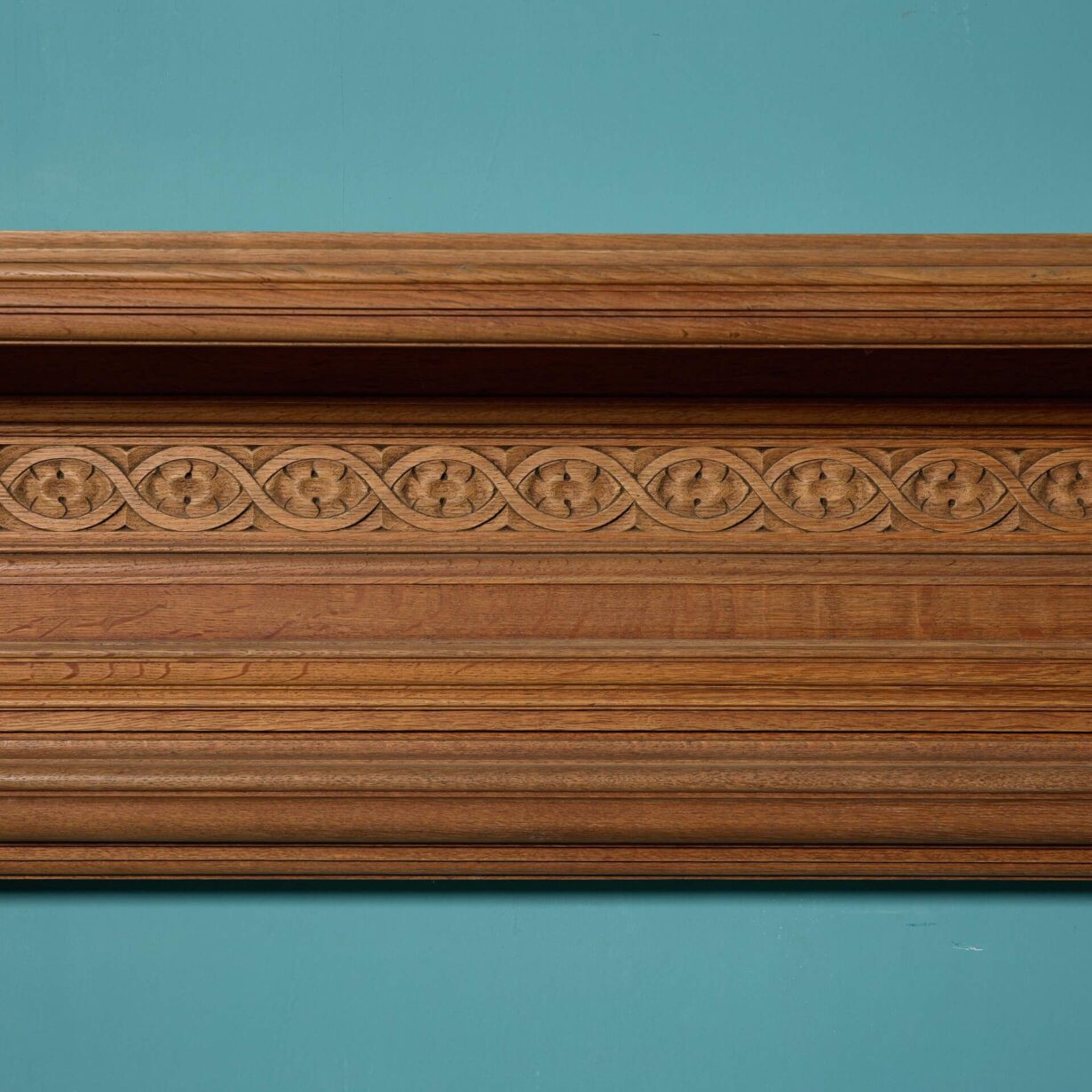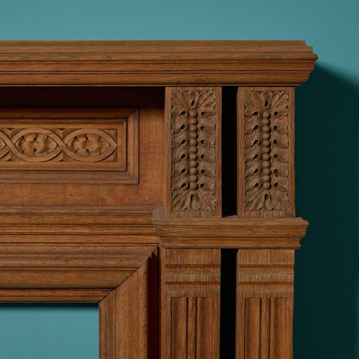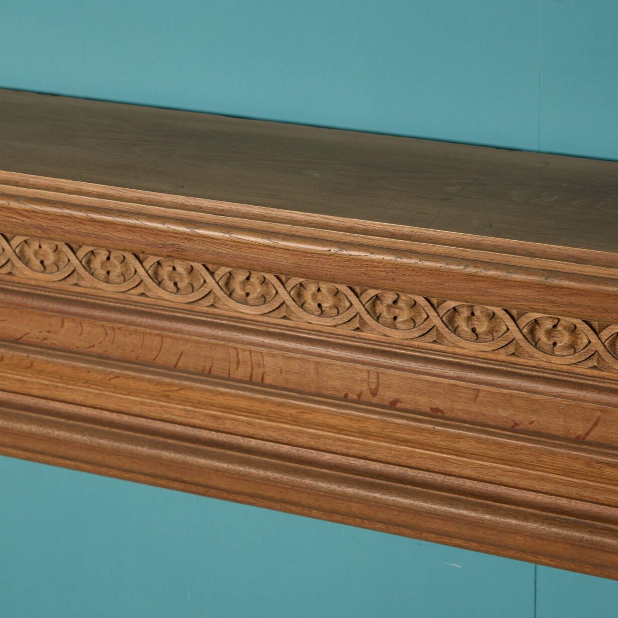 back to topA handsome antique English oak fire surround, salvaged from a house in Exeter. Although this fire surround dates from the late 19th century, the warm wood colour of the oak alongside its simple design makes this fireplace a timeless feature for any setting. Look closely and you’ll see it’s beautifully carved with a repeating pattern across the frieze and a pair of leaf and berry embellishments to each end block.