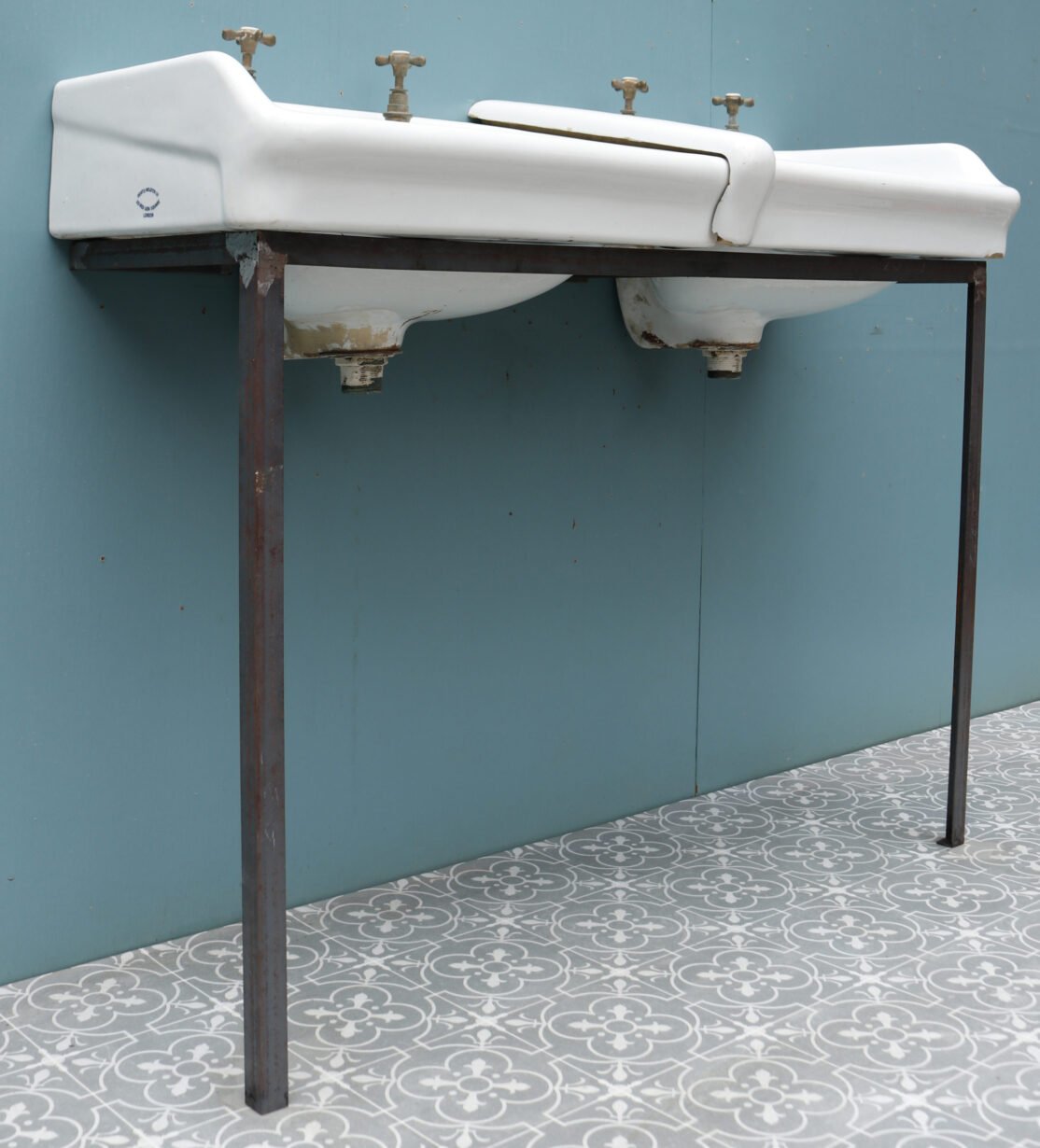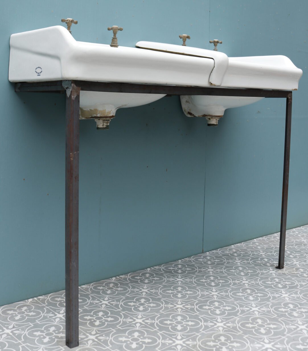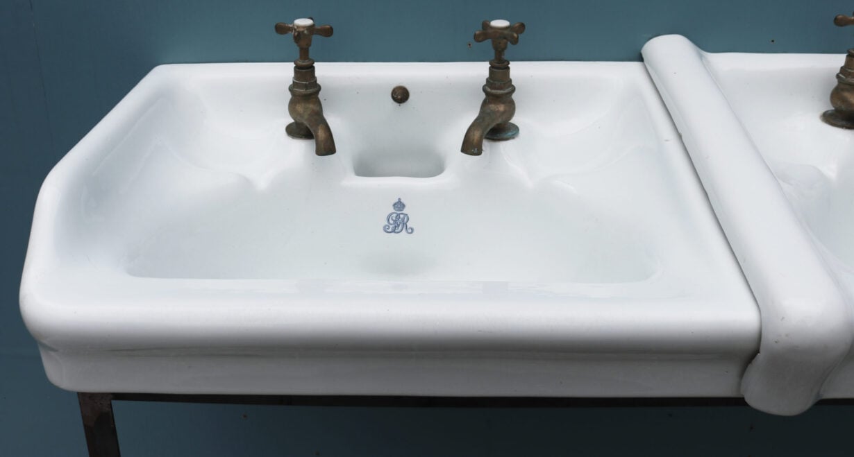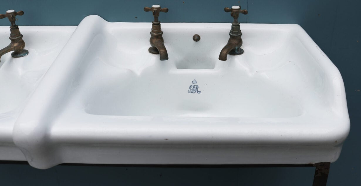 The basins are stamped with the monogram of King George V, suggesting they were removed from a government building. Supplied with a modern steel stand.