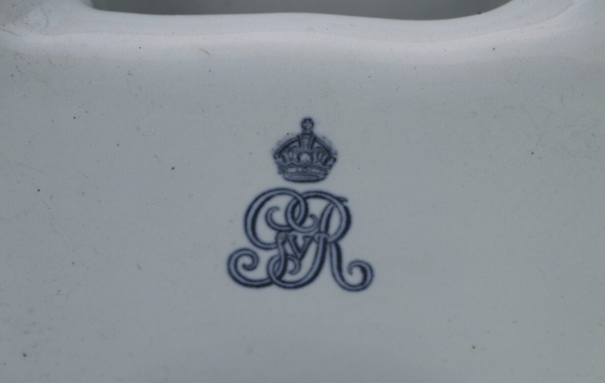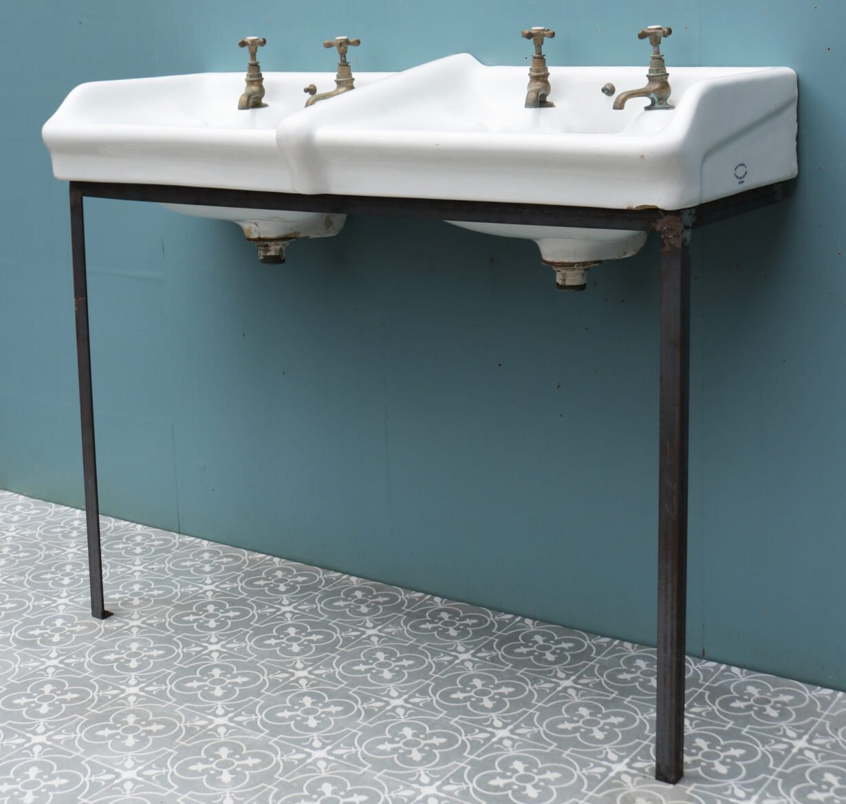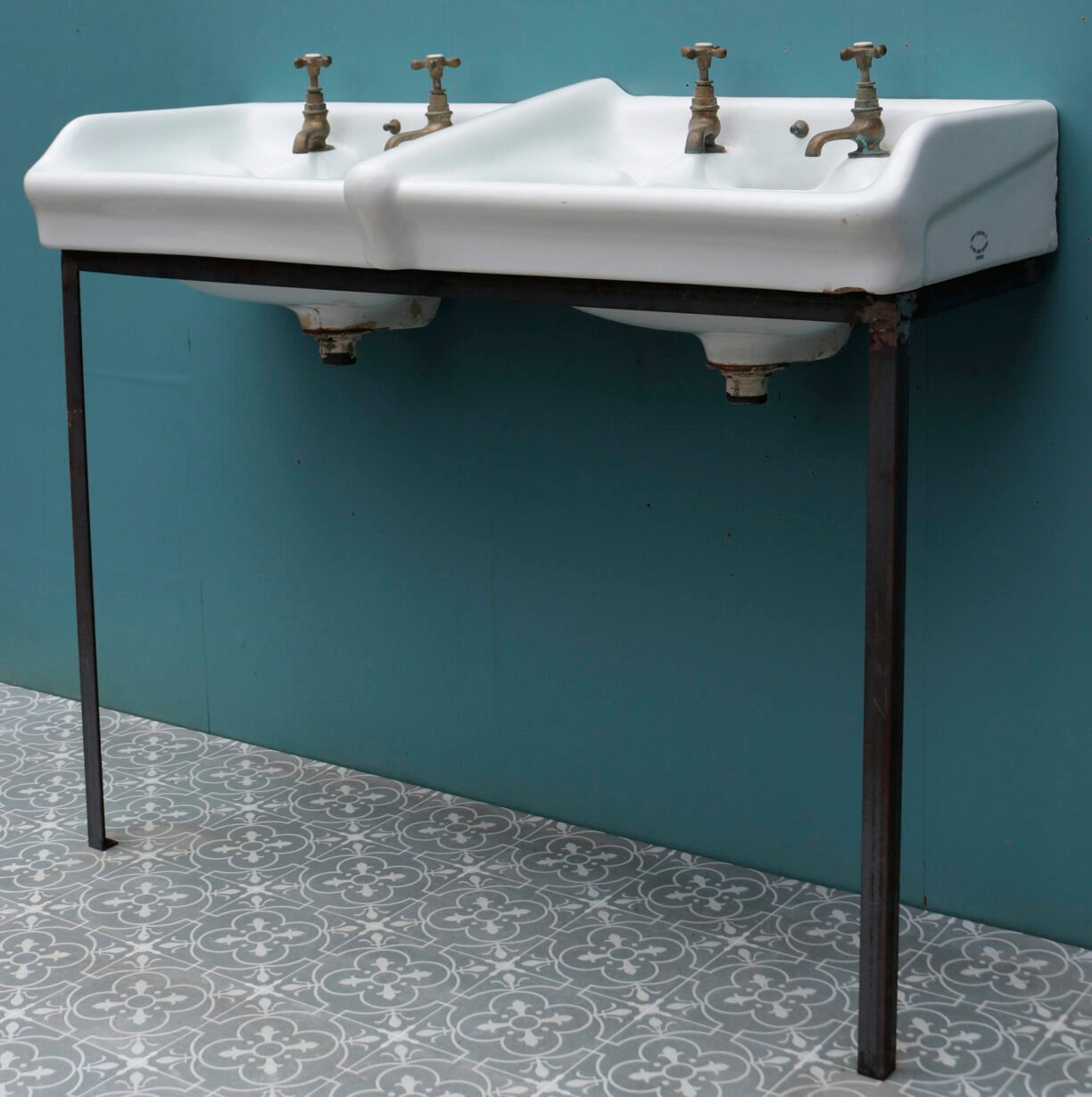 The basins are stamped with the monogram of King George V, suggesting they were removed from a government building. Supplied with a modern steel stand.