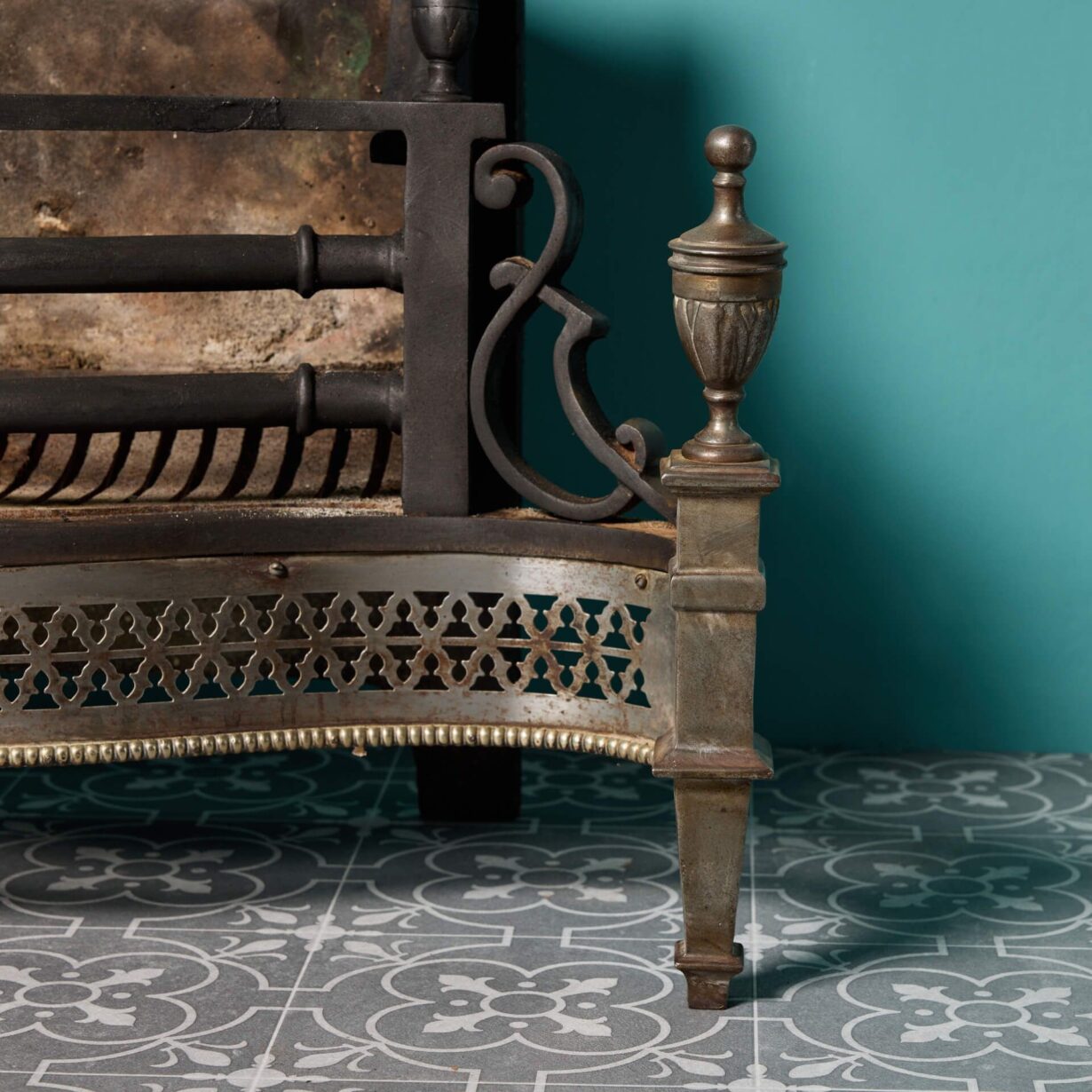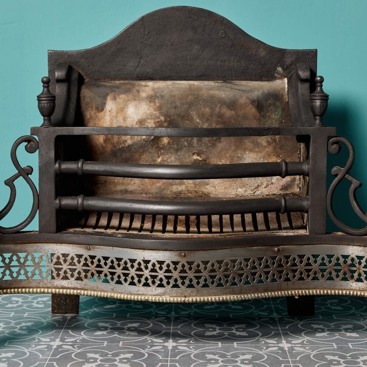 back to topA reclaimed Georgian style cast iron fire grate with pierced fret and urn finials. Dating from the early 20th century, this antique fire grate has stood the test of time, adding grandeur to fireplaces traditional and modern alike.