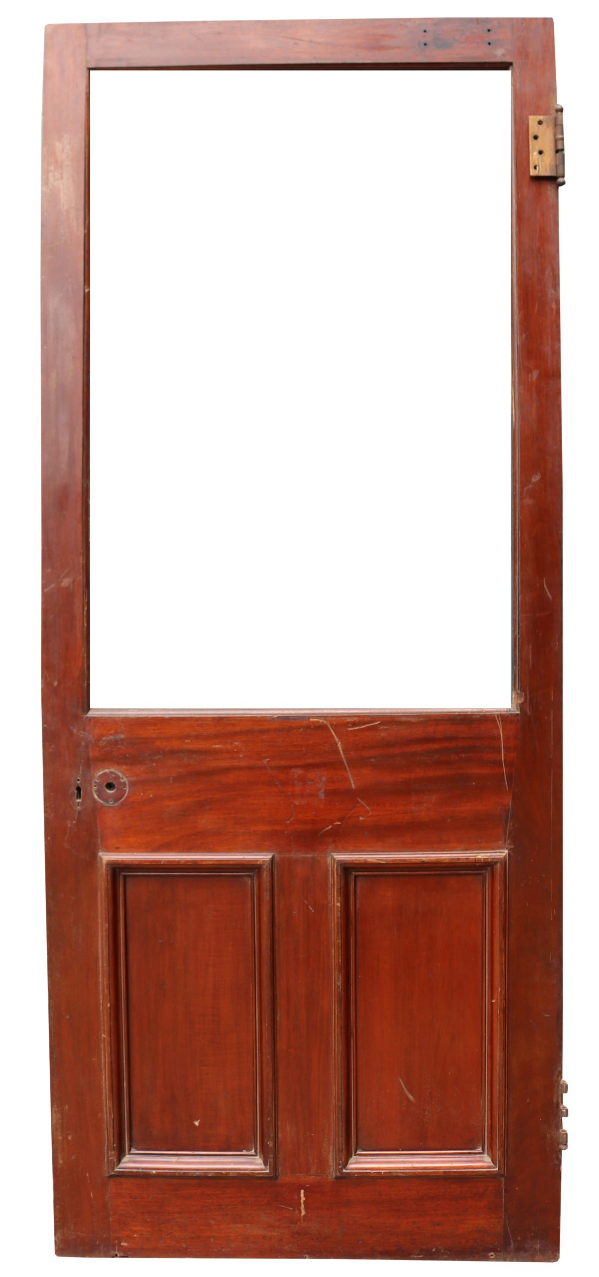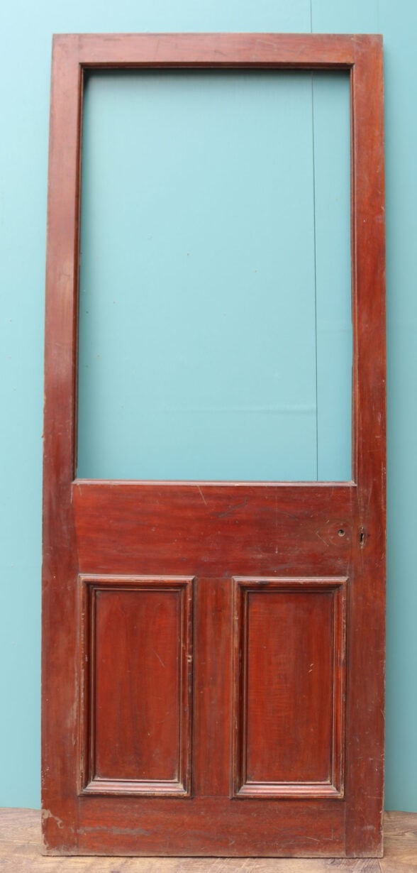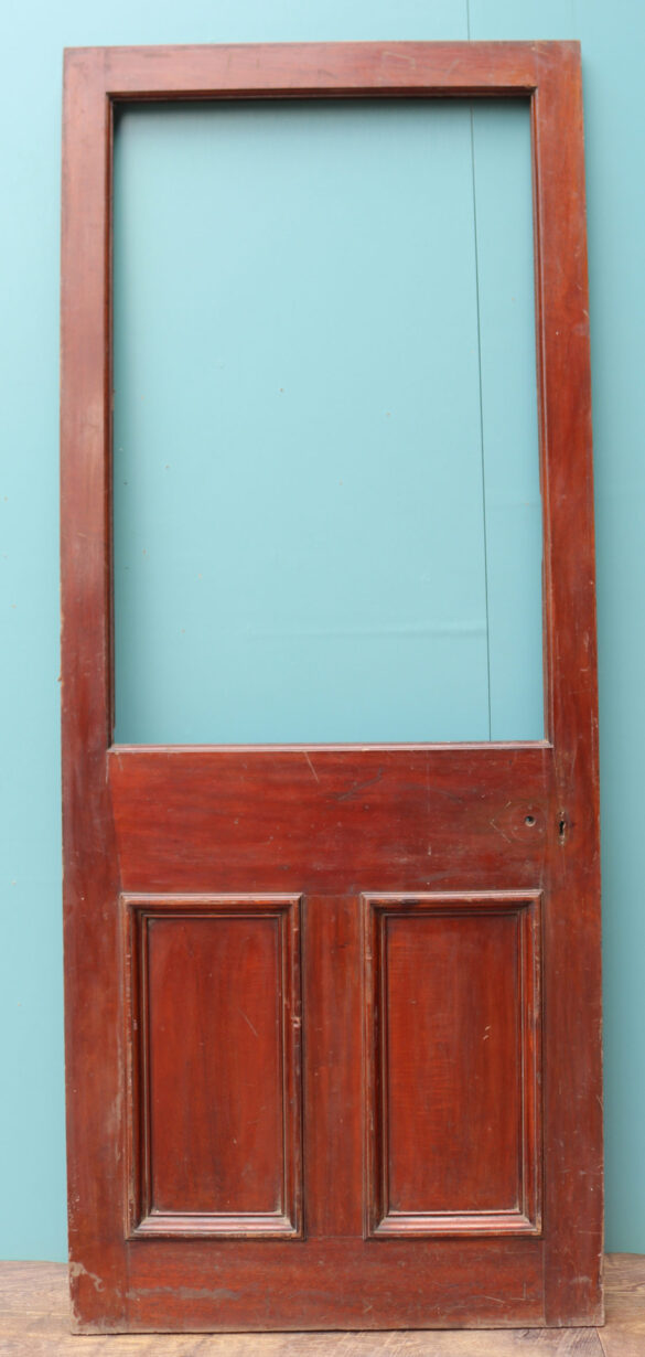 A reclaimed door constructed from mahogany, with space for a glazed panel.