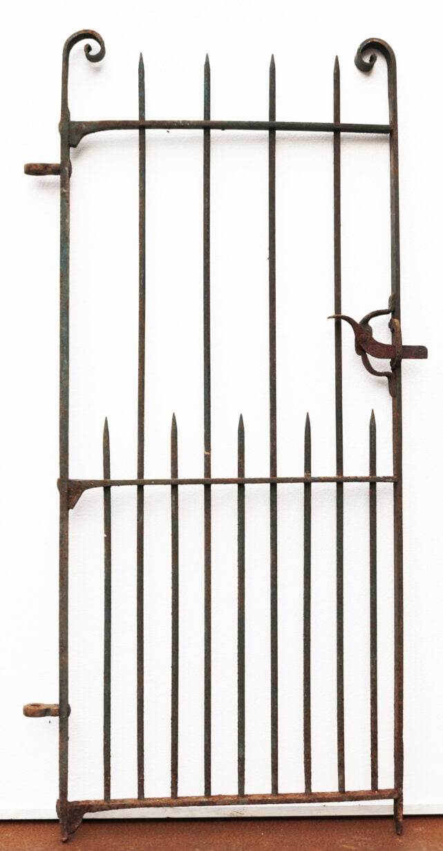 A salvaged wrought iron side gate with scroll finials and working latch. Additional Dimensions For an opening of approximately 77 cm
