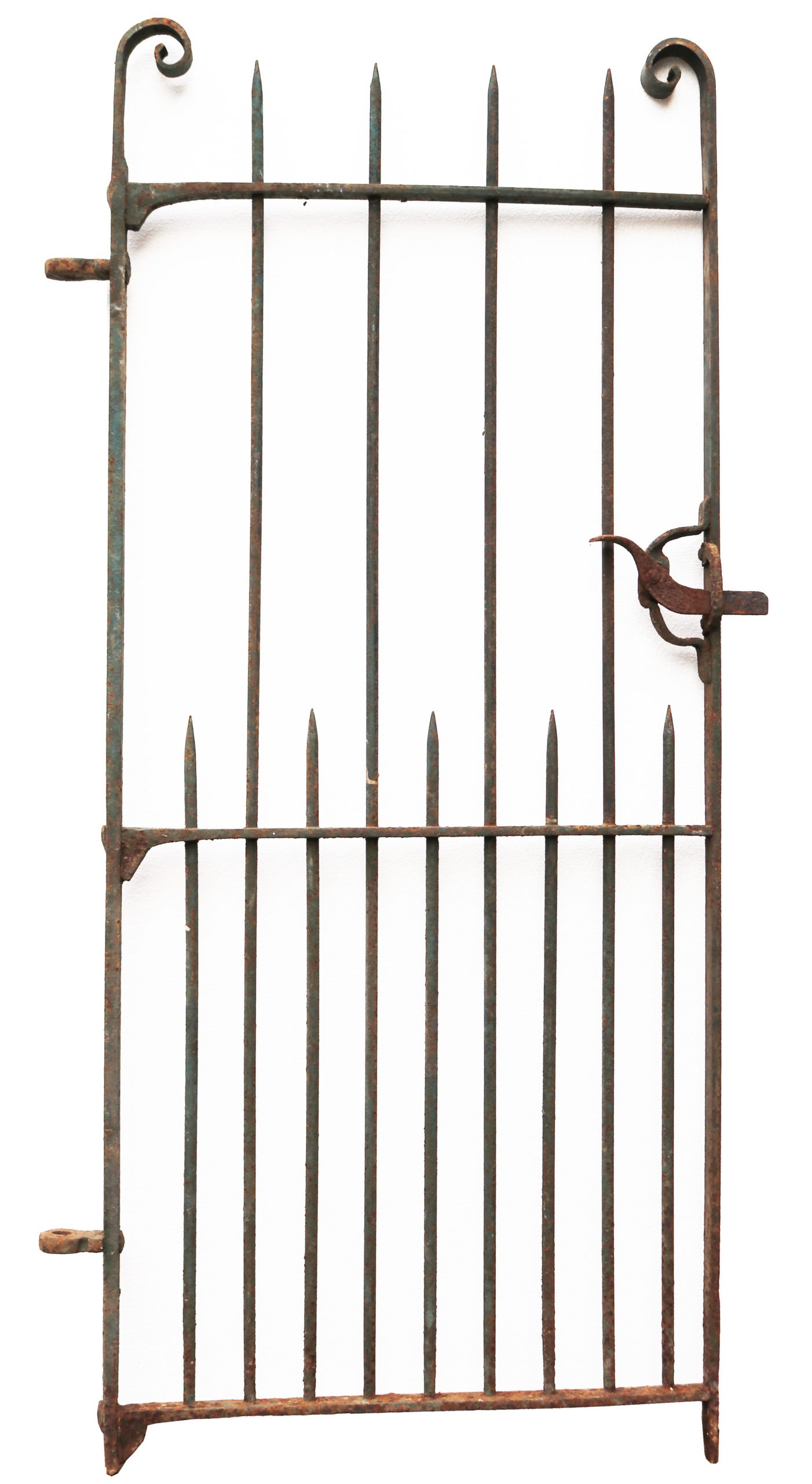 back to topA salvaged wrought iron side gate with scroll finials and working latch.